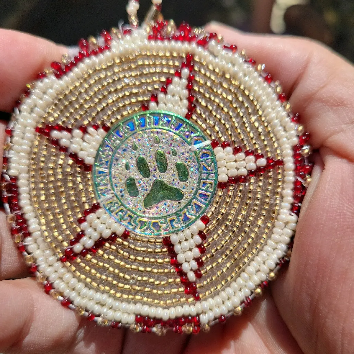 The medallion is handmade, which means that each piece is unique and has a personal touch. The medallion allowing is comfortable for the wearer. The Medallion is designed to fit on the any necklace. i can also make a beaded necklace for it if u message me.