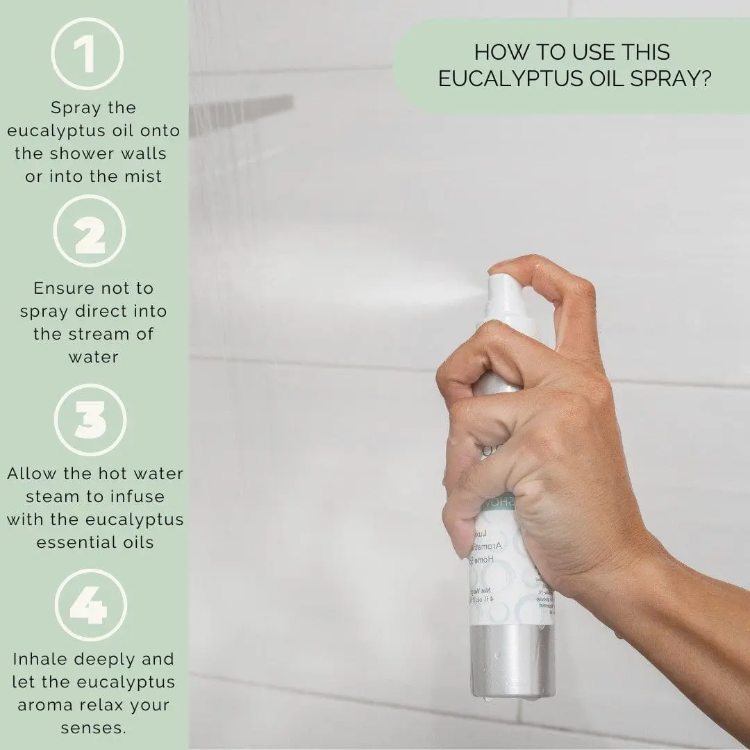 Eucalyptus Shower Spray Mist makes my shower smell wonderful. It is strong, carries lightly on the air, and is prone to get into your eyes, so be careful (1 star off). I suggest spraying lower to the ground. It is slow to dissipate and only lasts a few minutes.