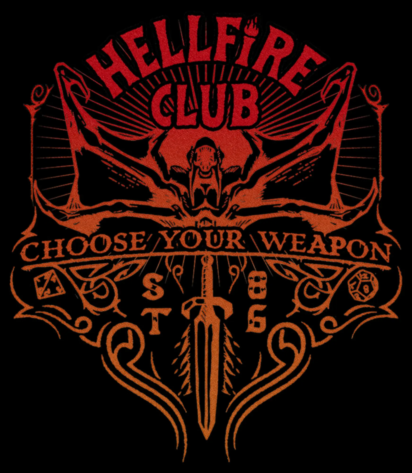 Turn your world upside down with this officially licensed Stranger Things Season 4 Men's Graphic T-Shirt! Your favorite 1980s-inspired Netflix television series is taking you back to Hawkins, Indiana to fight the evil creature, Vecna, who is terrorizing Max and other traumatized members of the town! Blast your favorite song and wear this awesome tee to fight the curse of Vecna today. This men's tee is inspired by the iconic Hellfire Club showcasing dice, a sword, the phrase "choose your weapon" along with the terrifying flying creature, the Demobat!