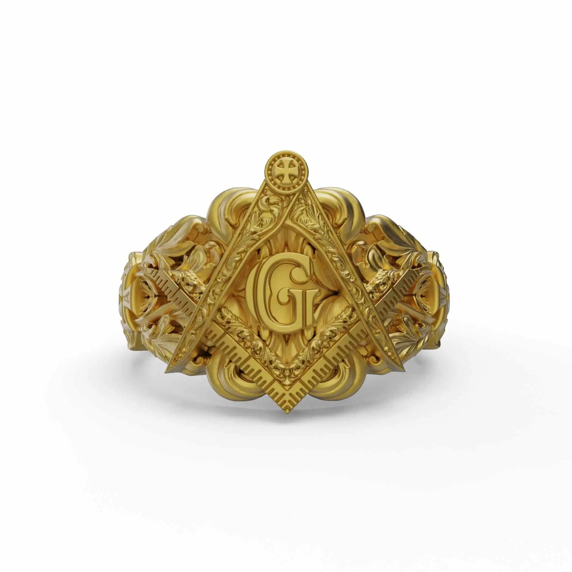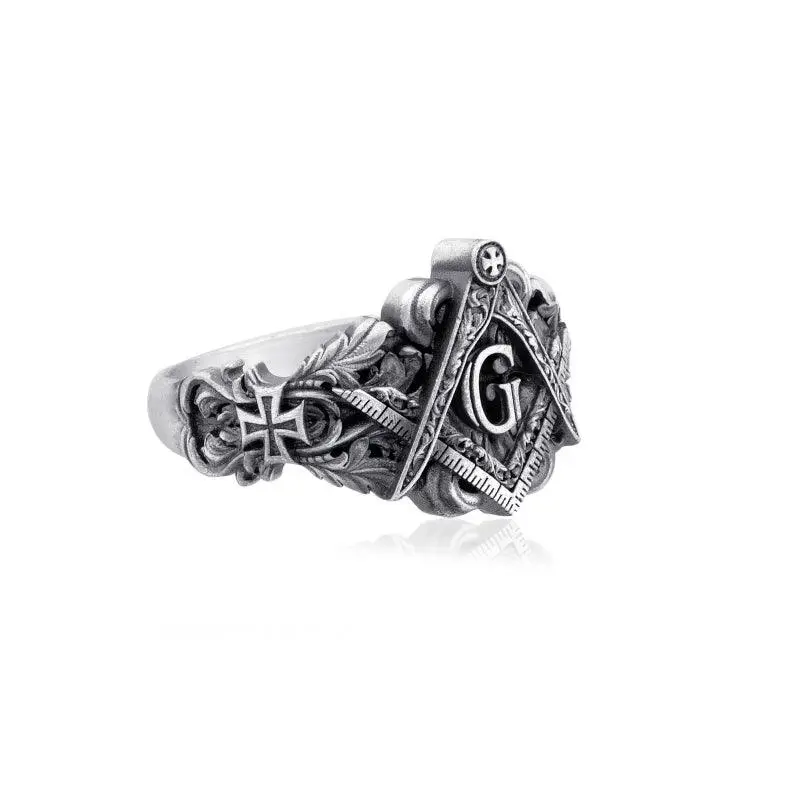 This Freemason Ring from Theswaf is a robust tribute to the storied brotherhood and their rich traditions. Crafted from oxidized sterling silver, the ring presents the iconic square and compass symbol, central to Masonic lore, with the letter 'G' poised at the heart — a representation of geometry or the Great Architect. Flanked by intricate knots and interwoven designs, the ring reflects the complexity and interconnectedness of Masonic teachings. The detailed etching and textured backdrop of the symbol accentuate its prominence, while the surrounding patterns add to the piece's mysterious allure. It's a ring designed not just for adornment, but to signal a deep connection to the principles and fellowship of Freemasonry.