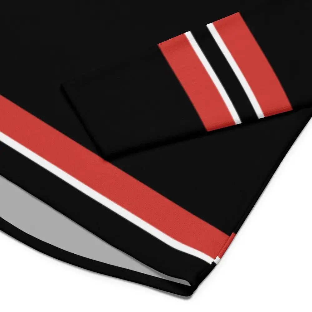 Show your pride with our modern, red white and black Palestine hockey jersey. Featuring 'Palestine' in white Arabic calligraphy set against a black background on the front, and the number '48' in Arabic on the back. The design is accented with a subtle white keffiyeh pattern around the neck. Ideal for everyday wear, sports events, or as a thoughtful gift for those who love Palestine, hockey, and streetwear. This unique Palestinian jersey combines comfort with cultural pride, making it a must have for anyone celebrating their Palestinian heritage. Our long sleeve Palestine hockey jersey is designed for an oversized fit while staying true to size, perfect for a comfortable, stylish look. This unique Palestine Hockey Jersey is exclusively crafted and sold by Arabix!