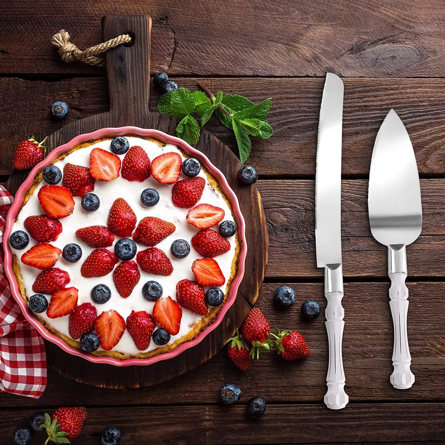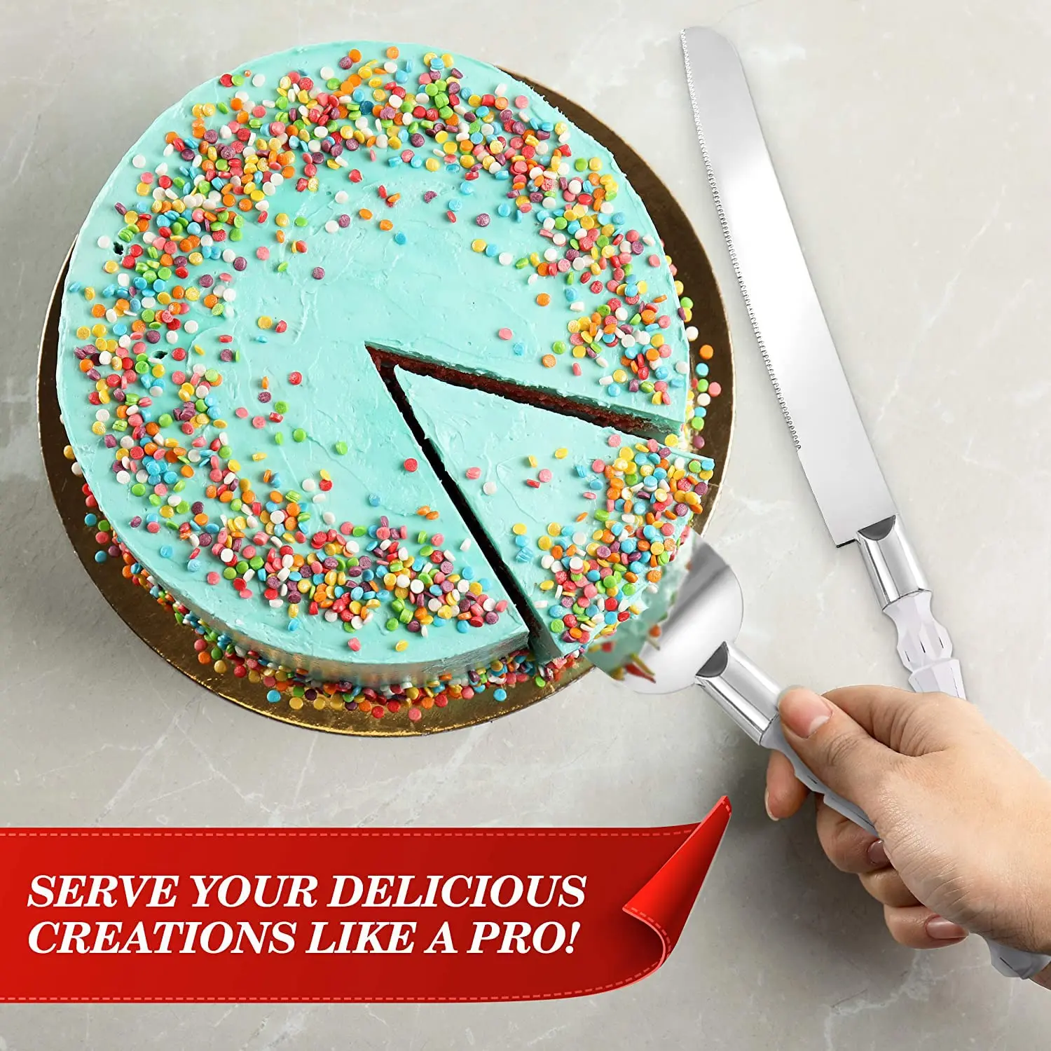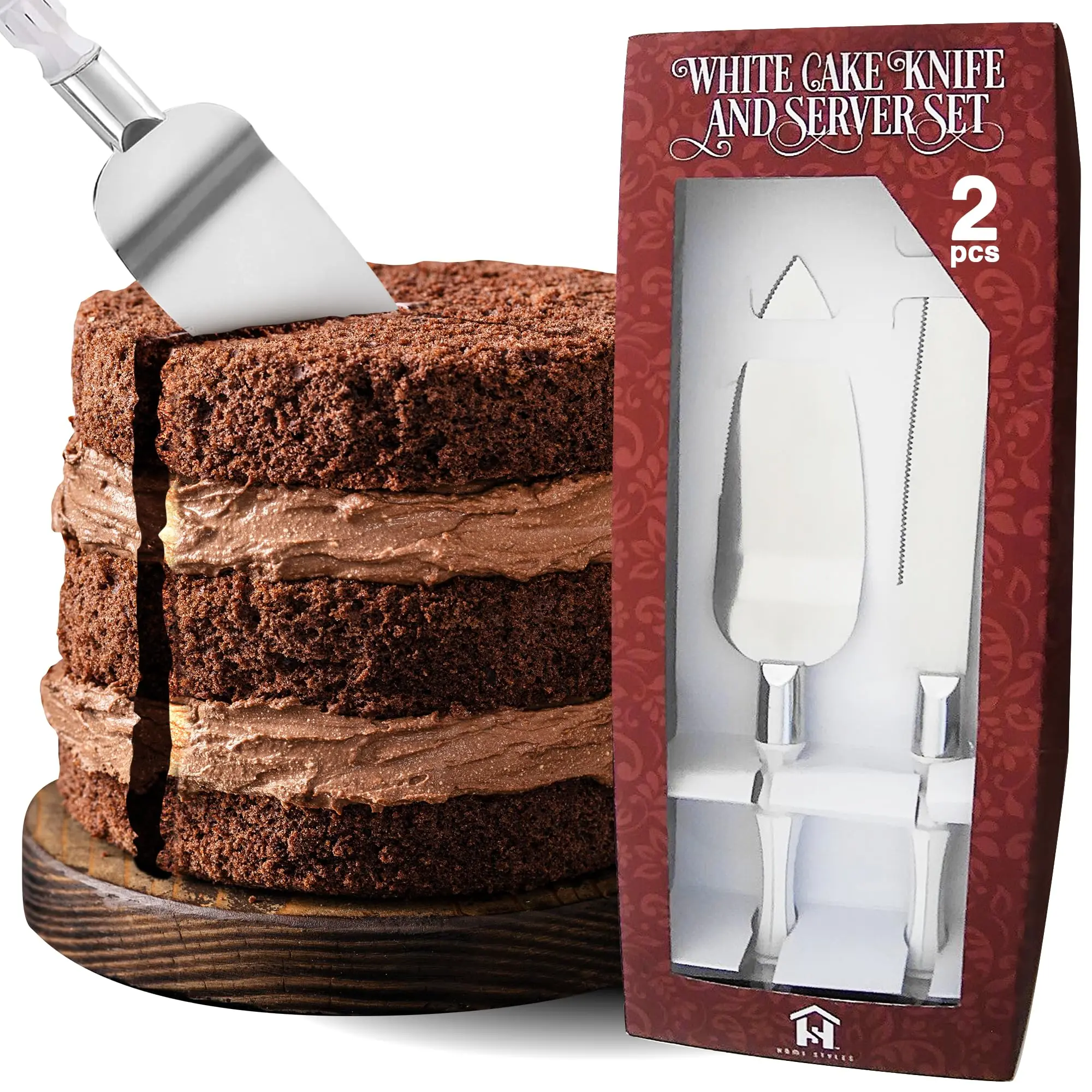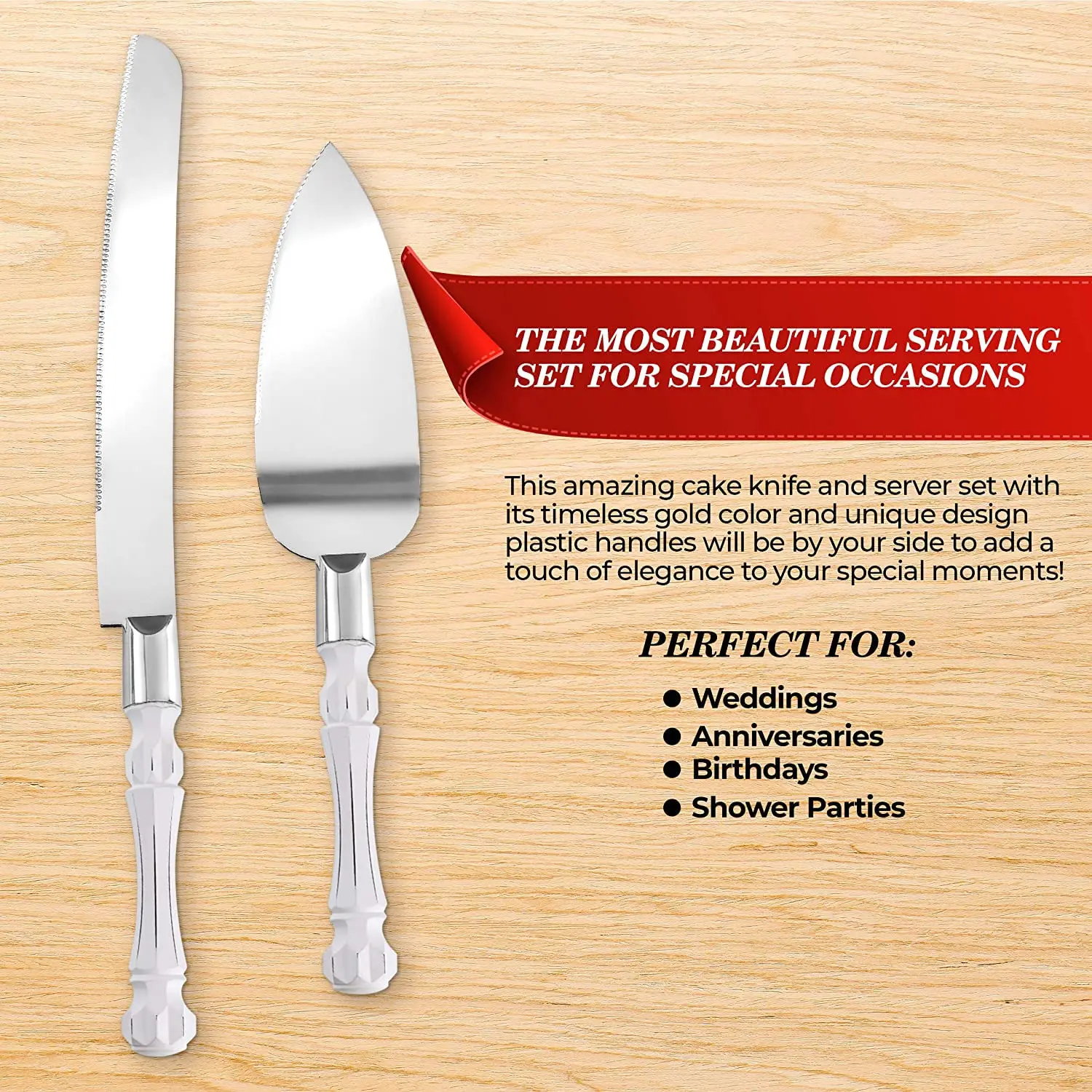 Homi styles White Elegant Cake Knife and Server Set, Cake Cutter and Pie Spatula, Cake Server and Knife Set of 2 with Thick Blades,Rustic Wedding Cake Cutting Set, Birthdays, Anniversaries,Parties