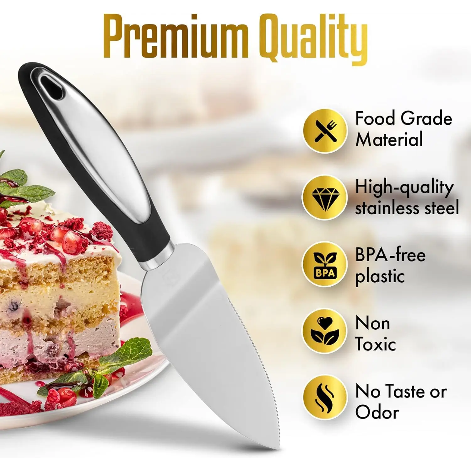 The cake server spatula and cutting knife are made from food-grade stainless steel. Serrated and balanced blades offer quality, durability, and sharpness. They are easy to maintain and suitable for long-term use. Perfect for any occasion, this set ensures a seamless cake serving experience.
