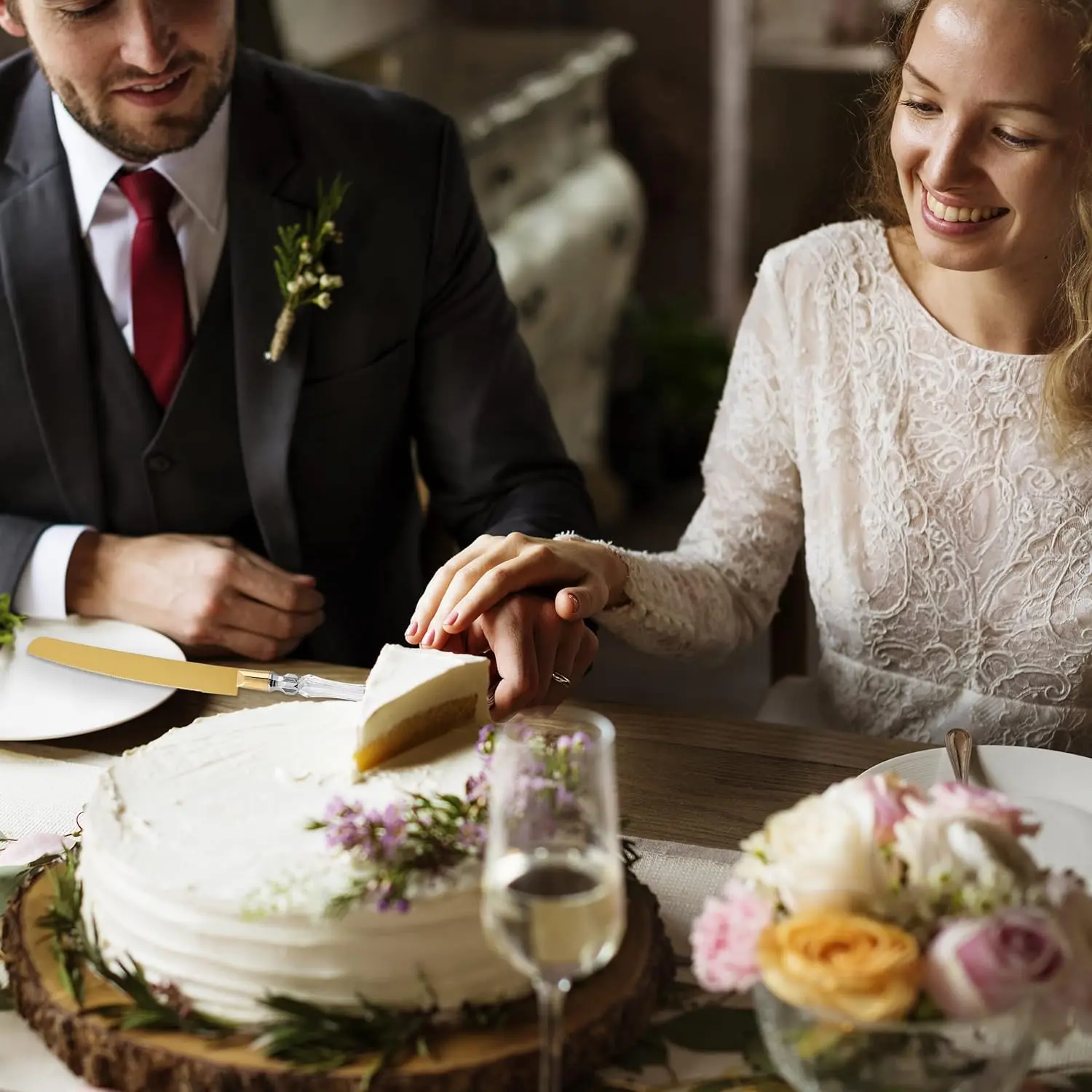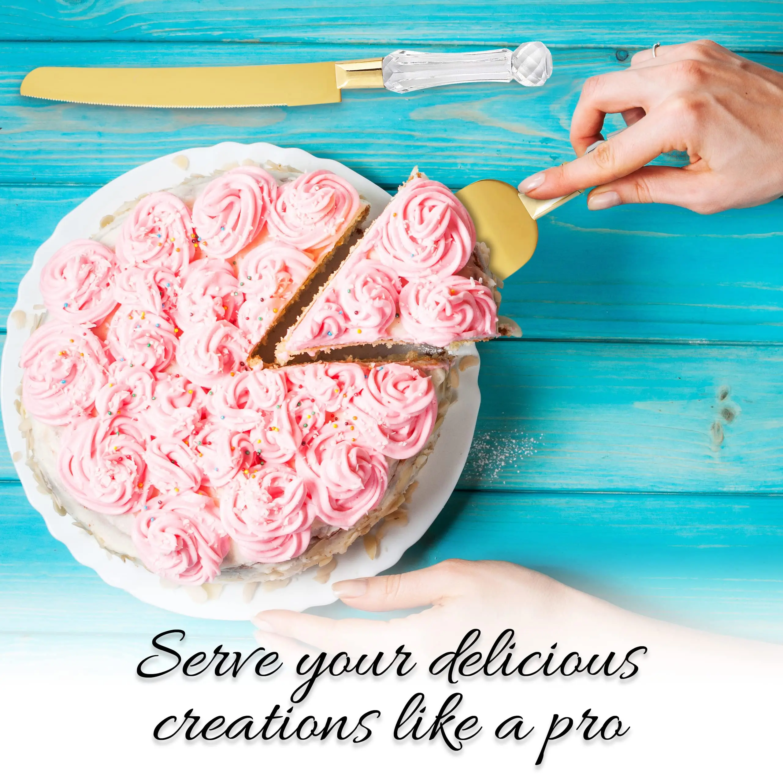 Invest In A Top Quality Wedding Cake Serving Set You Can Reuse In Every Special Occasion! ➤ Made of excellent quality 420 stainless steel, this serving knife set will not rust or corrode, no matter how often you use it. ➤ Perfect for Anniversaries, Birthdays, Gender Reveal Parties, Thanksgiving, or for any occasion you want to impress your guests! ➤ And no, you don’t always need a cake to use it. The Homi Styles gold cake server set cuts like butter any pie, cheesecake, crust pie, cream cake or even quiches and tarts. Thoroughly Designed To Help You Slice & Serve Any Cake With Charm & Ease! If you are worried about messing up your special day with badly sliced cake, this wedding cake server set is just what you need. Thanks to the serrated blades of the knife and spatula along with their non-slip ball handles, you can slice your cake easily and mess free! The convenient dimensions of this server set make it a great choice for any kind of cake too. 📏 Knife: 12.5” Long Handle -- 4.5” Long x 1” Height Blade -- 8