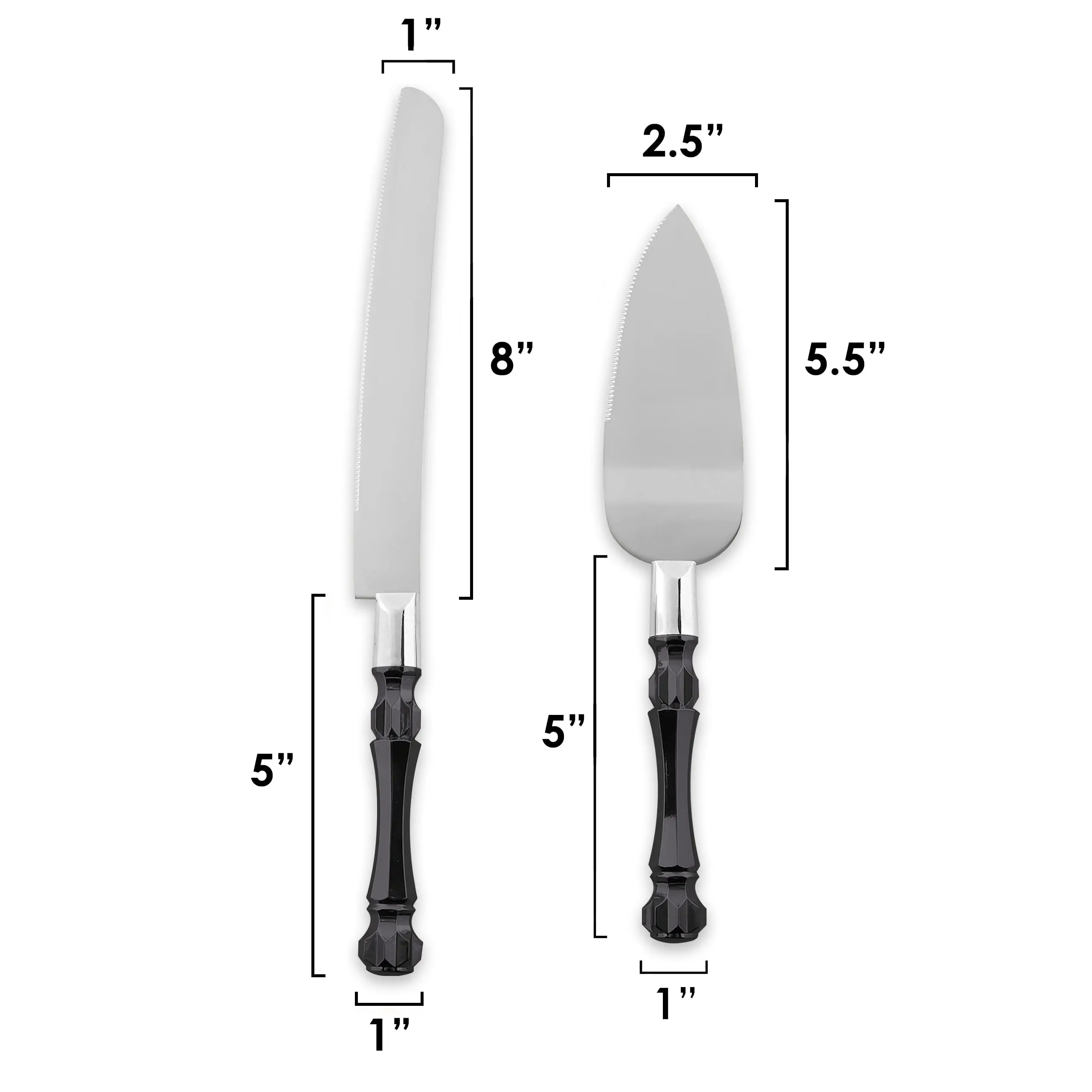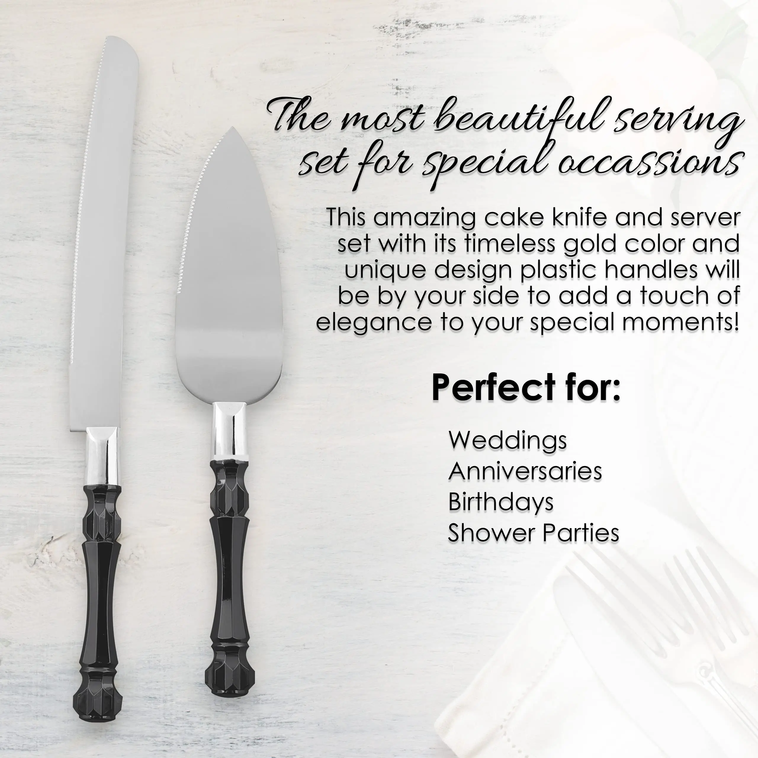 Whether a wedding, bat mitzvah, birthday party or anniversary, our serving utensils set for parties are here to amaze and surprise your guests. The set comes with a sharp cake knife suitable for all types of cakes, as well as a server that makes your job a lot easier. The cake knife and server wedding have an ergonomic design that is easy to maneuver due to their comfortable grips. The wedding cake cutter and server are available in various colors that you can match to your event’s theme or co