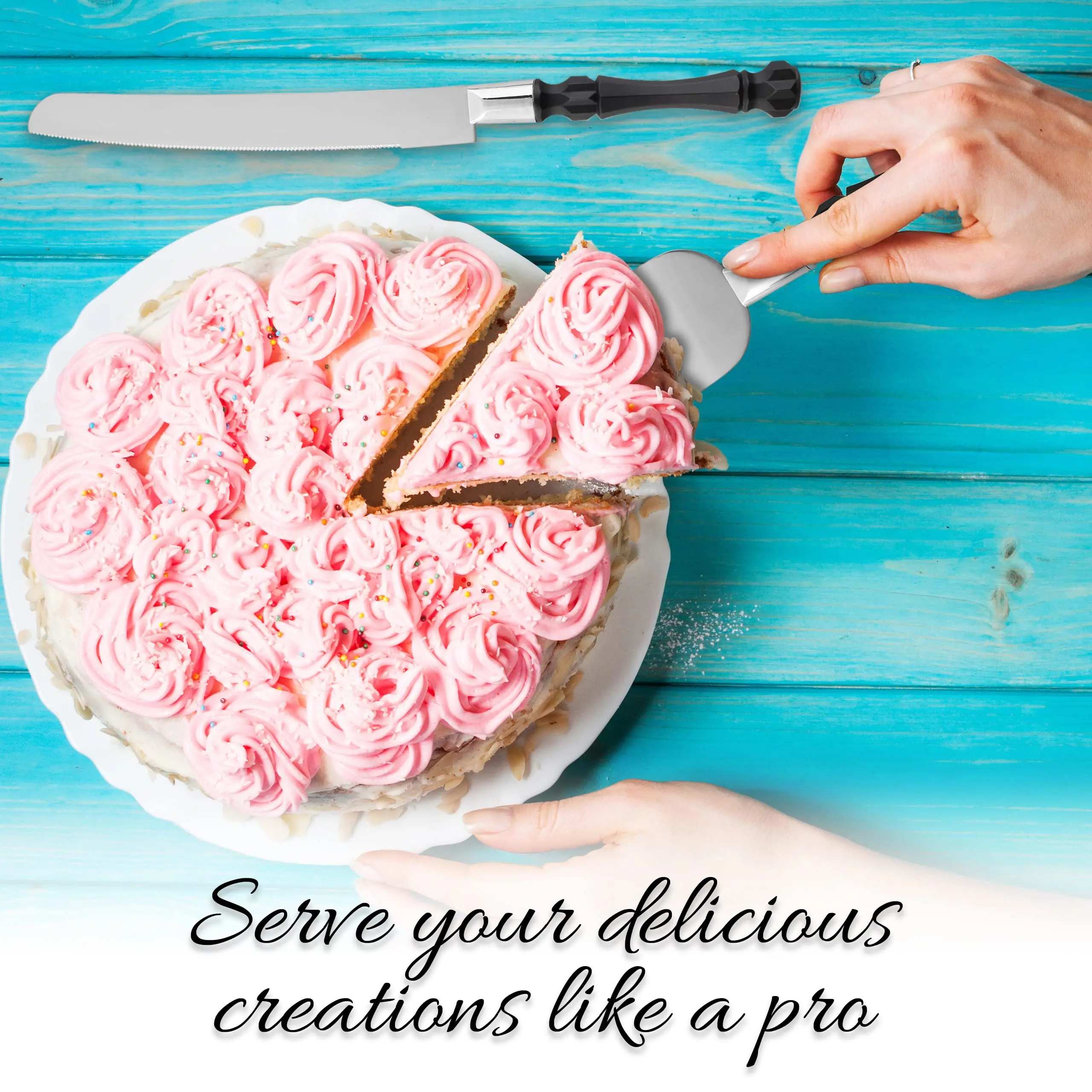 We focus on developing new and exciting products that will become staple accessories in your kitchen. For that, we rely on verified suppliers and excellent materials that allow us to make sure our products exceed your expectations. Our wedding cake knife and server set is an excellent example of what our team can do. Featuring durable and very sharp 1.2mm blades, our cake cutter set for wedding is a must-have for your next big event.
