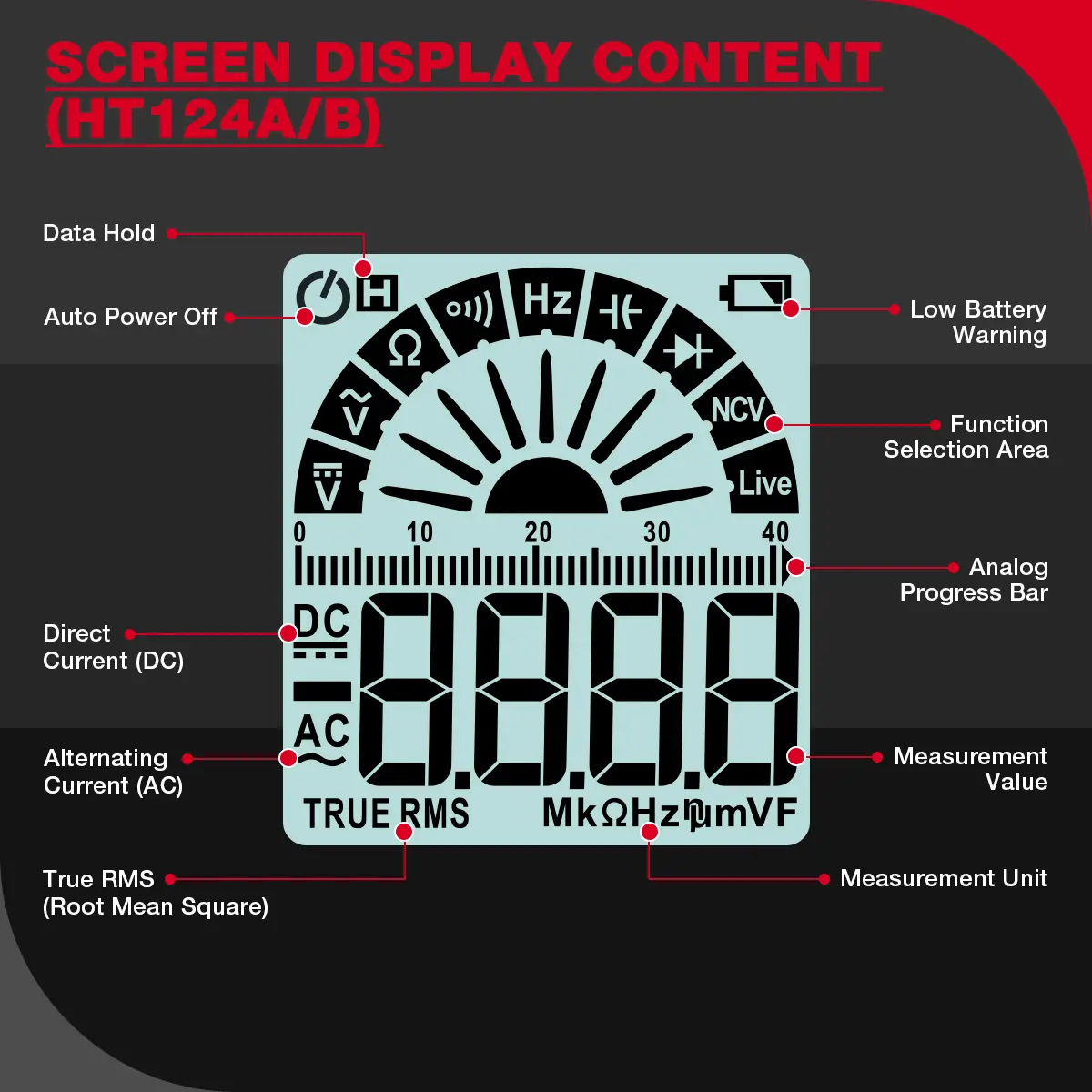 ● 1. Digital Multimeter: The digital multimeter supports AC and DC voltage testing, resistance testing, continuity testing, frequency testing, data hold, automatic shutdown, NVC, True RMS, automatic measuring range, Live wire detecting, diode ( HT124B B+ only ), capacitance ( HT124B B+ only ).