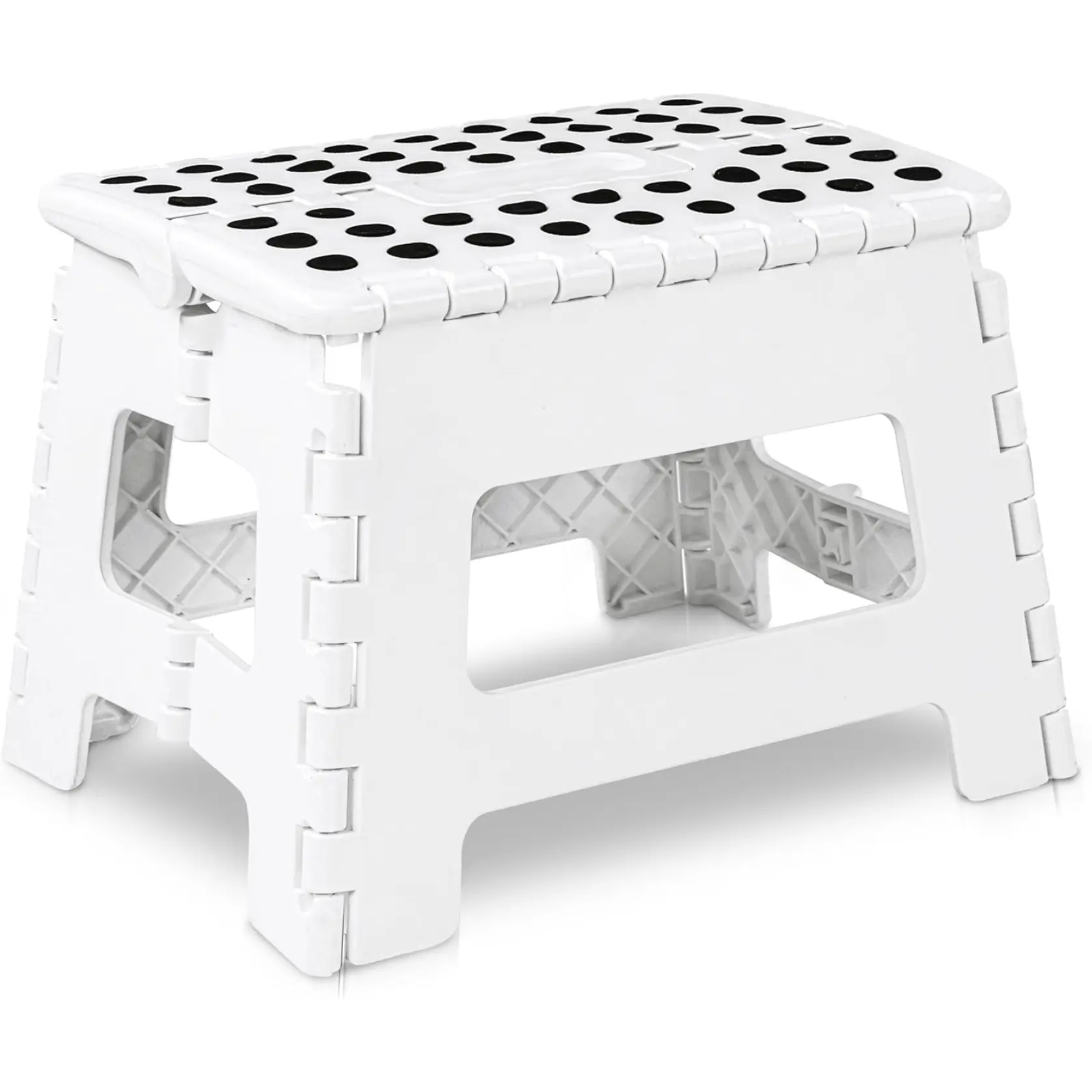 This adult stool's top surface features rubber polka dots for secure foot grip, while anti-skid rubber on the bottom prevents slipping; rounded corners for added safety.