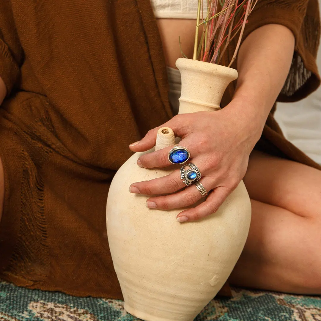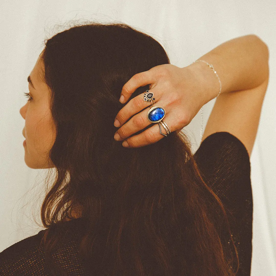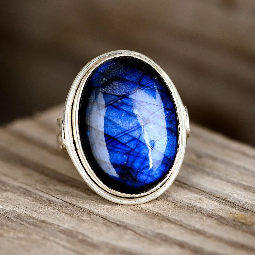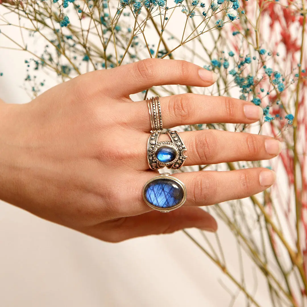 The blue labradorite is exquisite. I love the way it shimmers in the light. Beautiful ring.