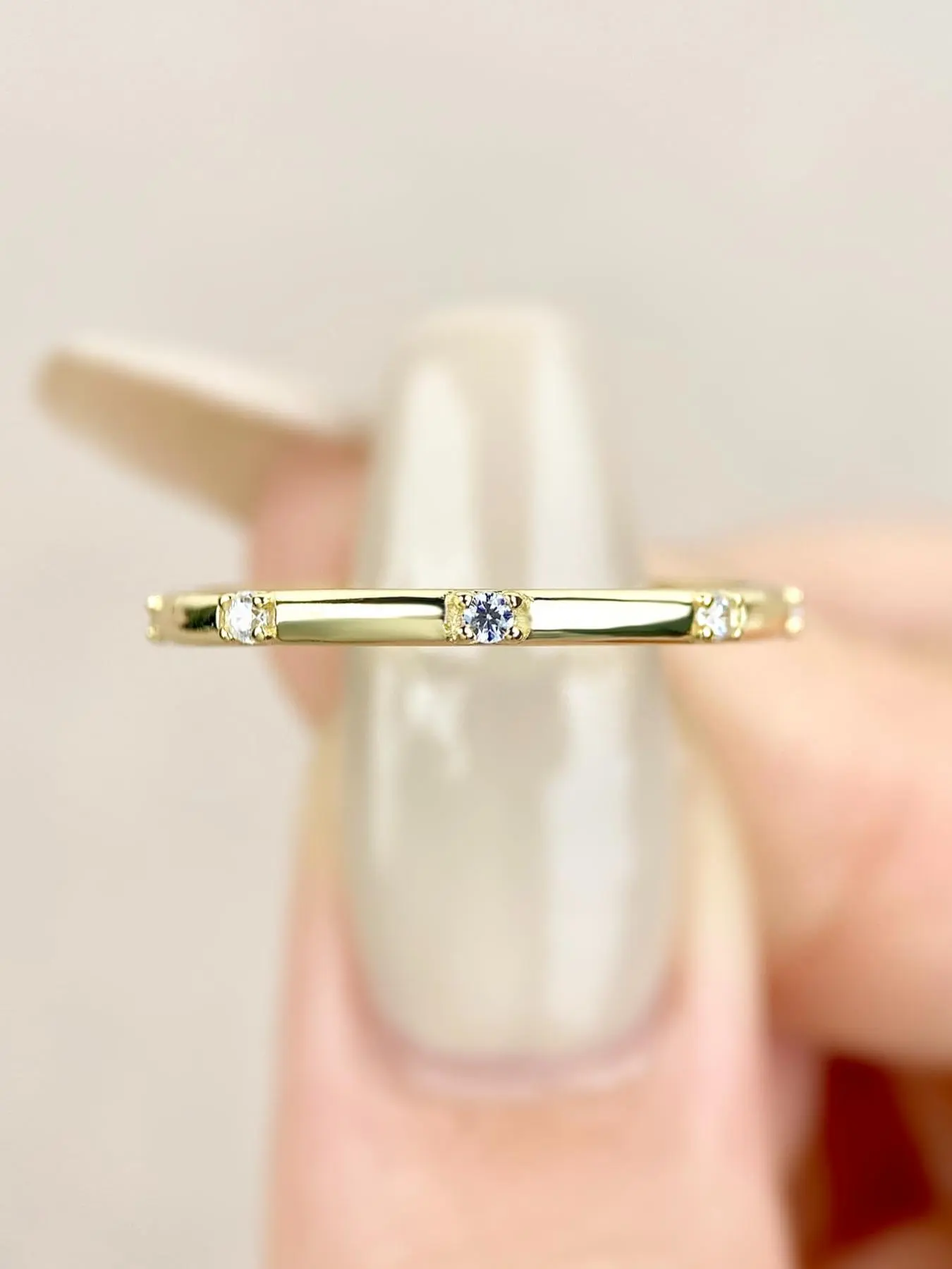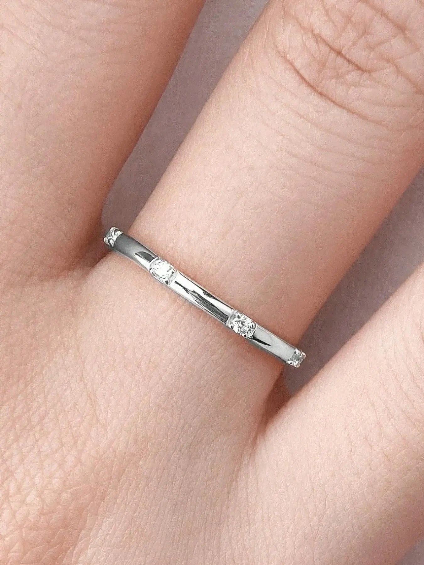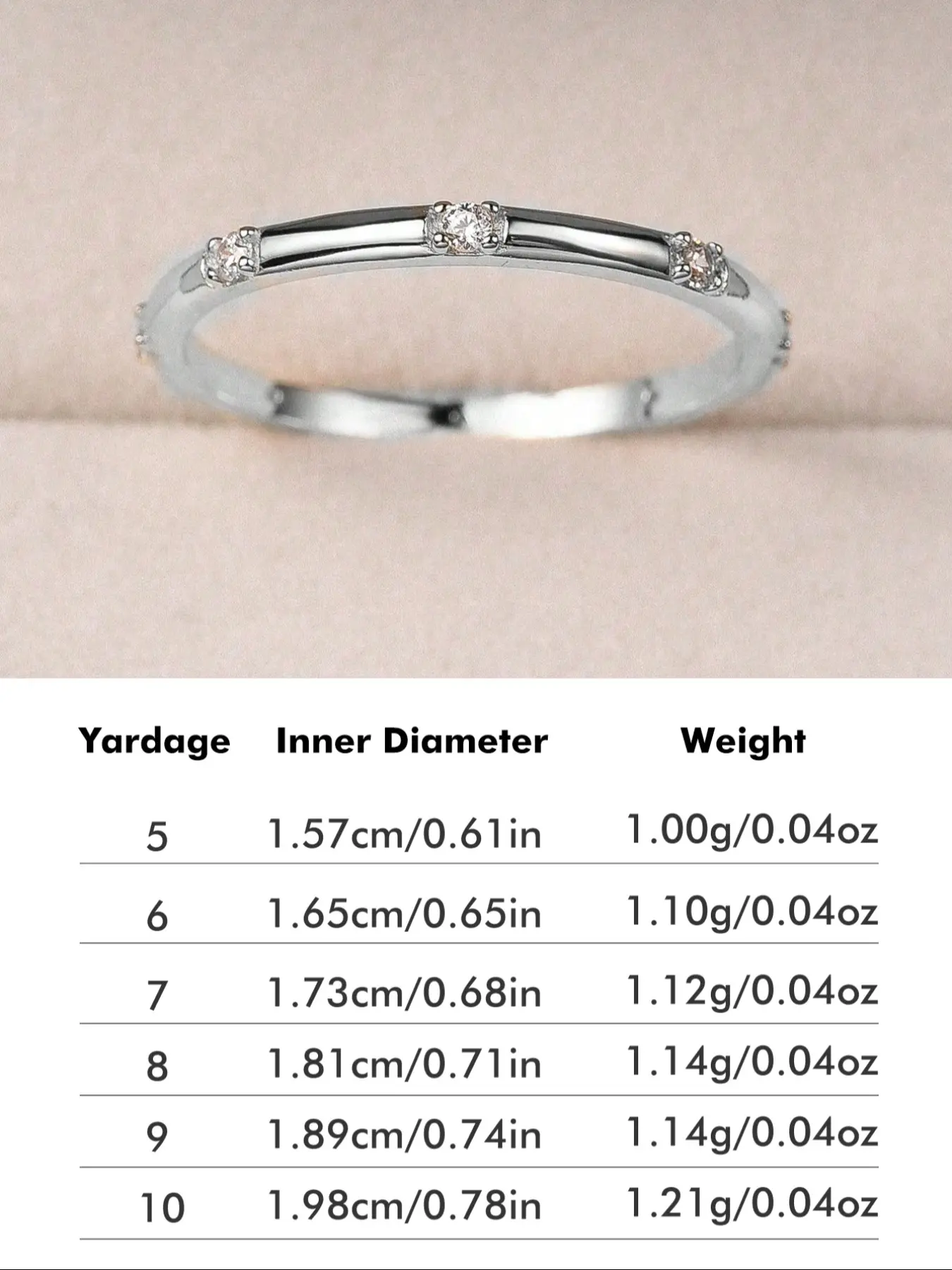 Beautiful band with diamond like stones. Fit well. Exactly as shown in the picture. Packaged in a plain gift box, ready to give as a gift. It also included a cleaning cloth.
