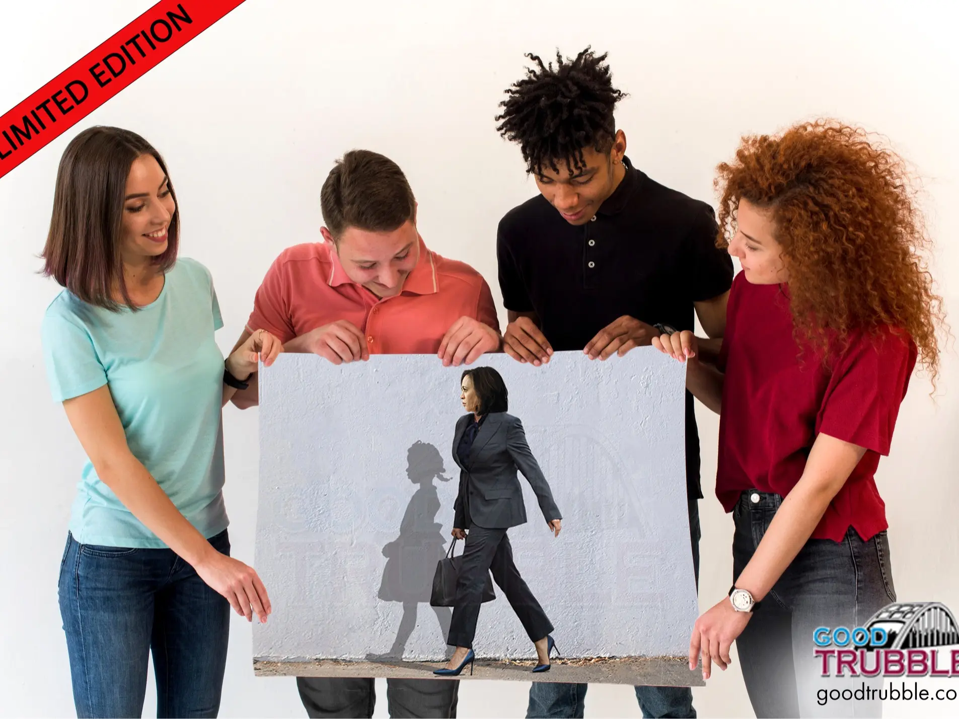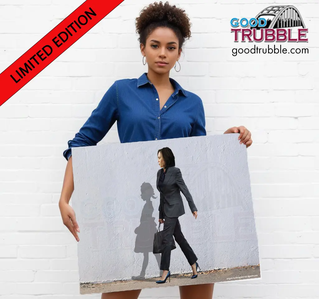 This official "That Little Girl Was Me" print celebrates iconic figures like Kamala Harris and Ruby Bridges, embodying Democratic ideals and advocating for women's rights.