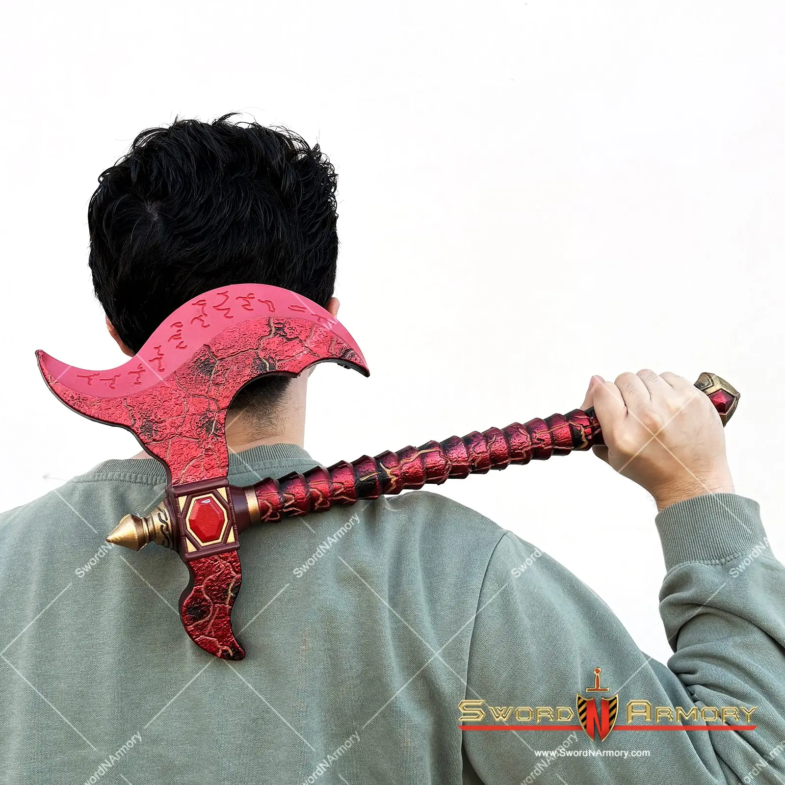 Unleash the fury of the crimson abyss with this fantasy foam axe. Crafted with detail, this axe features a double-bladed design and a fiery red finish that will strike fear into the hearts of your enemies. Its lightweight, foam construction makes it safe for both cosplay and role-playing, while its intricate engravings and sturdy handle ensure a realistic and immersive experience. Whether you're a warrior, a demon hunter, or simply a fan of epic fantasy, this axe is the perfect weapon to complete your look.