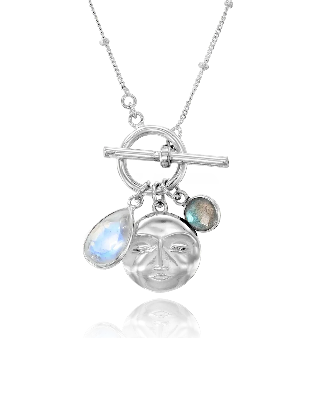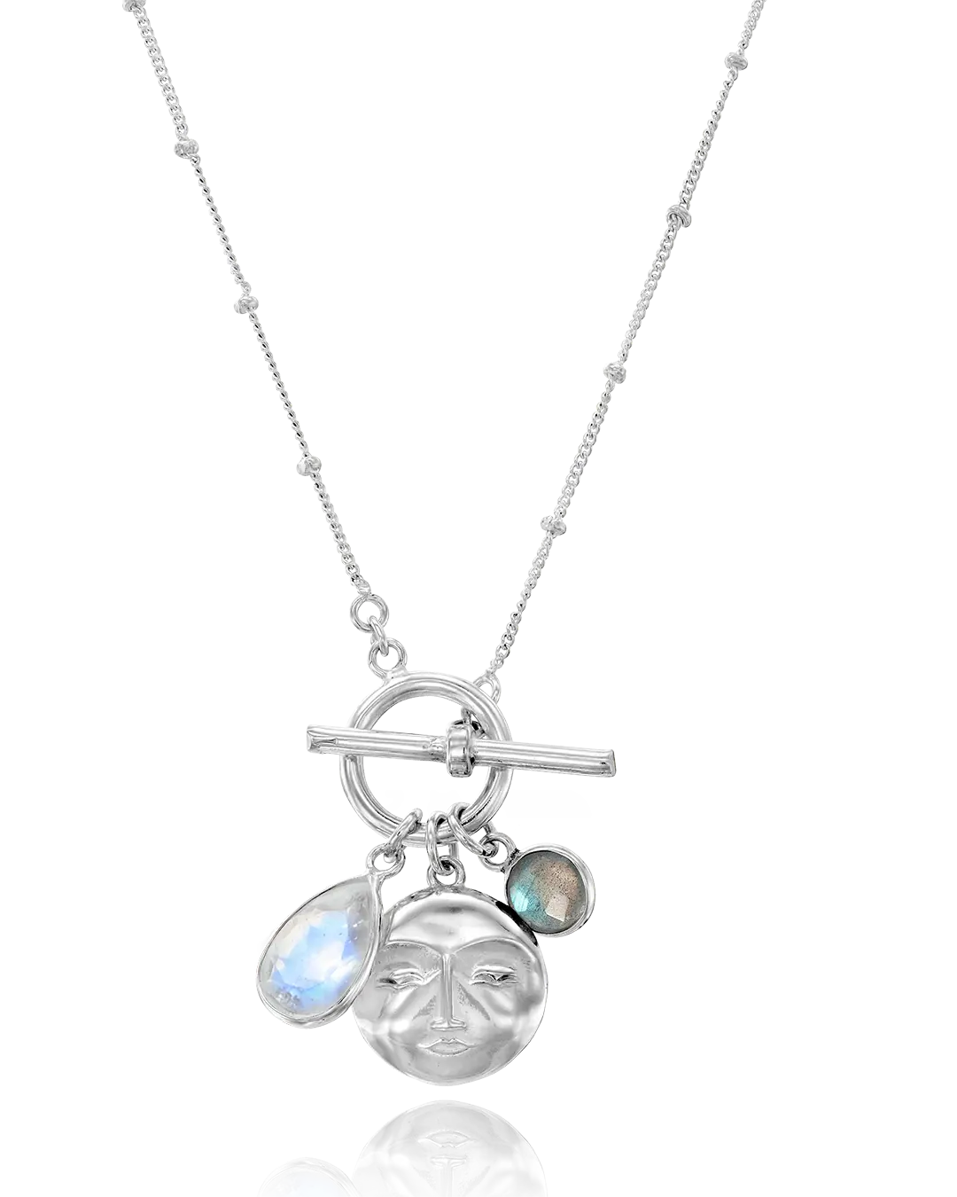 A stunning t-bar sterling silver charm necklace! This necklace has 3 beautiful charms: a teardrop moonstone charm, a circular labradorite charm and a silver moon face.