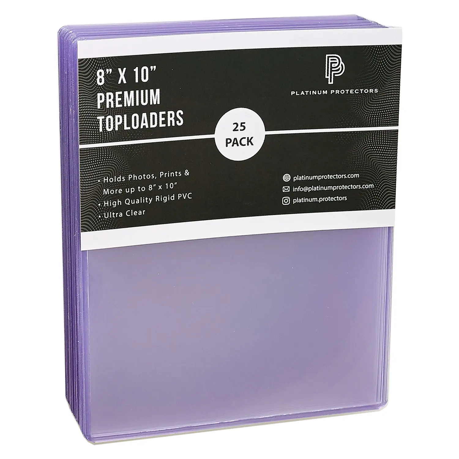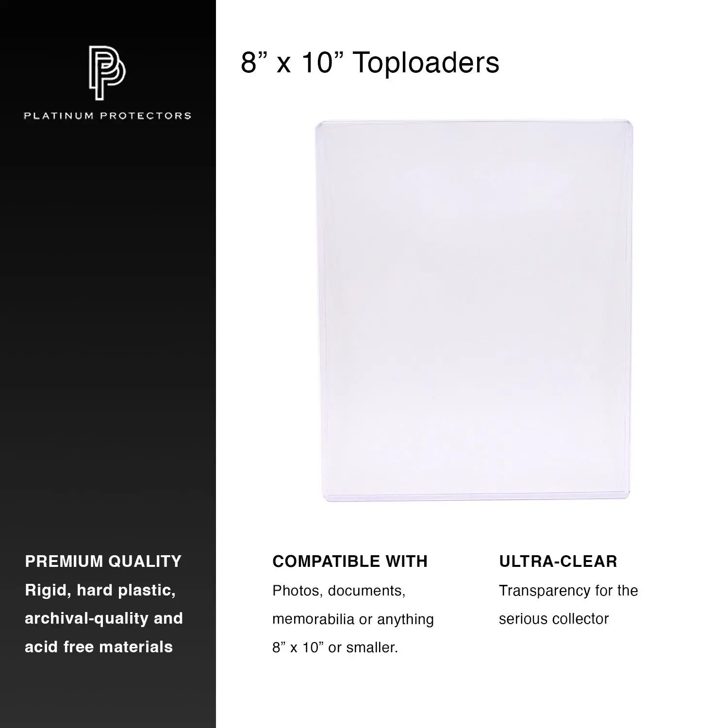 Don't trust your collection with the "standard" or "regular" quality toploaders that have flooded the market. Platinum Protectors premium quality 8x10 photo toploaders are for the serious collector. The perfect way to keep your documents and photos safe and secure. Made of durable premium hard plastic. Ultra-clear transparency with no imperfections.