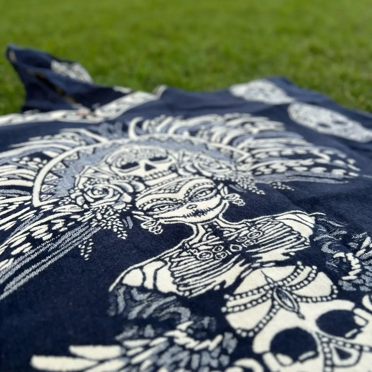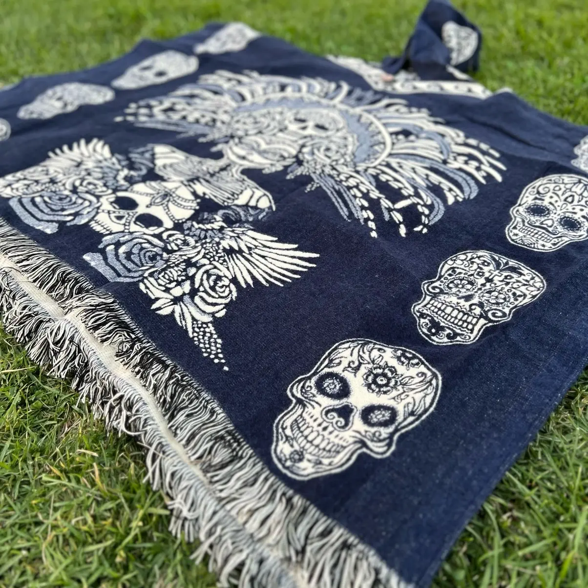 Introducing our beautifully handcrafted blue Catrina poncho, featuring a stunning design that embodies both cultural depth and artistic flair. This captivating piece showcases elegant Catrina imagery, with intricate skull designs adorning each side, paying homage to the rich traditions of Día de los Muertos. The bold blue color and unique patterns make this poncho not just a piece of clothing, but a wearable work of art that is sure to turn heads.