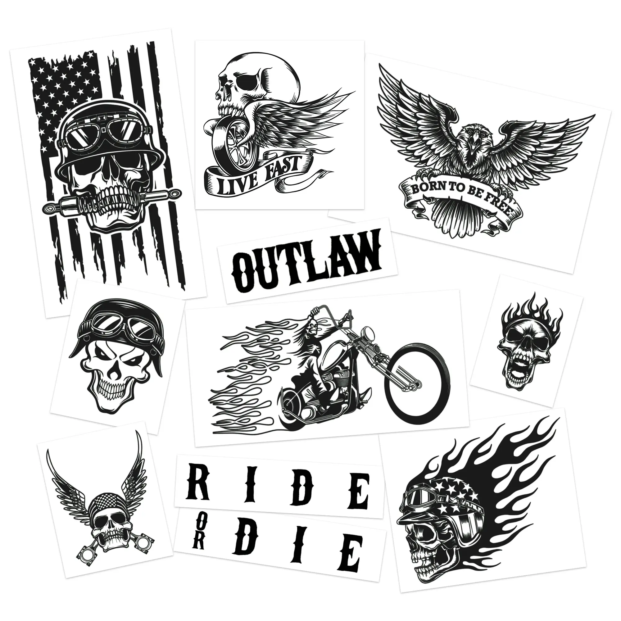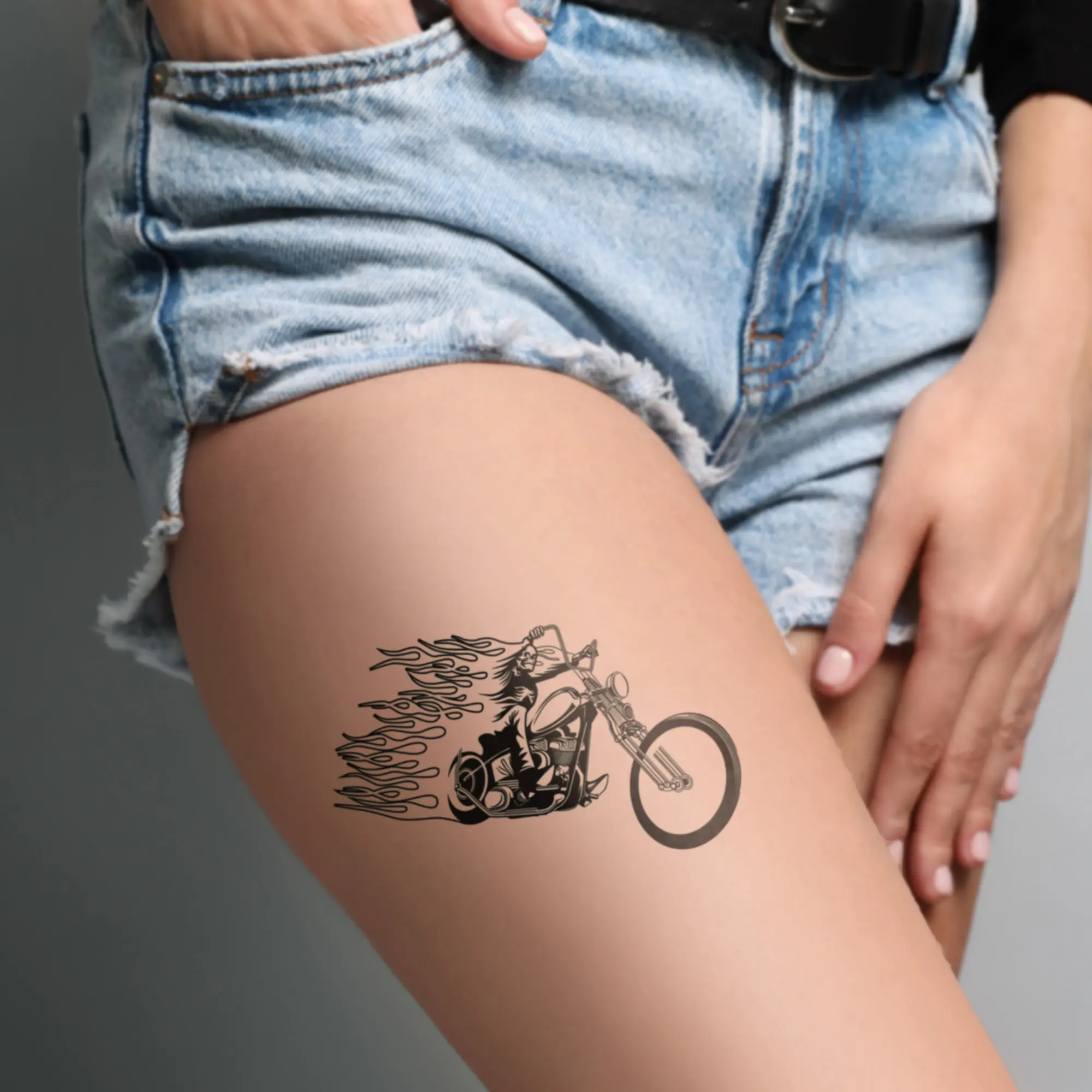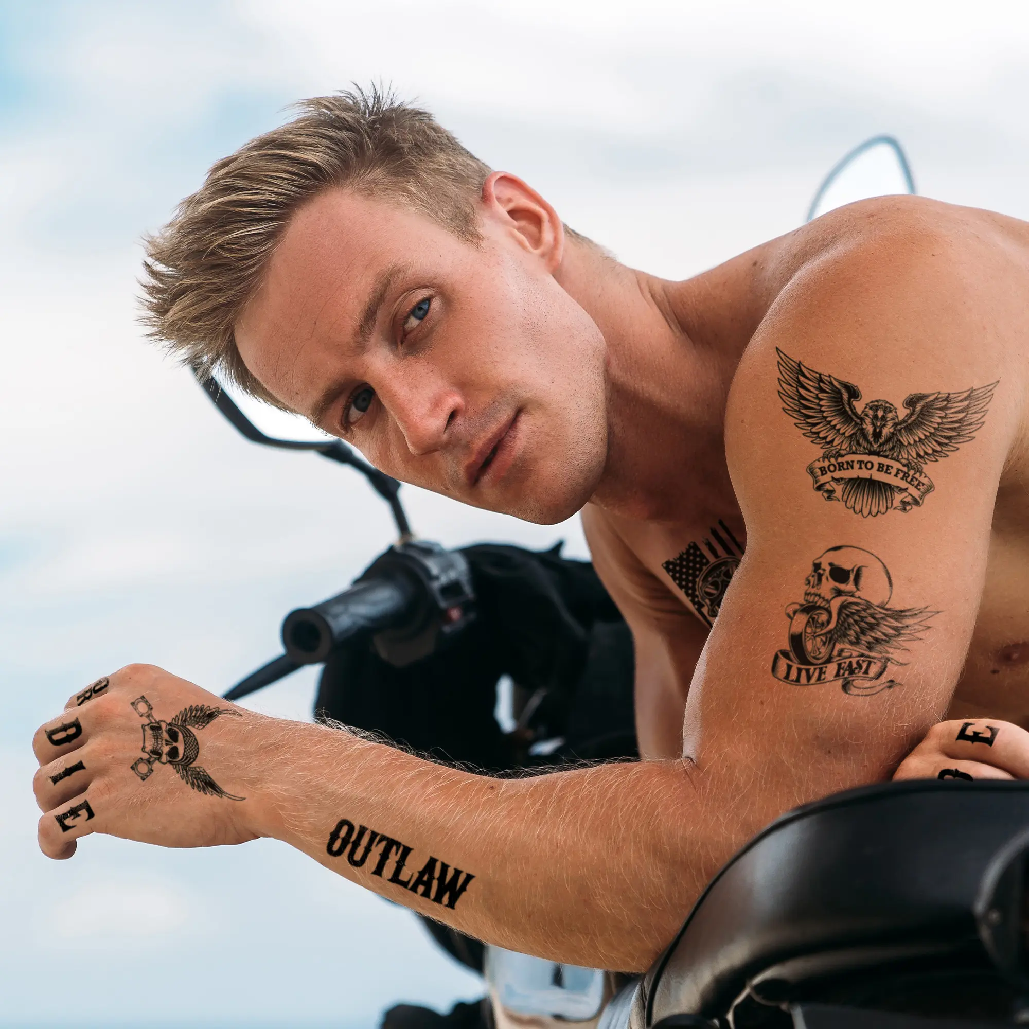 Transform your costume with Biker Temporary Tattoos by Fashiontats, perfect for Halloween, ComiCon, and cosplay parties.