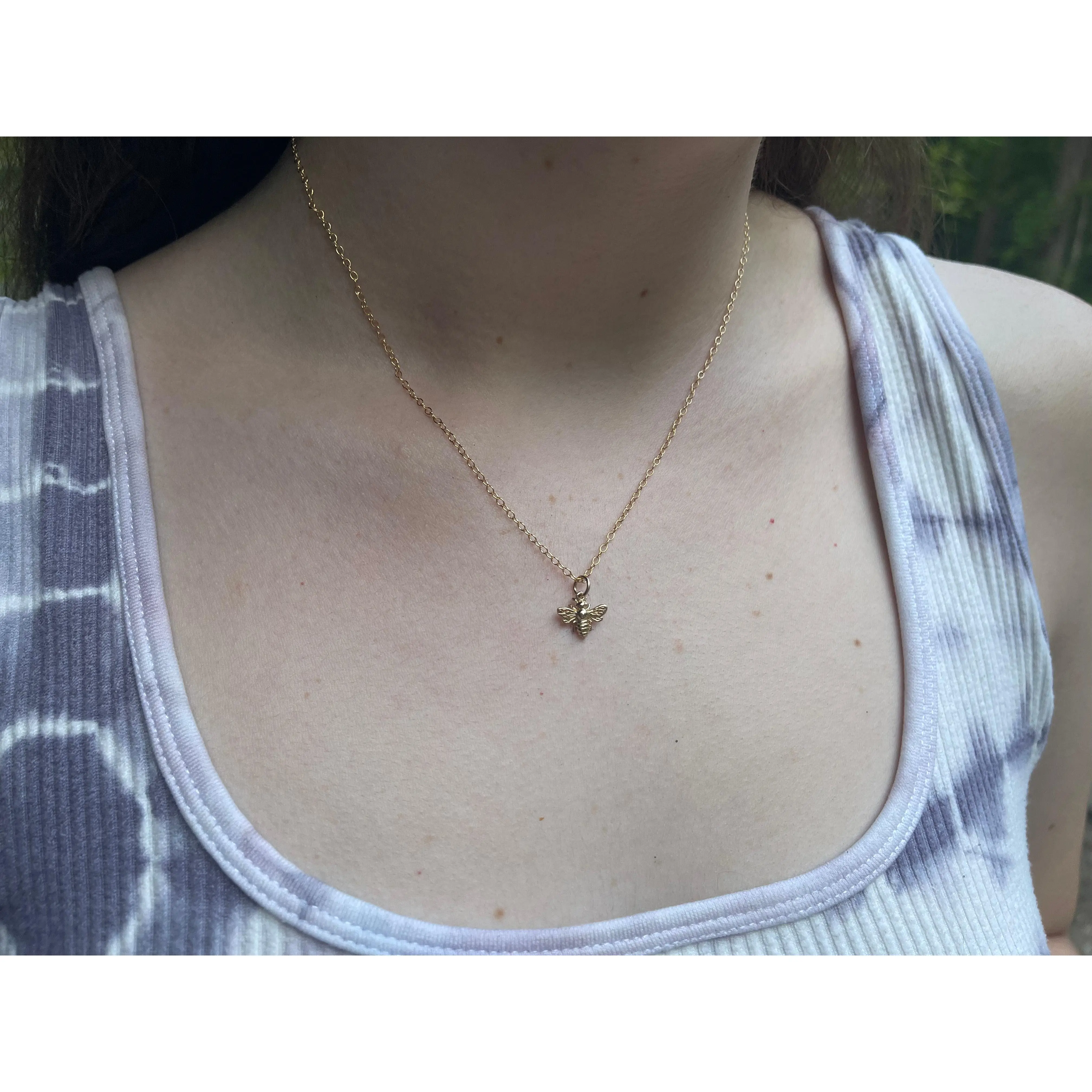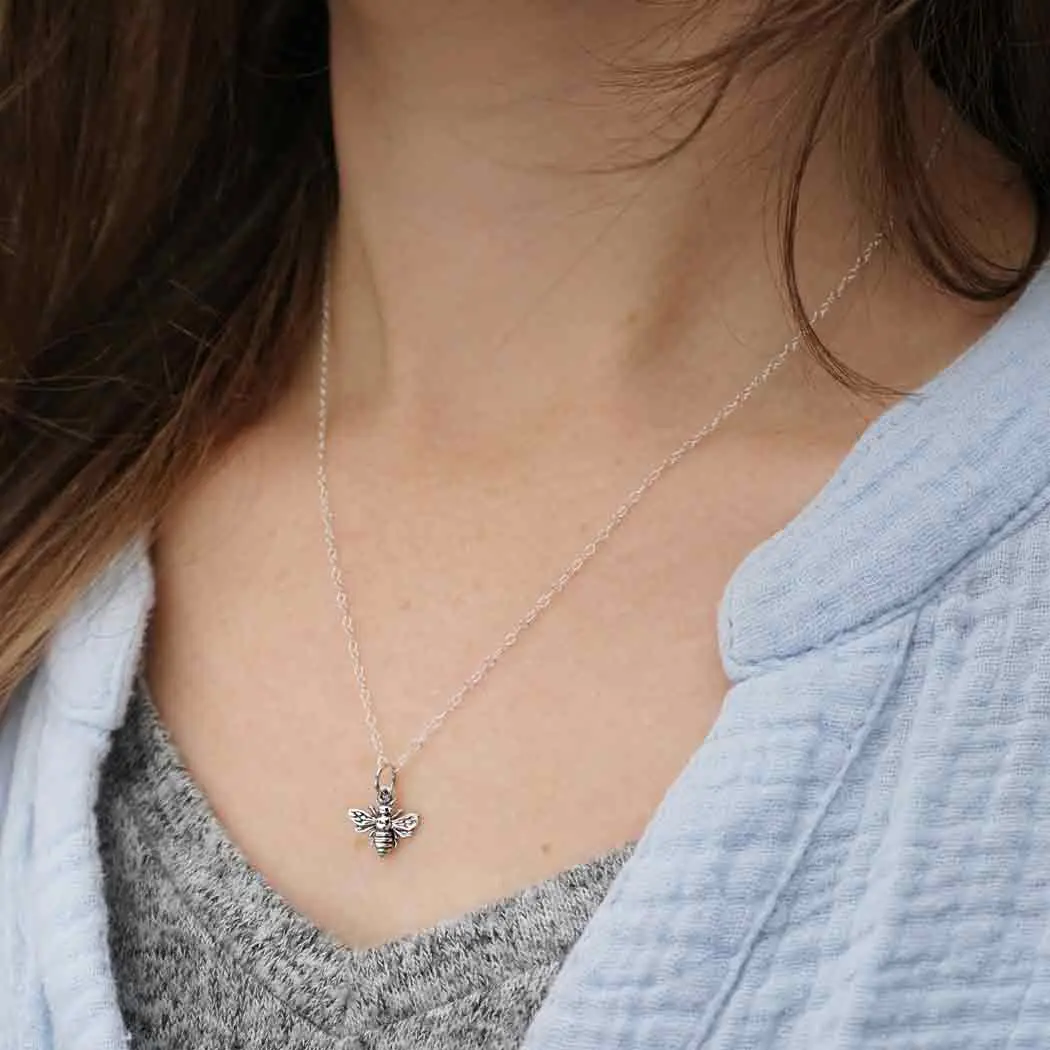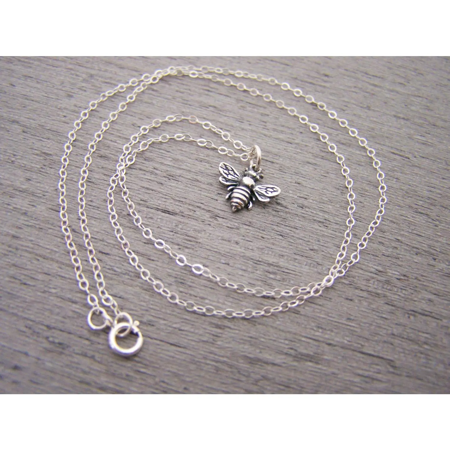This dainty necklace is handcrafted featuring an adorable detailed bumblebee charm of Sterling silver. Attached to an 18 inch shiny Sterling silver cable chain with secure lobster clasp closure.