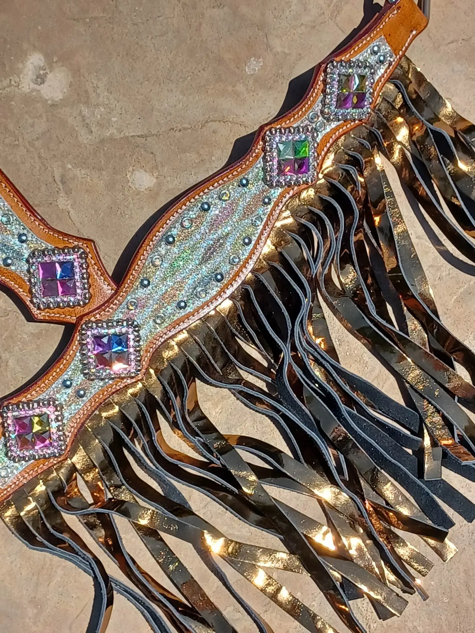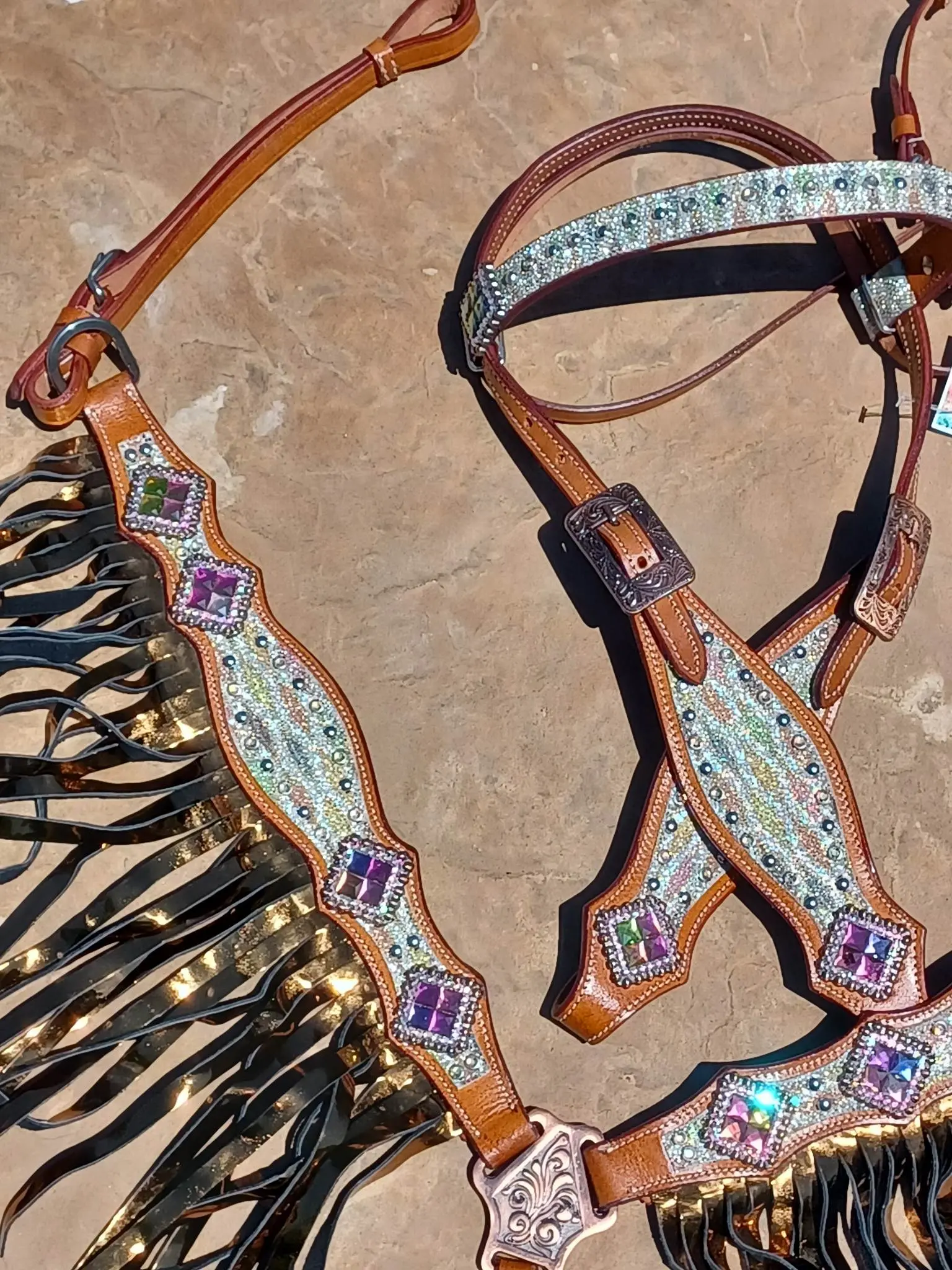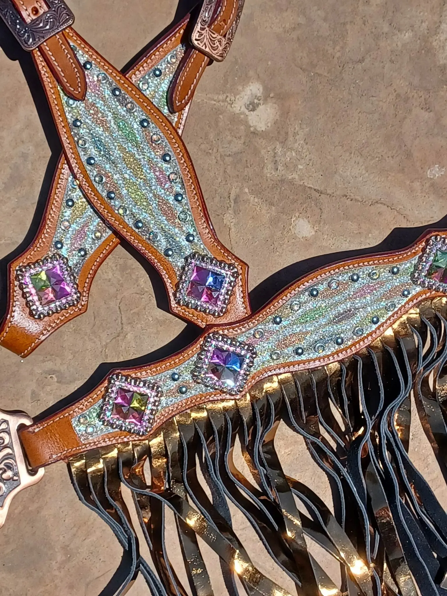 The Cassidy is a must-have for any stylish equestrian. This stunning bridle set features sparkly sting ray leather with a rainbow diamond print and beautiful crystal bling. Invest in The Cassidy today and ride off into the sunset with style and confidence!