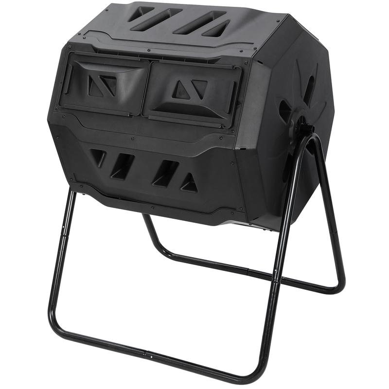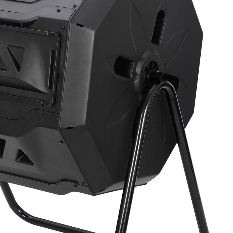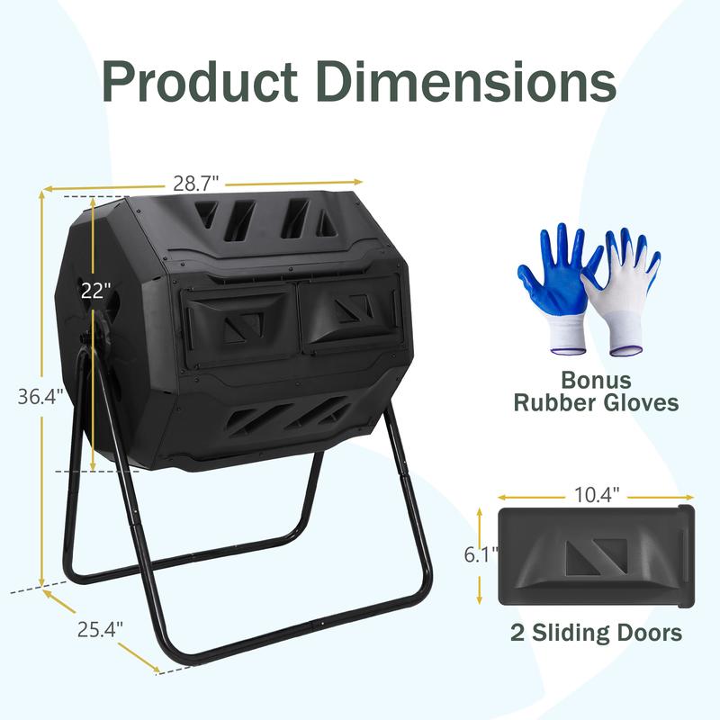 ·Dual Compost Bin: This composting tumbler offers dual compost bin for storing and commixing your soil with fertilizer or others. More space will help you do bigger gardening!