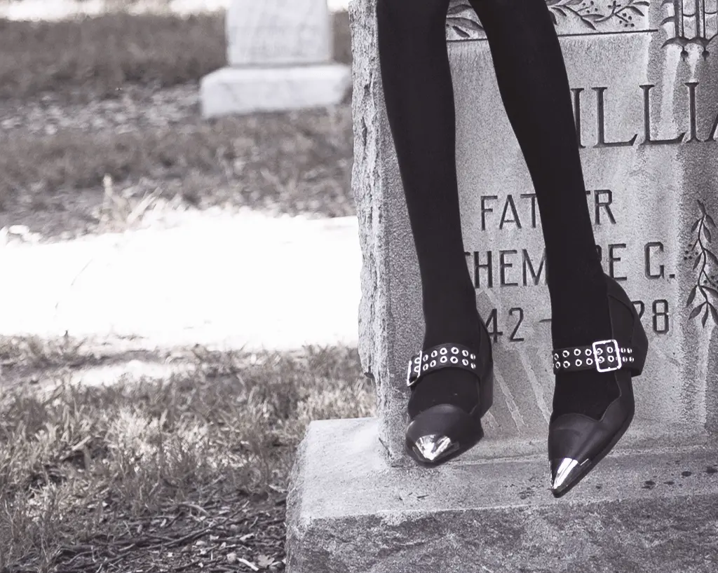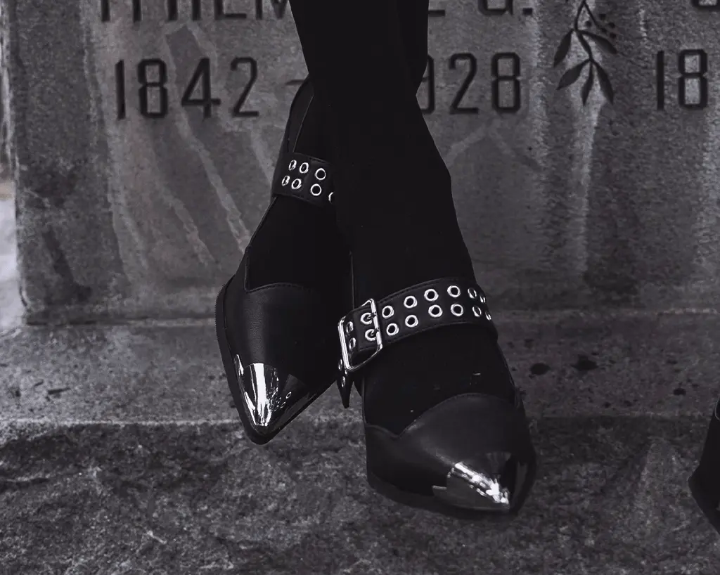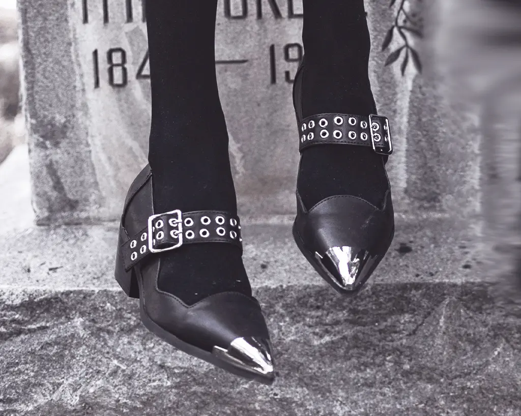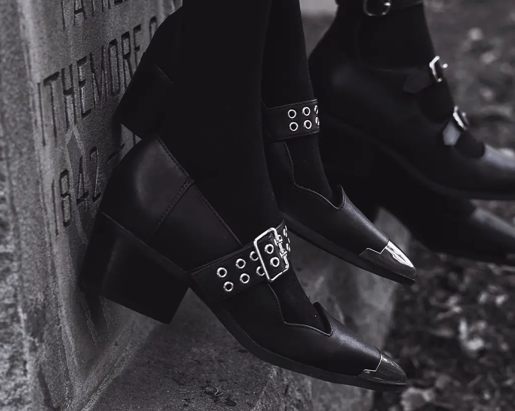 Must be the season of the witch! Black TUKskin Cuban Heel Mary Jane features silver metal toe cap, 2-prong silver strap. Has a block heel height of 2 ¼”.