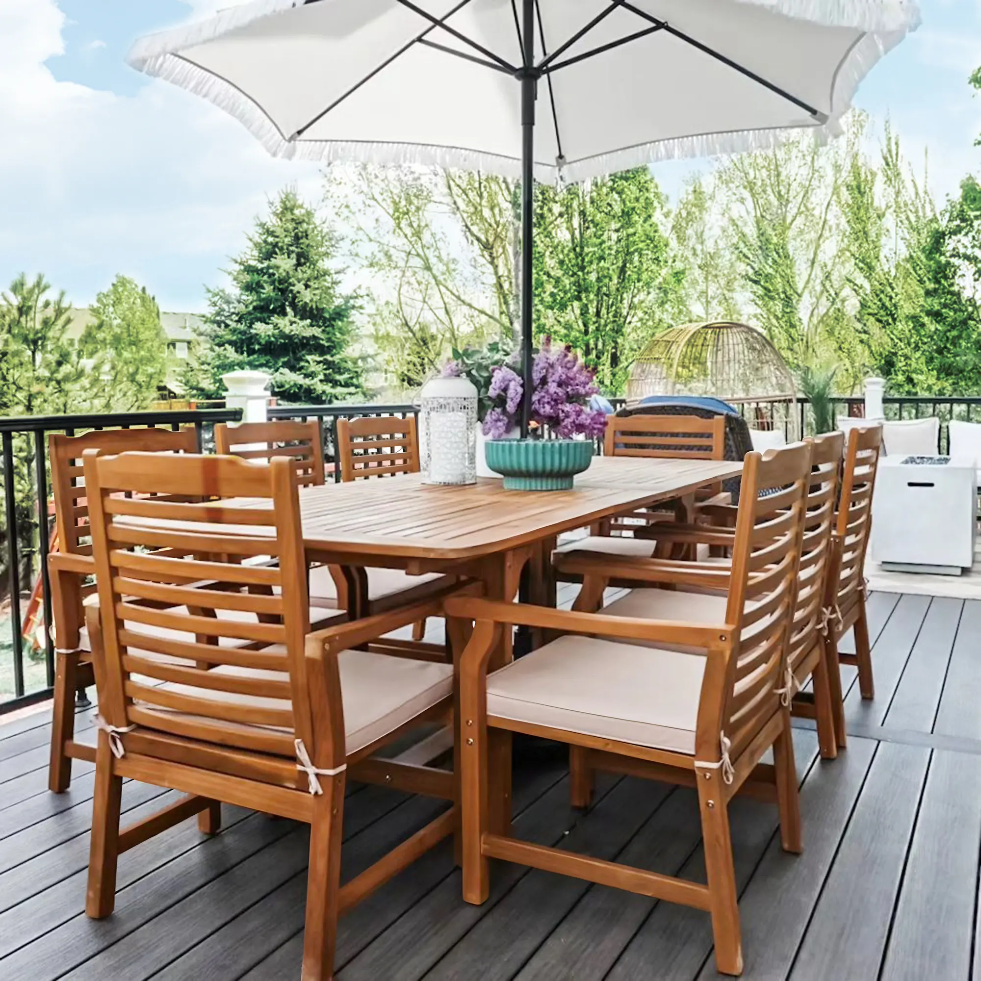 The 9-piece outdoor dining table set beautifully transforms any backyard, porch, patio or deck into an elegant dining area with its superior quality & deep comfort feel.