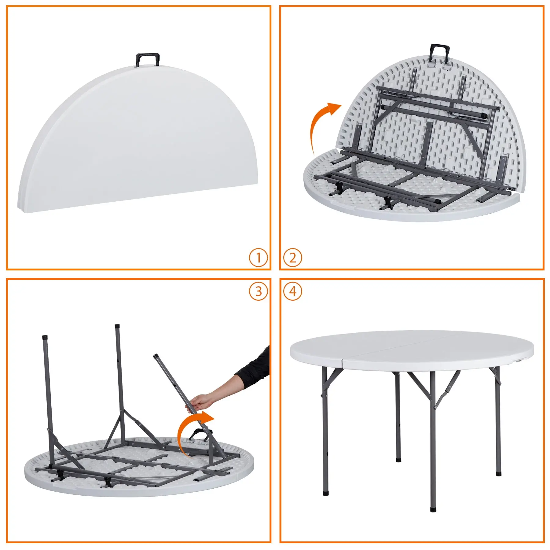 The folding table accommodates 4 to 6 people, with a spacious 48-inch (4 feet) diameter and a height of 29 inches, making it perfect for gatherings.