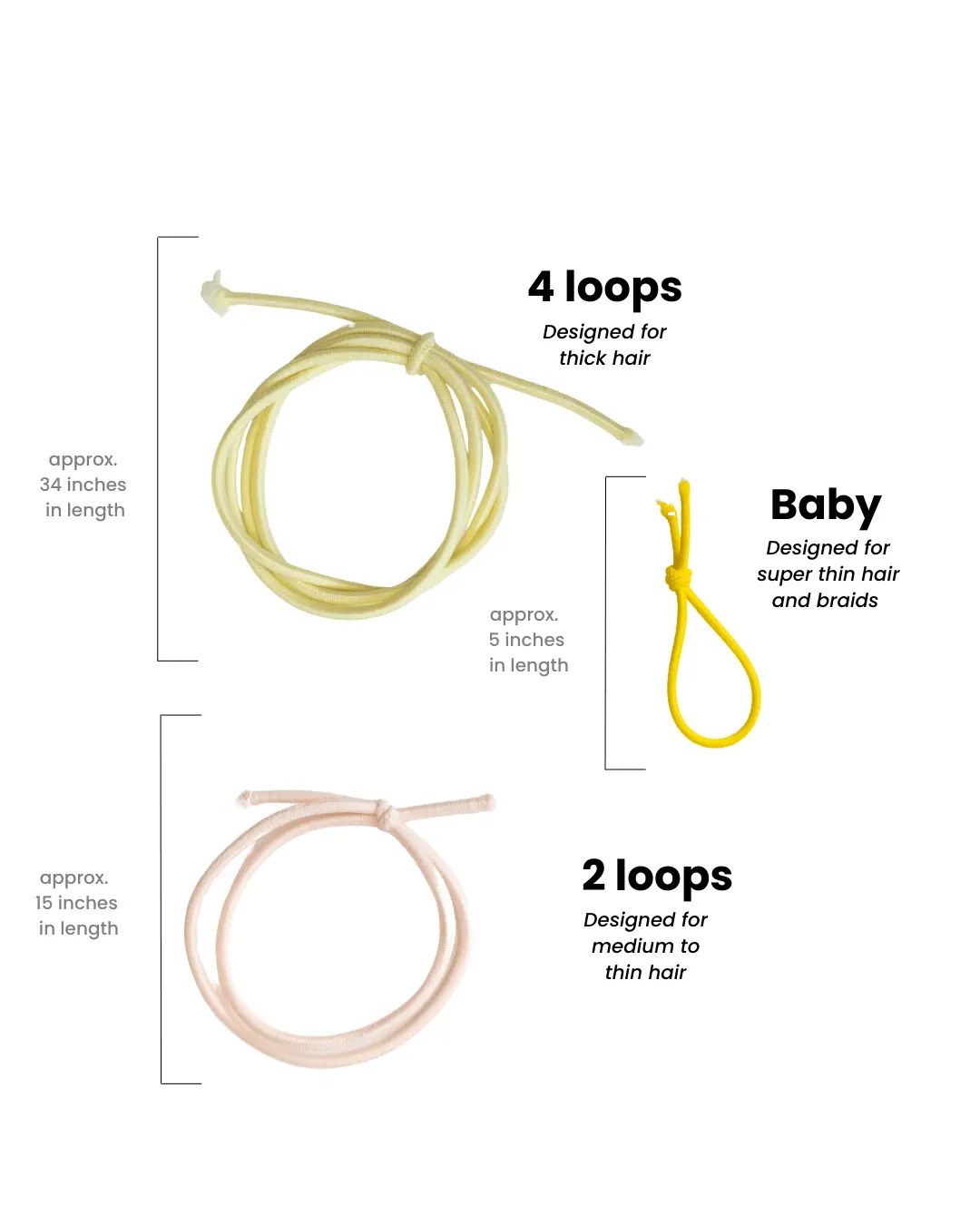 Loops: customizable for Any Hair Type — Cut and tie based on the length, thickness and texture of your hair. Make as little as one 4-Loop using all 34" or cutit up to make more TIYs.