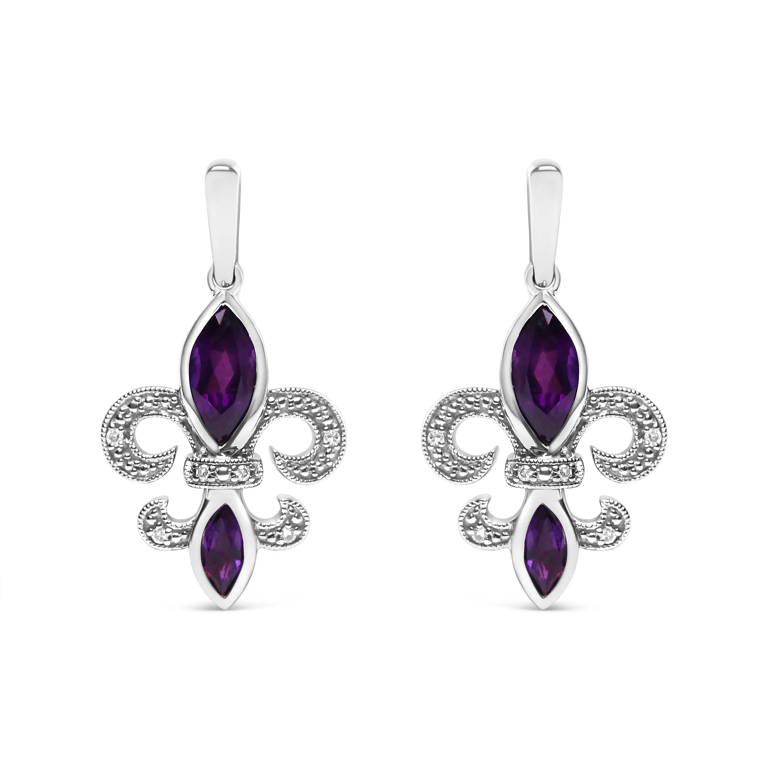 .925 Sterling Silver Marquise Cut Amethyst and Diamond Accent Fleur De Lis Dangle Stud Earrings (H-I Color, SI1-SI2 Clarity)
