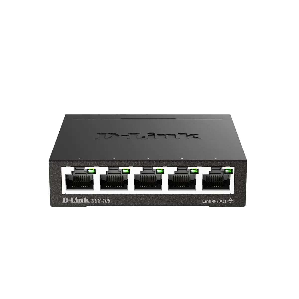 The D-Link DGS-105 is a silent, metal-cased 5-port Gigabit Ethernet switch that adds instant, lag-free wired connectivity to any home, office, or creator workspace. With a 10 Gbps switching fabric, QoS traffic prioritization, and Green Ethernet power savings, it supports a wide range of applications, from 4K streaming and online gaming to VoIP phones and smart home hubs—no configuration required.