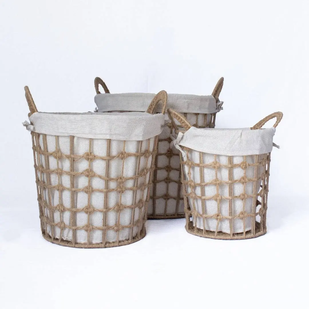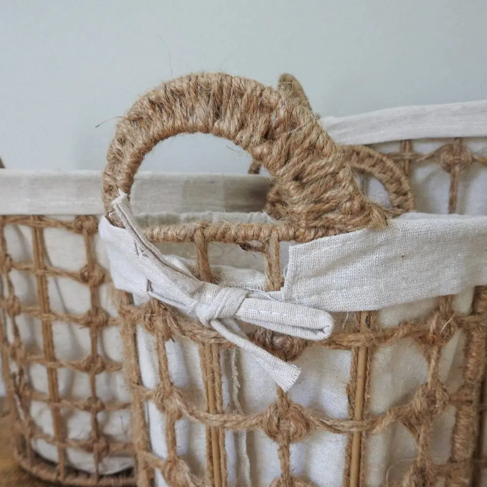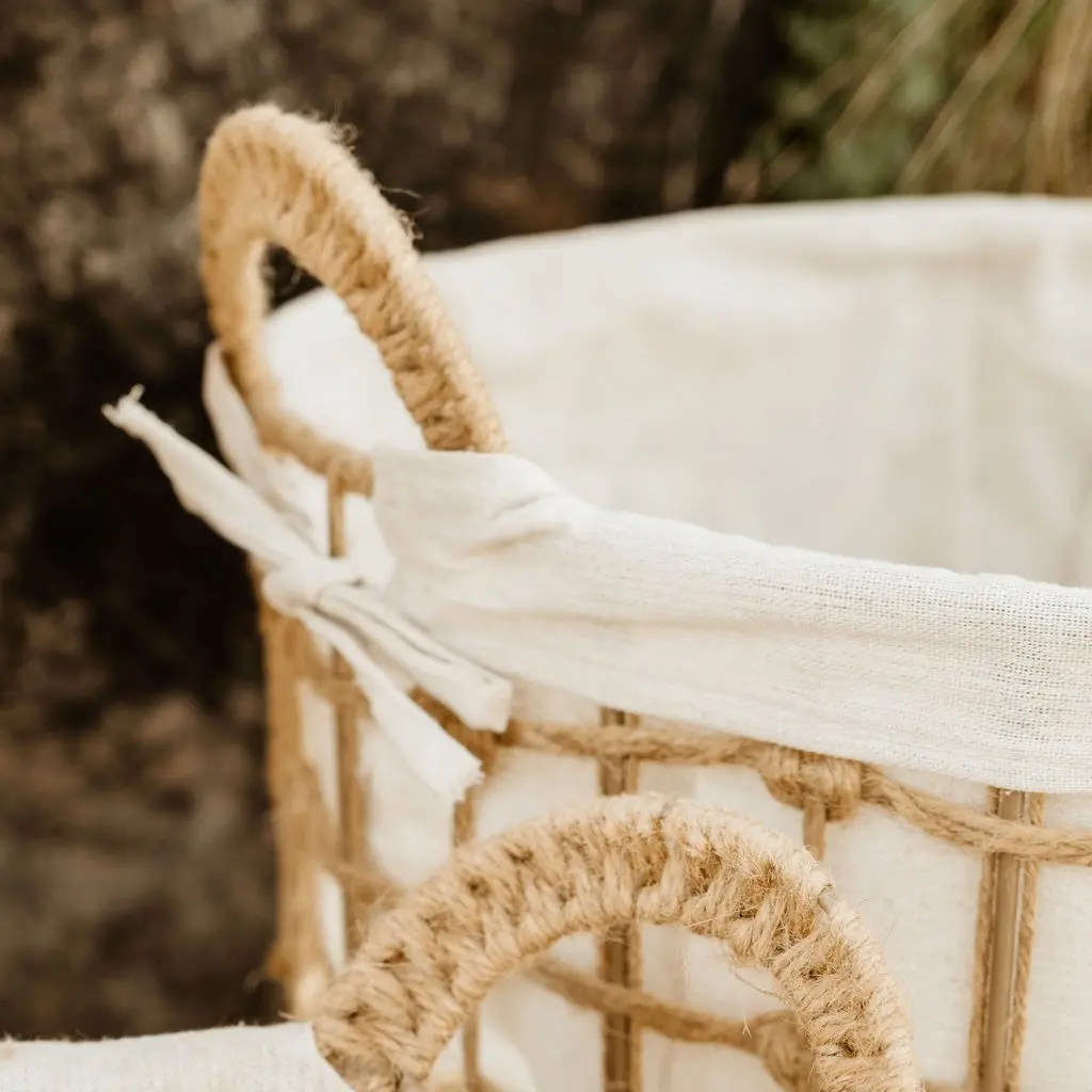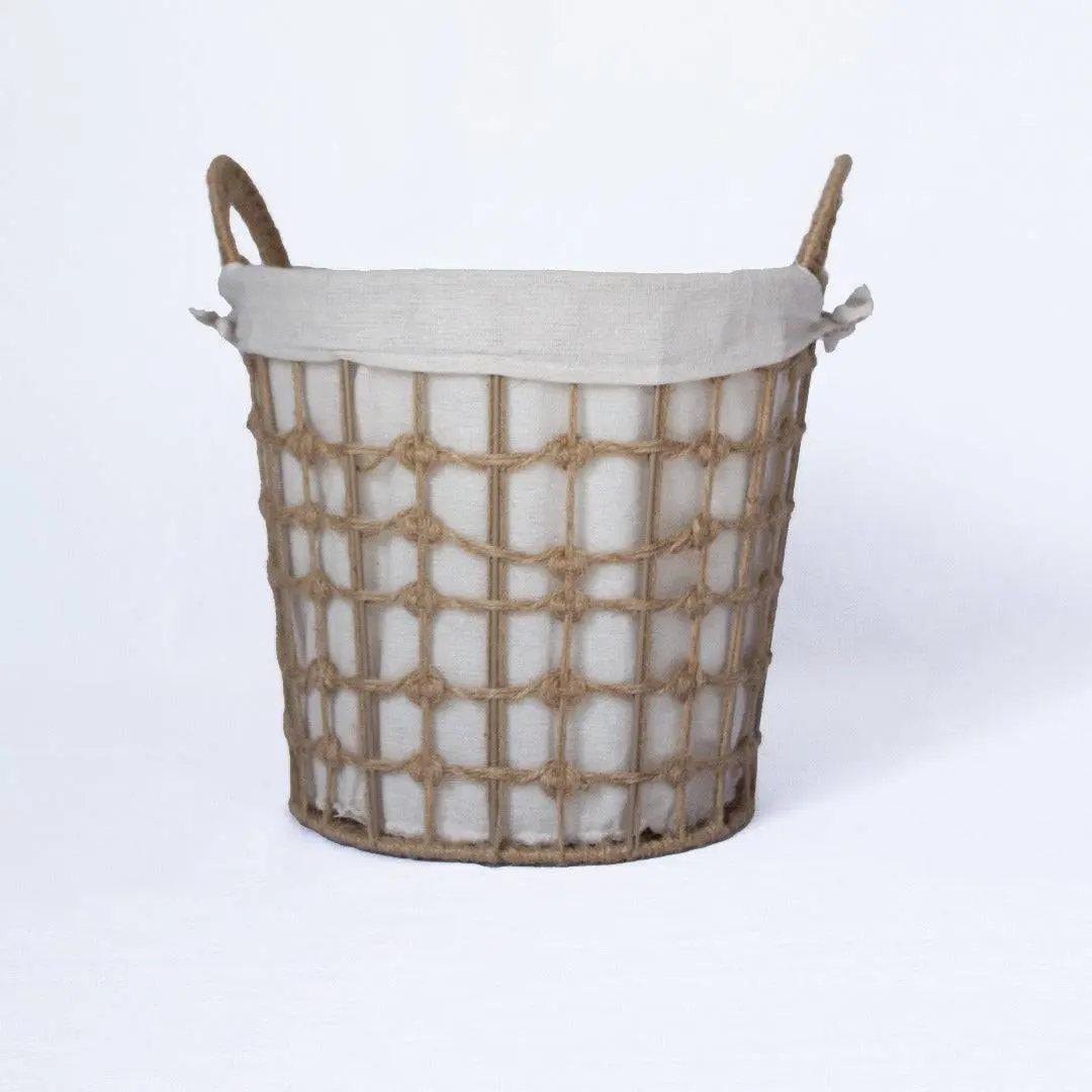 Add a stylish touch to your home with our Round Hemp Tied Wire Basket with Fabric Inner. Crafted with a beautiful hemp fabric lining, this versatile basket is perfect for organizing paper waste or enhancing the decor of your nursery.