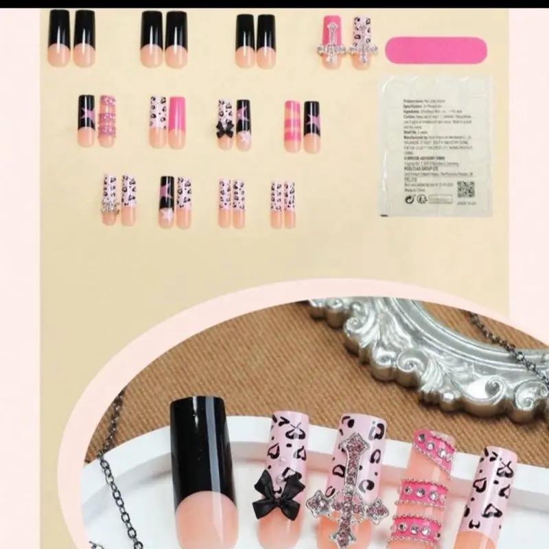 SOO PRETTY!! There is a variety of nails that you can choose from! Yes it comes with glue, alcohol wipes and a nail file! Im not home to show the other stuff I got with it but I also got a beauty blender, extra charms and little scrunchies!