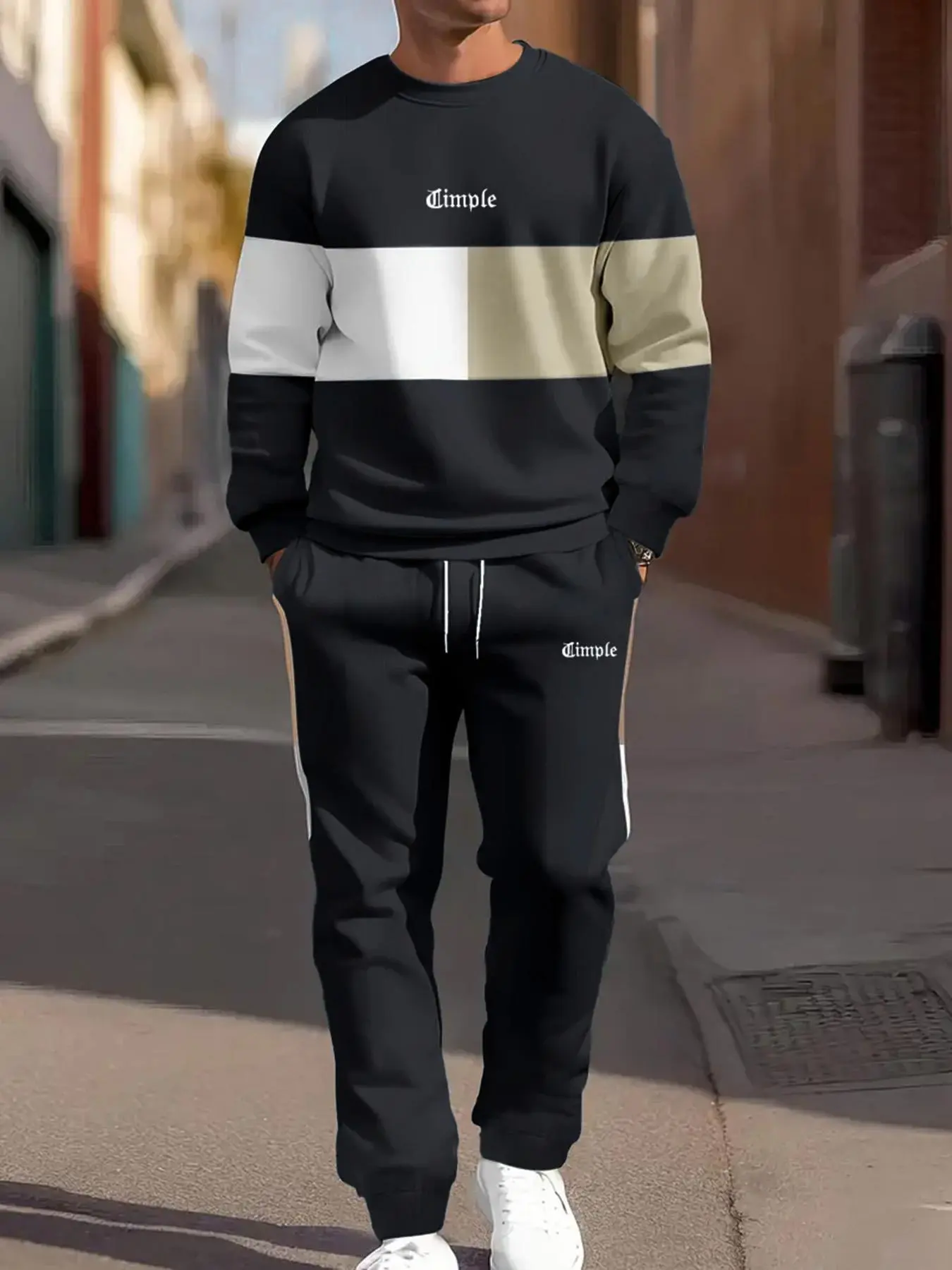 Men's Patchwork Letter-Print Sweatshirt & Drawstring Waist Sweatpants Set, Casual Round Neck Long Sleeve Pullover & Jogger Pants with Pockets, Matching Two-piece Outfits, Sweatsuit Matching Set for Fall & Winter