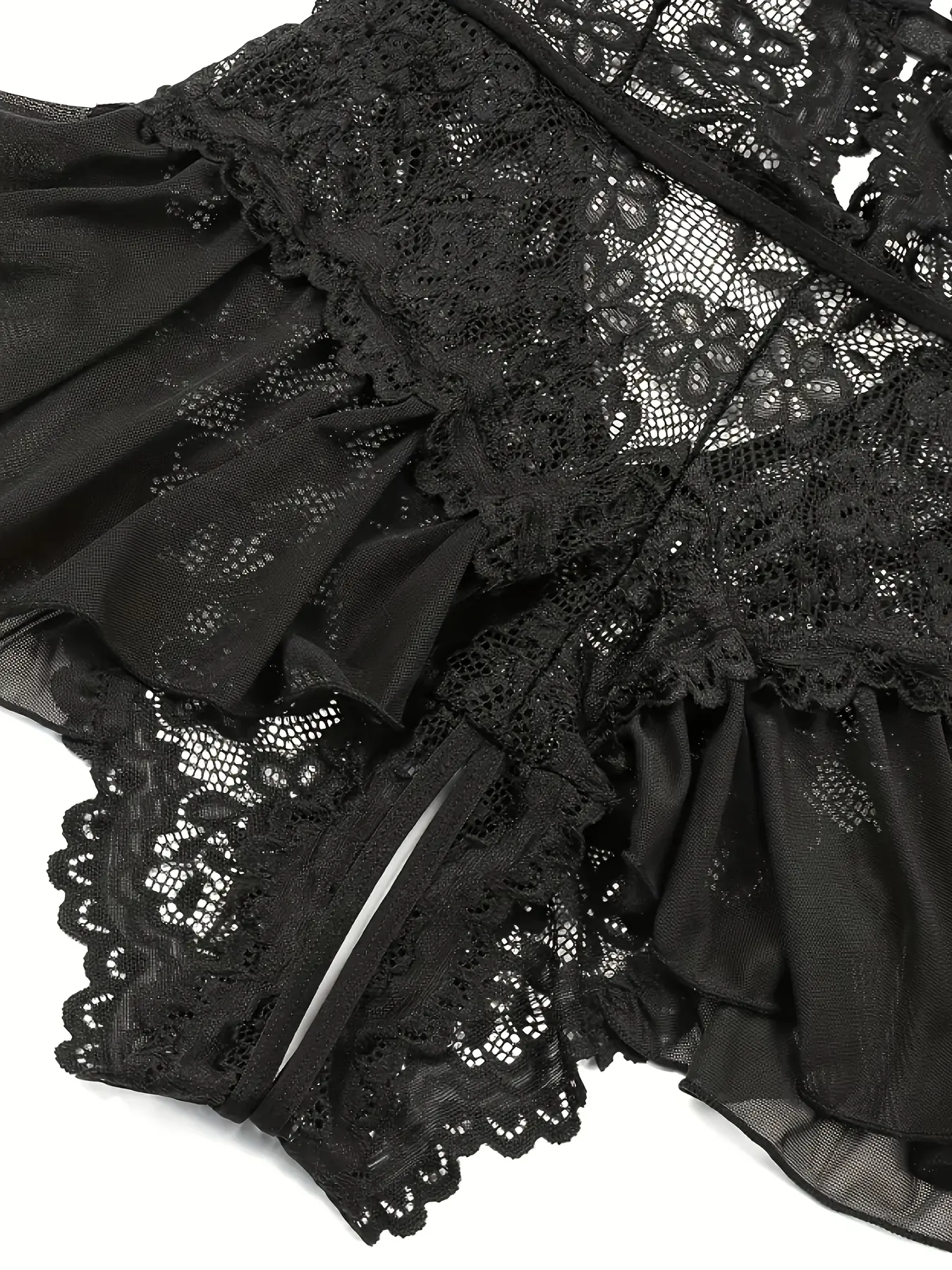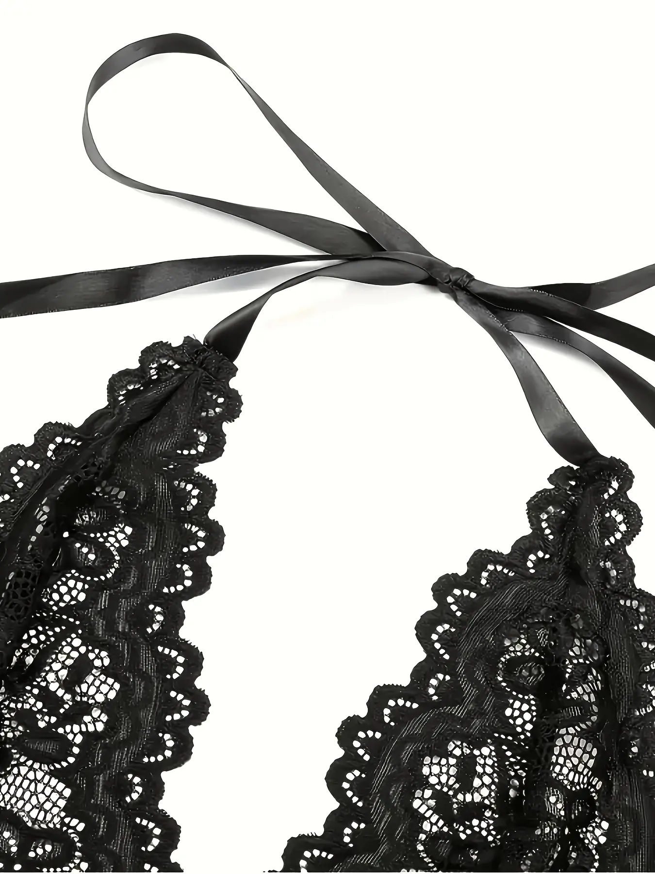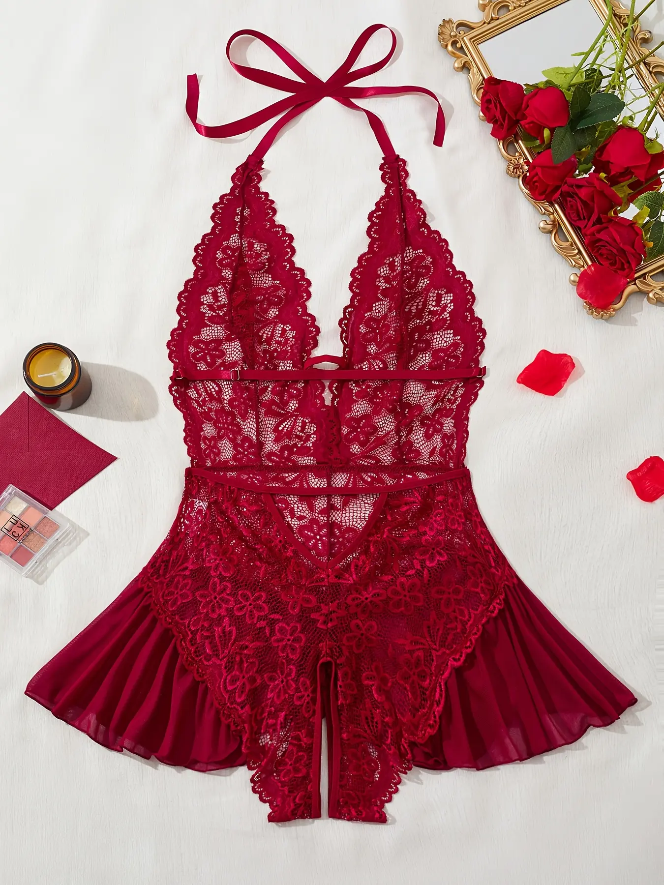 [Plus Size] Sheer Halter Neck Floral Lace Bodysuit, Sexy Backless Tie Back Deep V Neck Open Crotch Design Bodysuit, Women's Sleepwear & Loungewear Lingerie for All Seasons