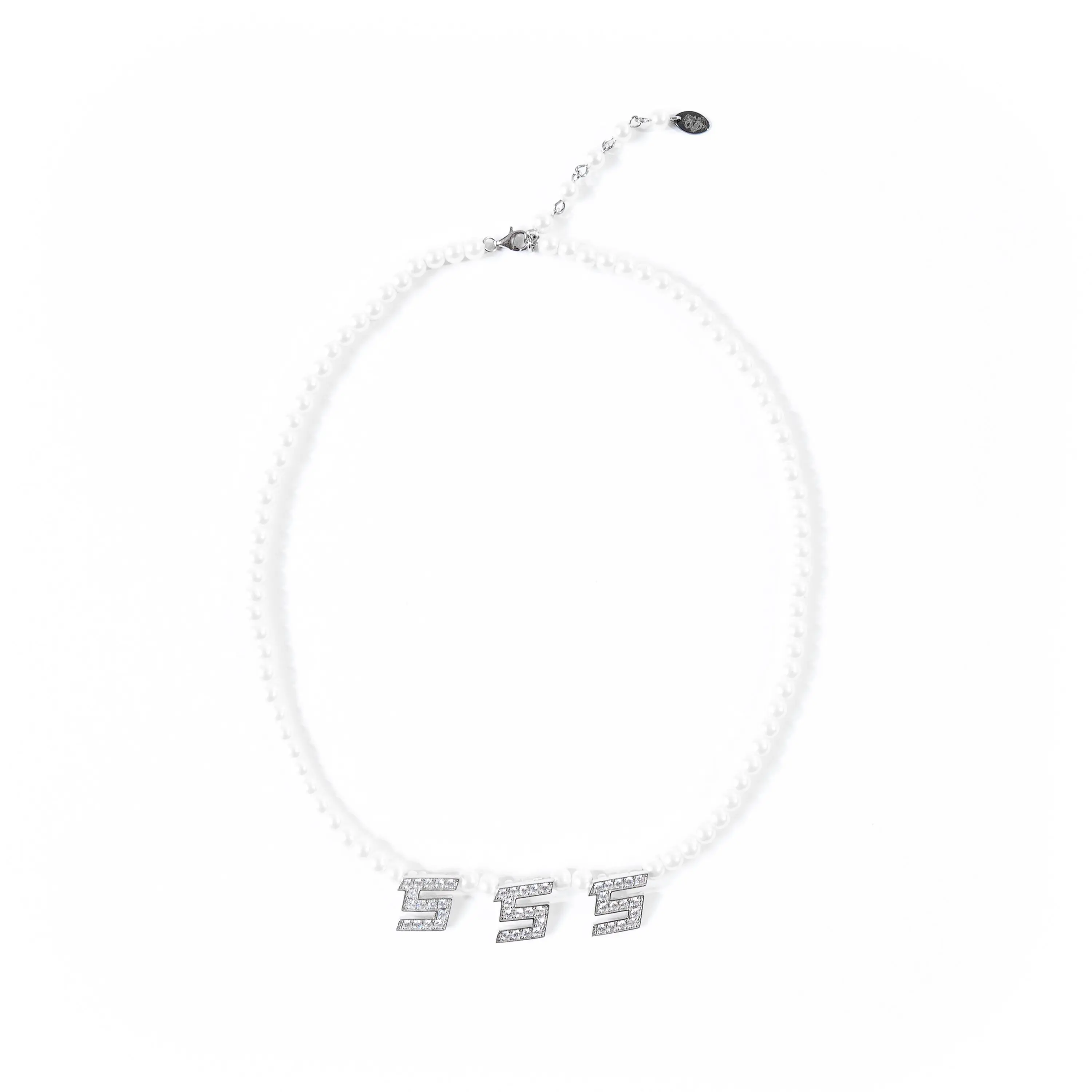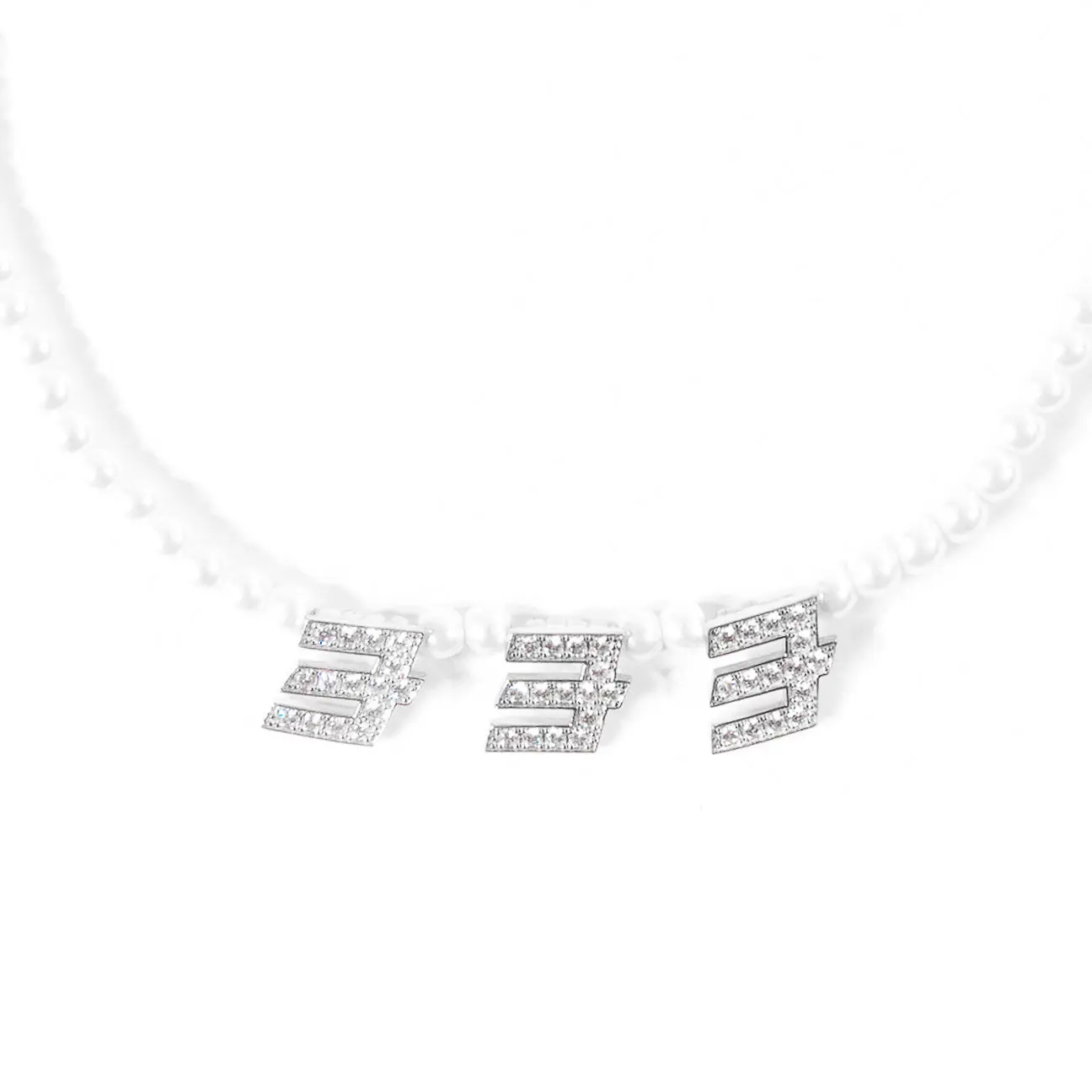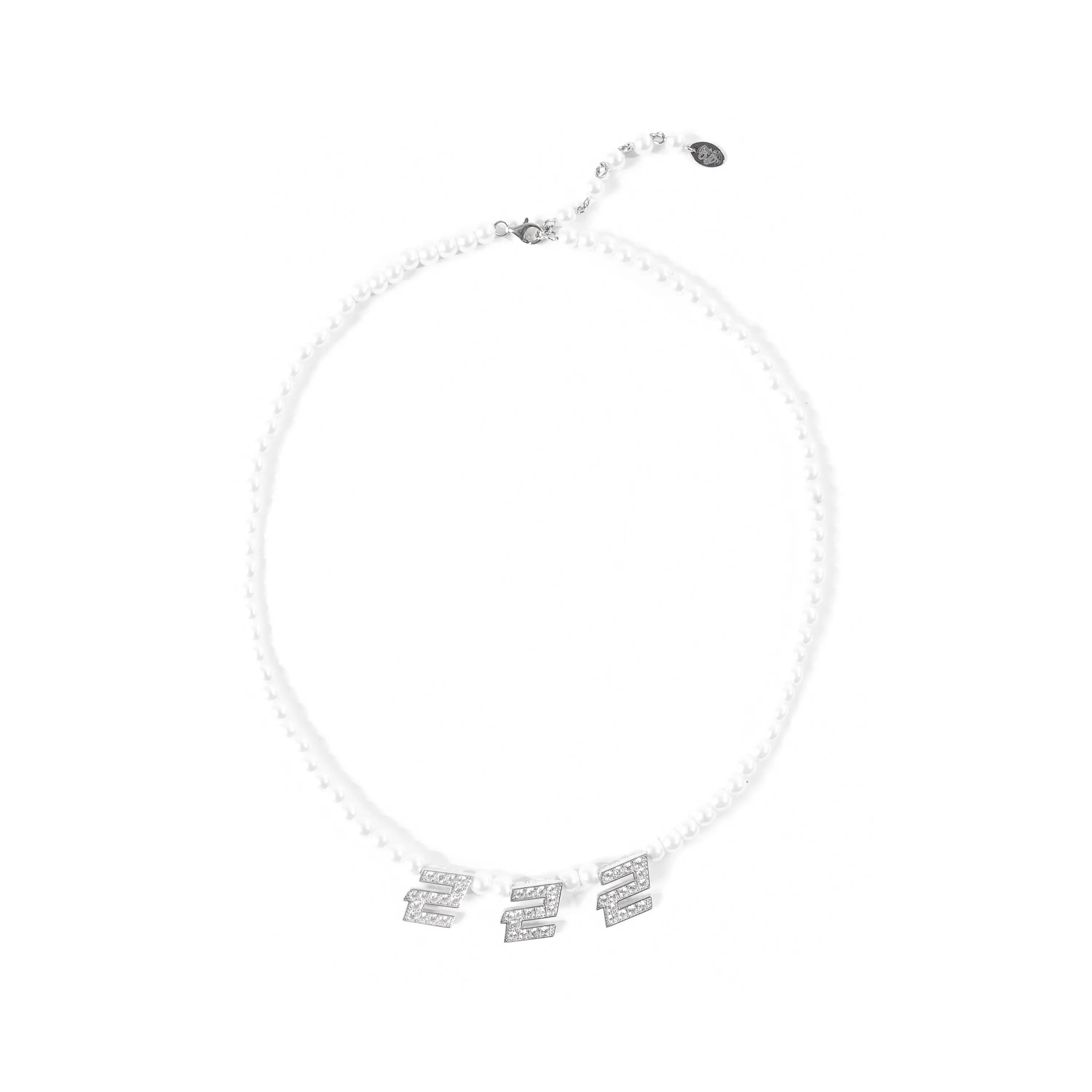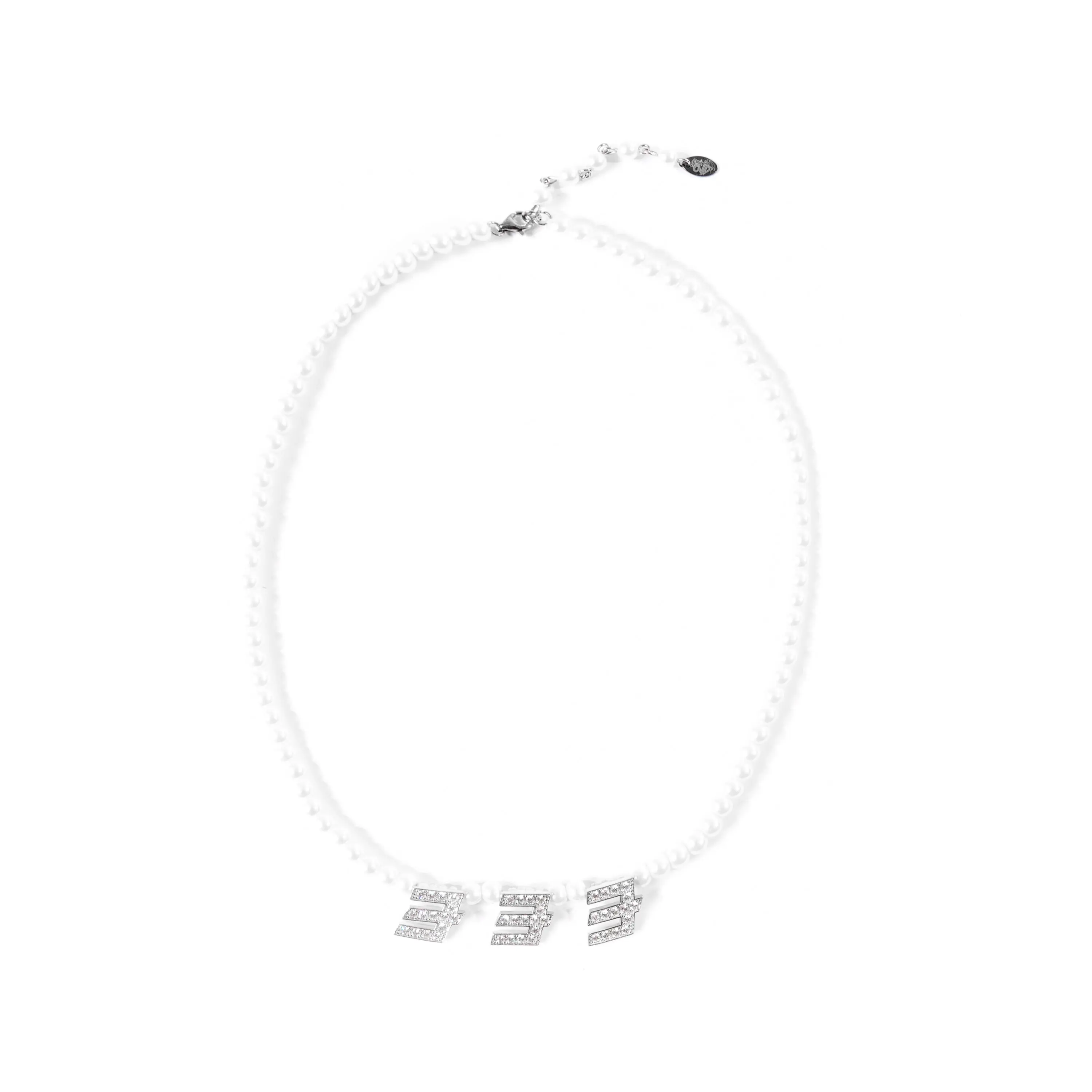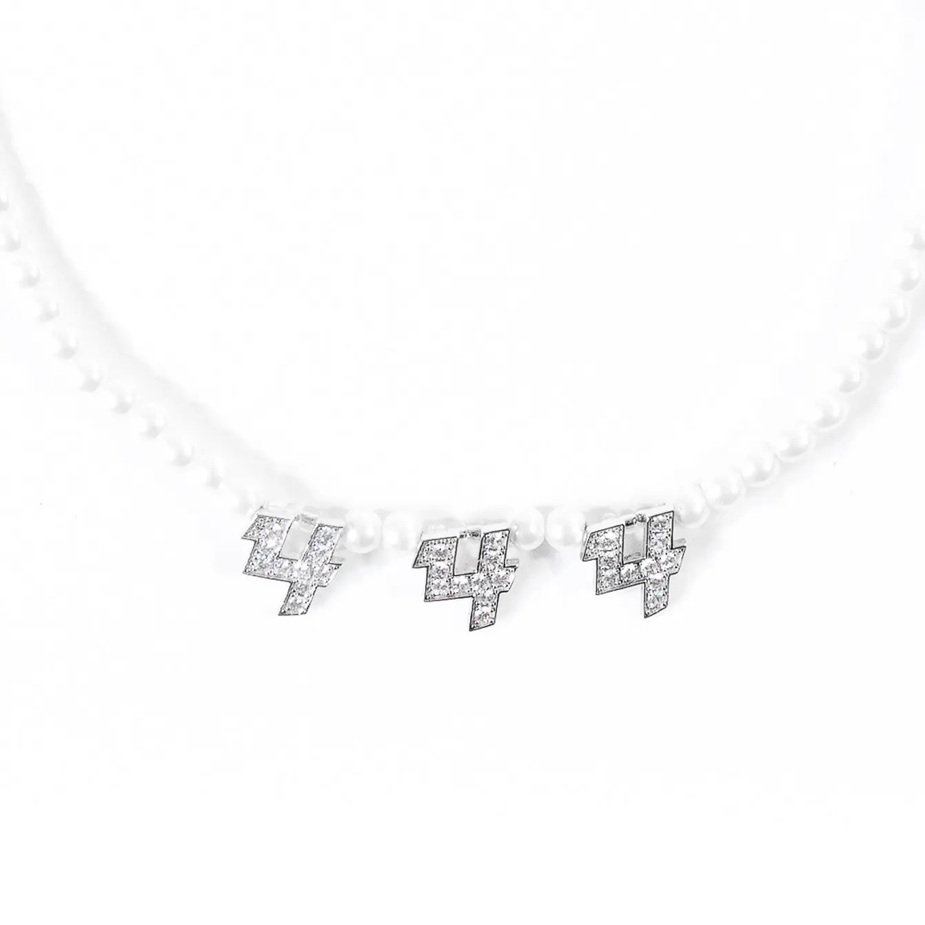 a necklace made 444 protection, love, & fortune. made with .925 sterling silver + cubic zirconia crystals + vegan pearls. one size fits all.