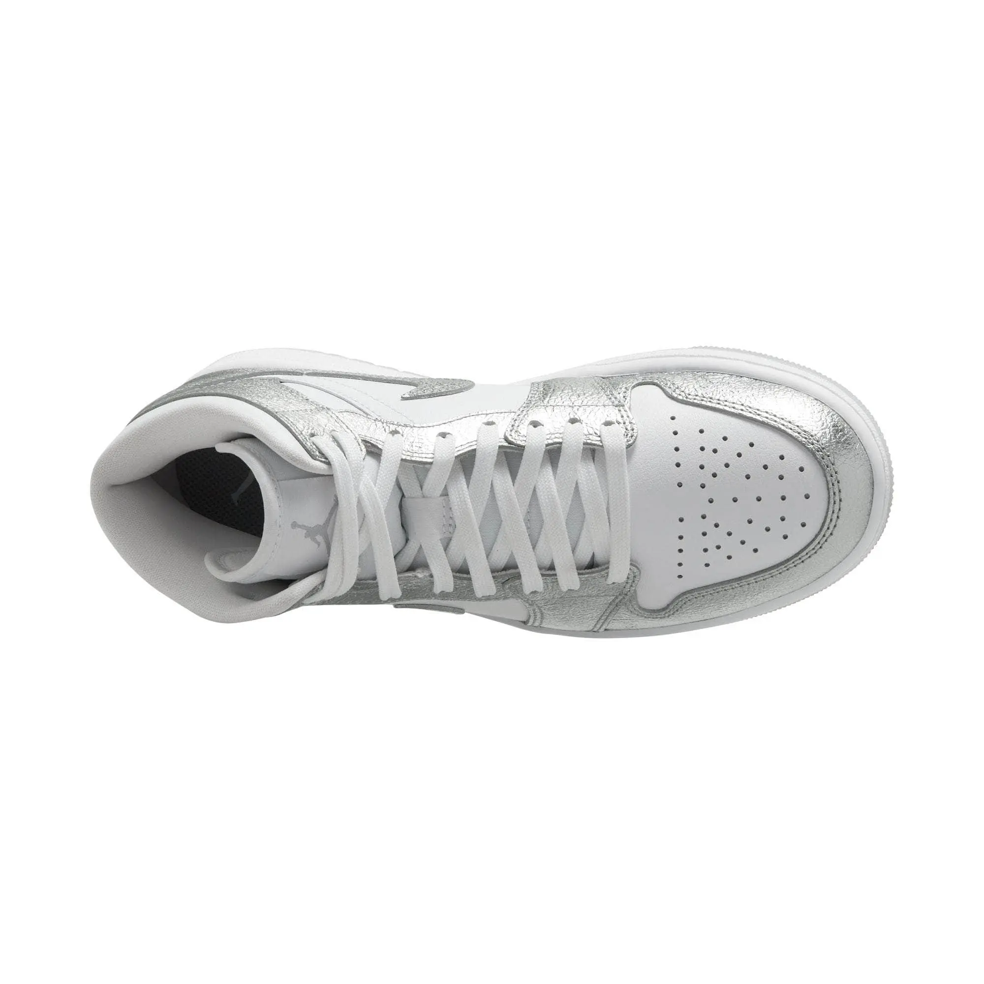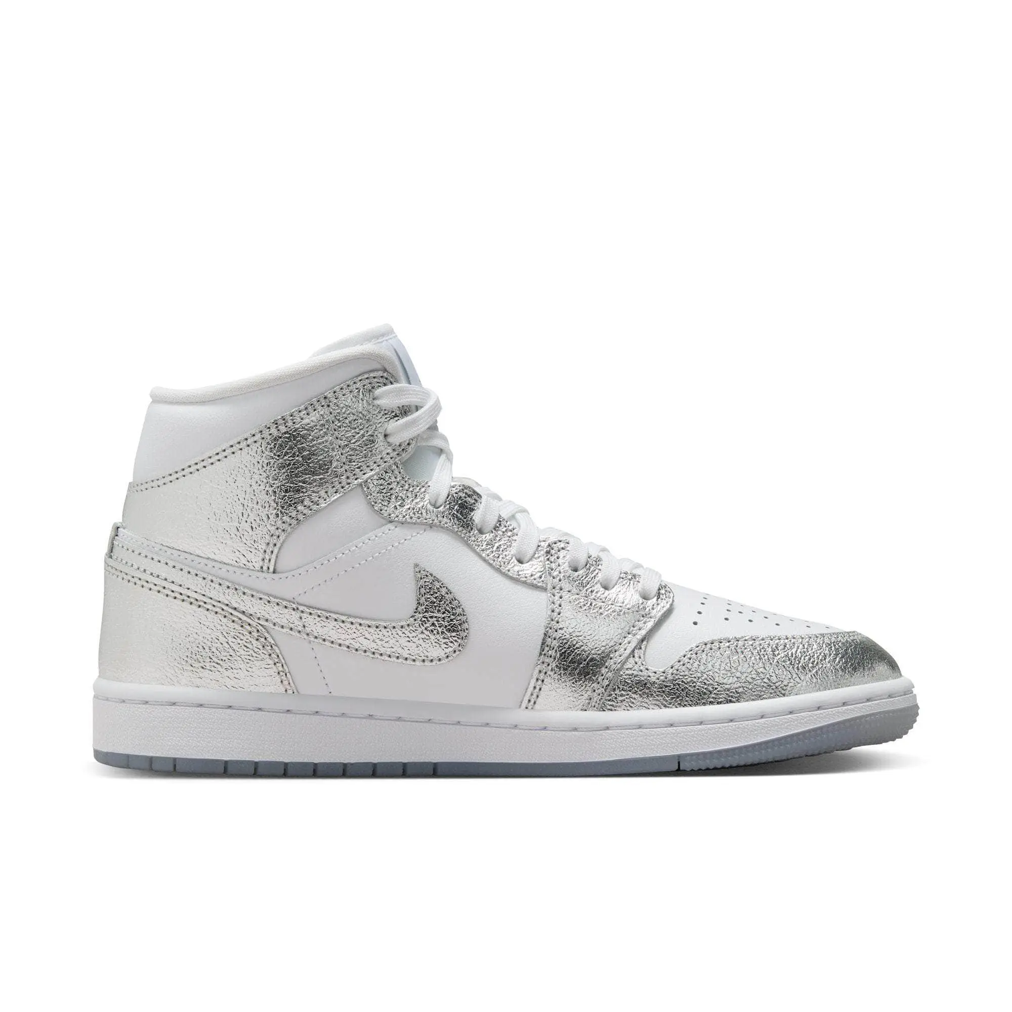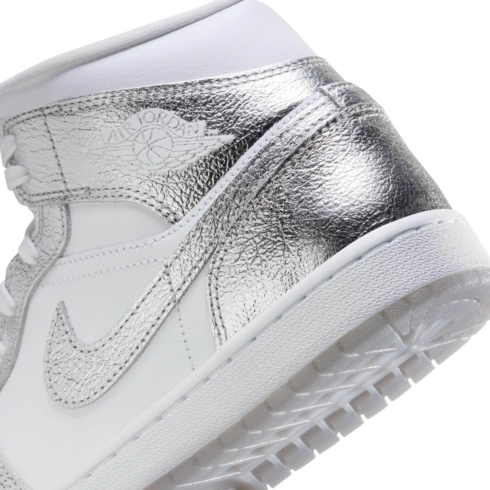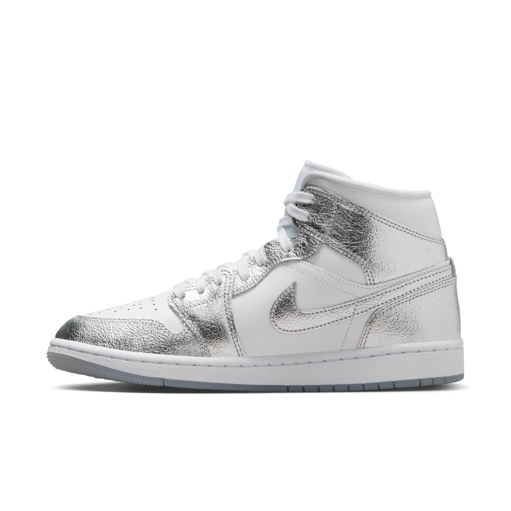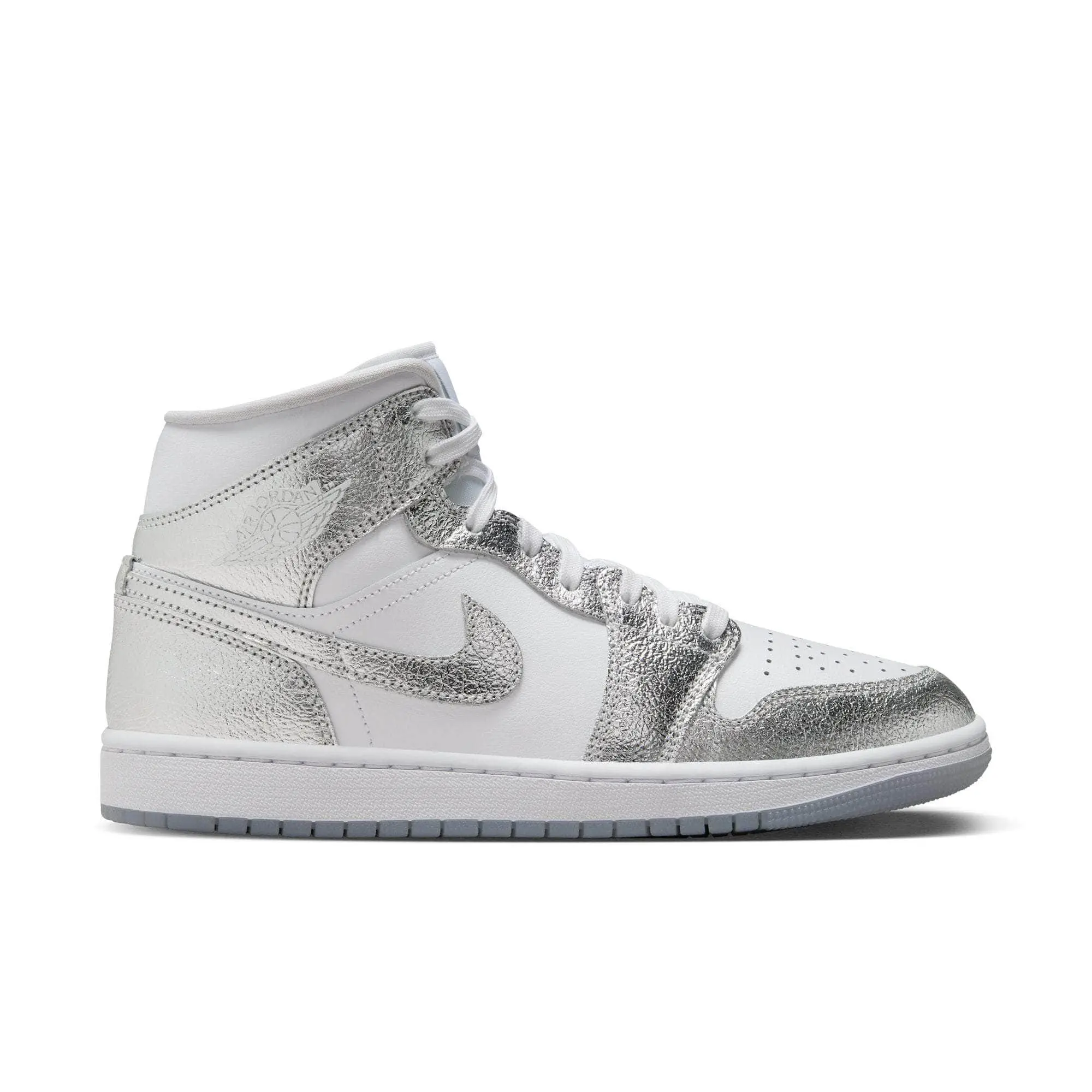 The shoe that started it all gets some sparkle in this stunning iteration of the AJ1. The iconic mid-top silhouette glows up with a dazzling, chrome-like upper that catches eyes and turn heads.
