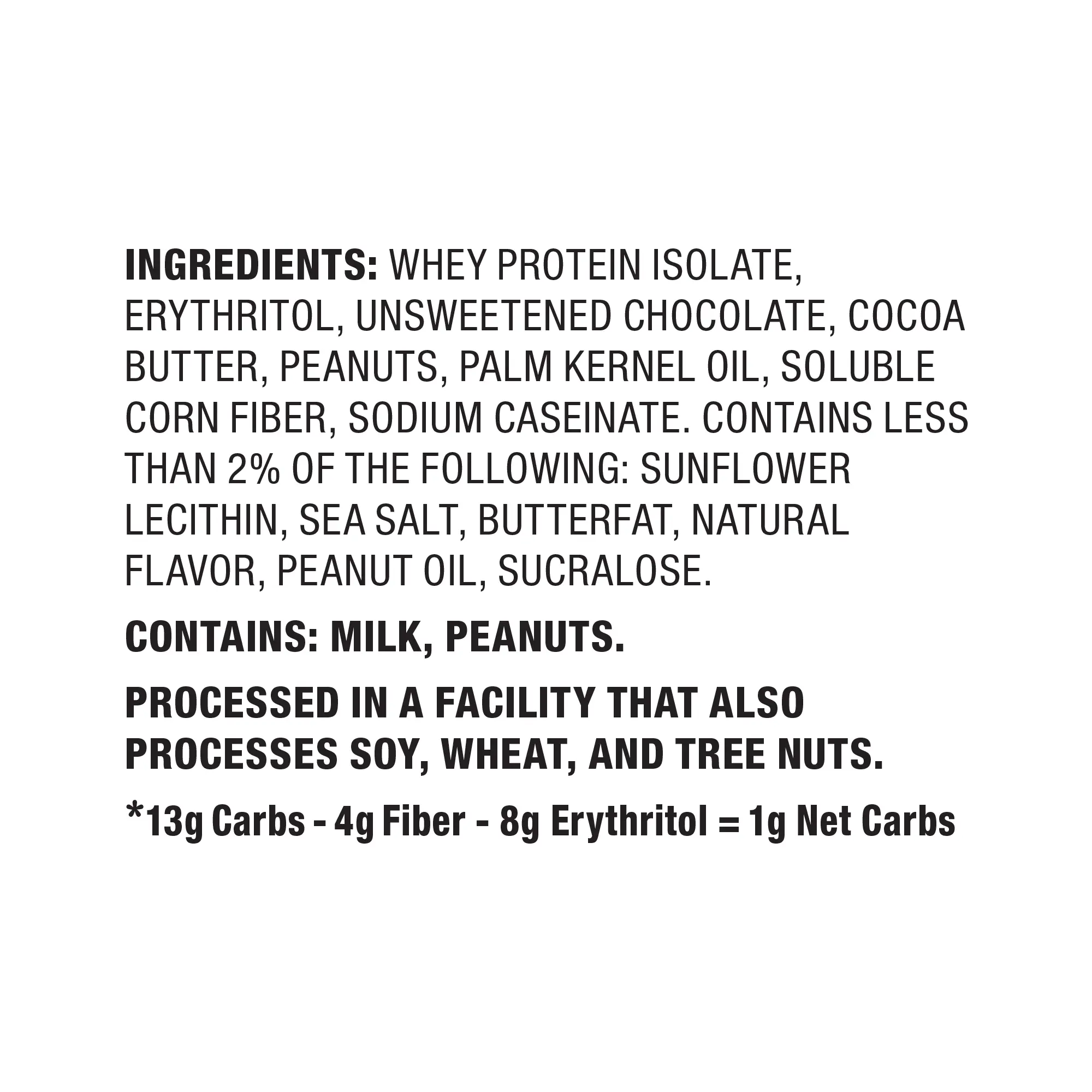 Whey Protein Isolate,Erythritol,Unsweetened Chocolate,Cocoa Butter,Peanuts,Palm Kernel Oil,Soluble Corn Fiber,Sodium Caseinate. Contains less than 2% of the following: Lecithin (Sunflower and/or Soy Lecithin),Sea Salt,Butterfat,Natural Flavor,Peanut Oil,Sucralose.