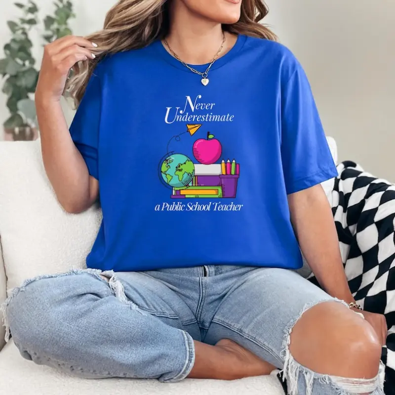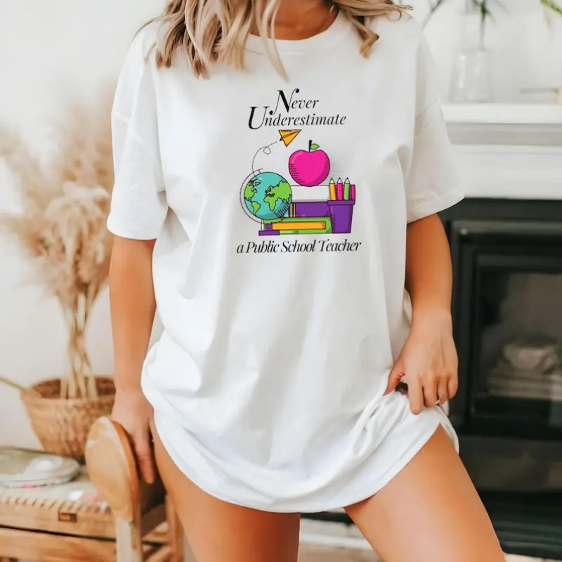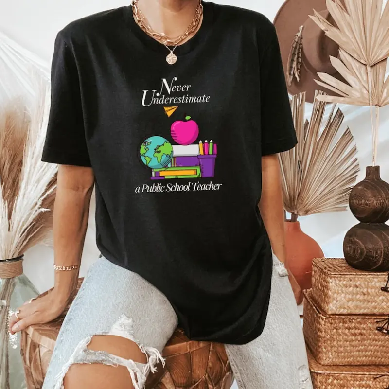 Never Underestimate a Public School Teacher Colorful Kamala Harris Shirt | Harris Walz 2024 Rally Merch | Tim Walz DNC Quote | Educator Tee