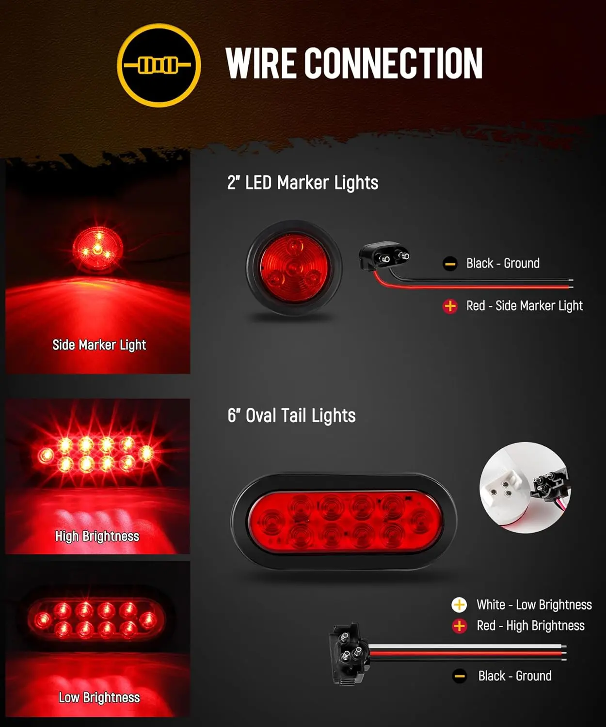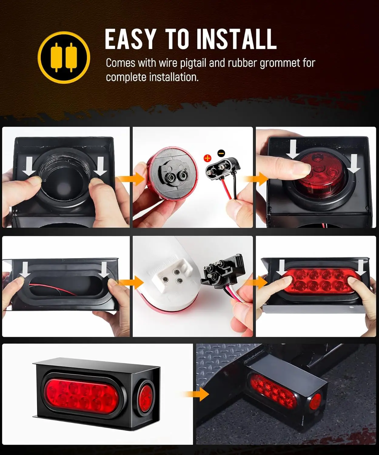 ·【Package Include】2 - Welded Light Mount Boxes (one left, one right); 2 - 6" Oval Red LED Trailer Tail Lights ; 2 - 6" Light Mounted Rubber Grommets; 2 - 3 Wire Seal Light Plug Pigtails; 2 - 2" Round Red LED lights; 2 - 2" Round Rubber Grommets; 2 - 2 Wire Sealed Light Plug Pigtails