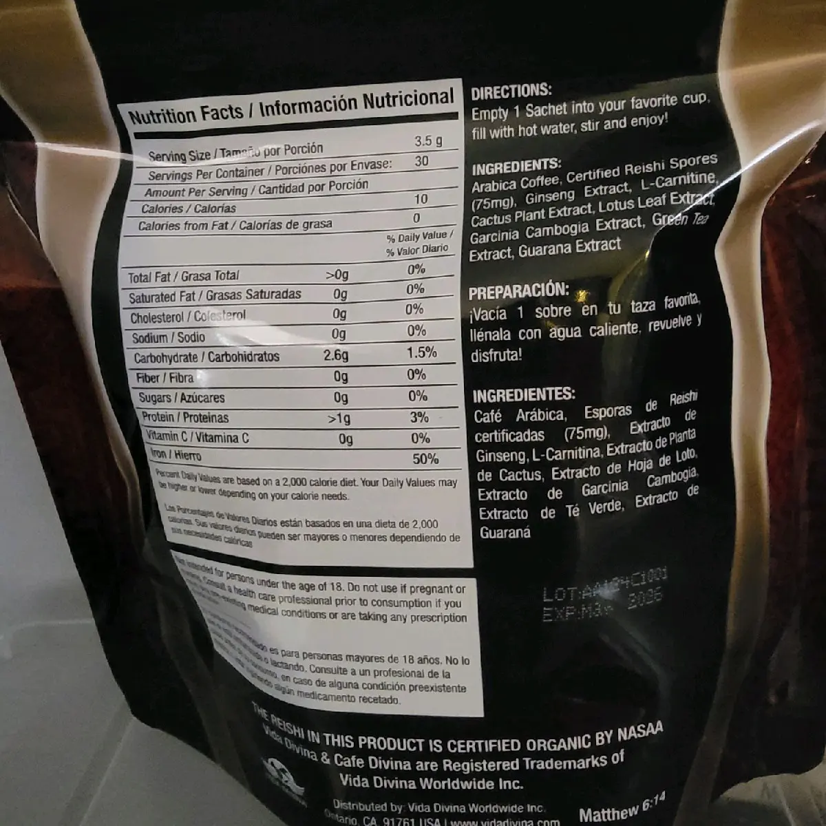 Arabica Coffee, Certified Reishi Spores (75mg), Ginseng Extract, L-Carnitine, Cactus Plant Extract, Lotus Leaf Extract, Garcinia Cambogia Extract, Green Tea Extract, Guarana Extract