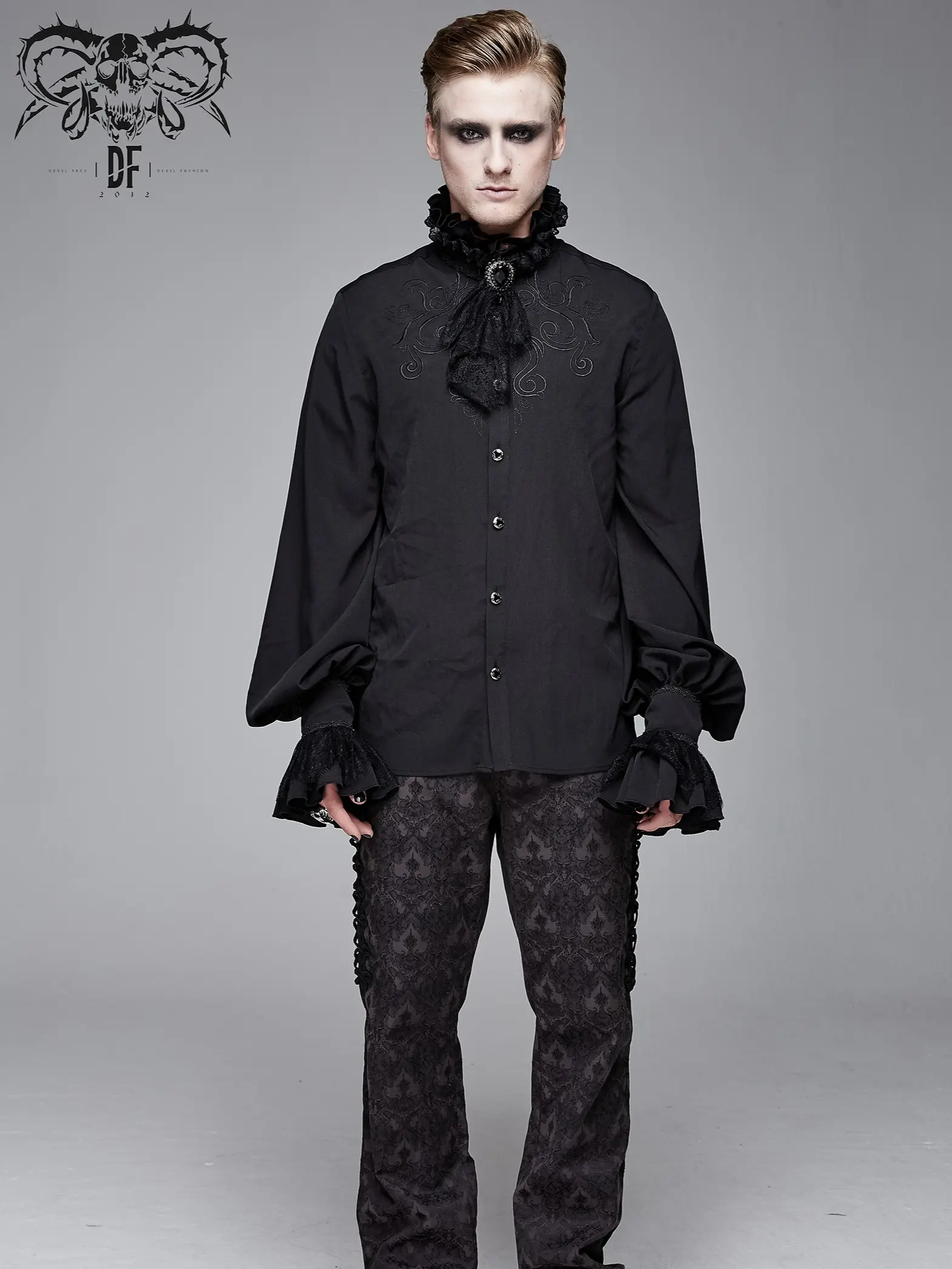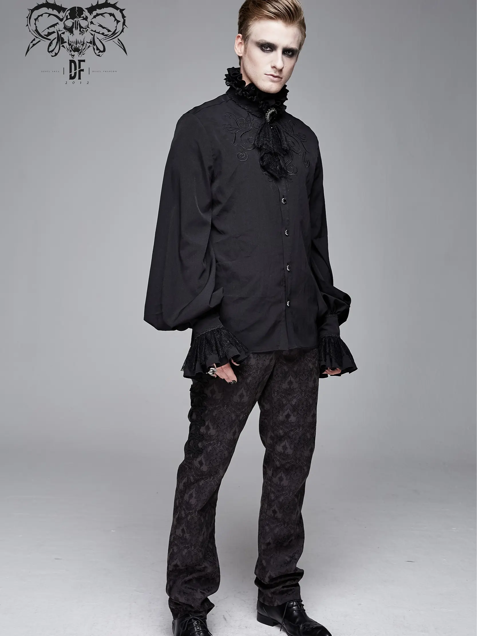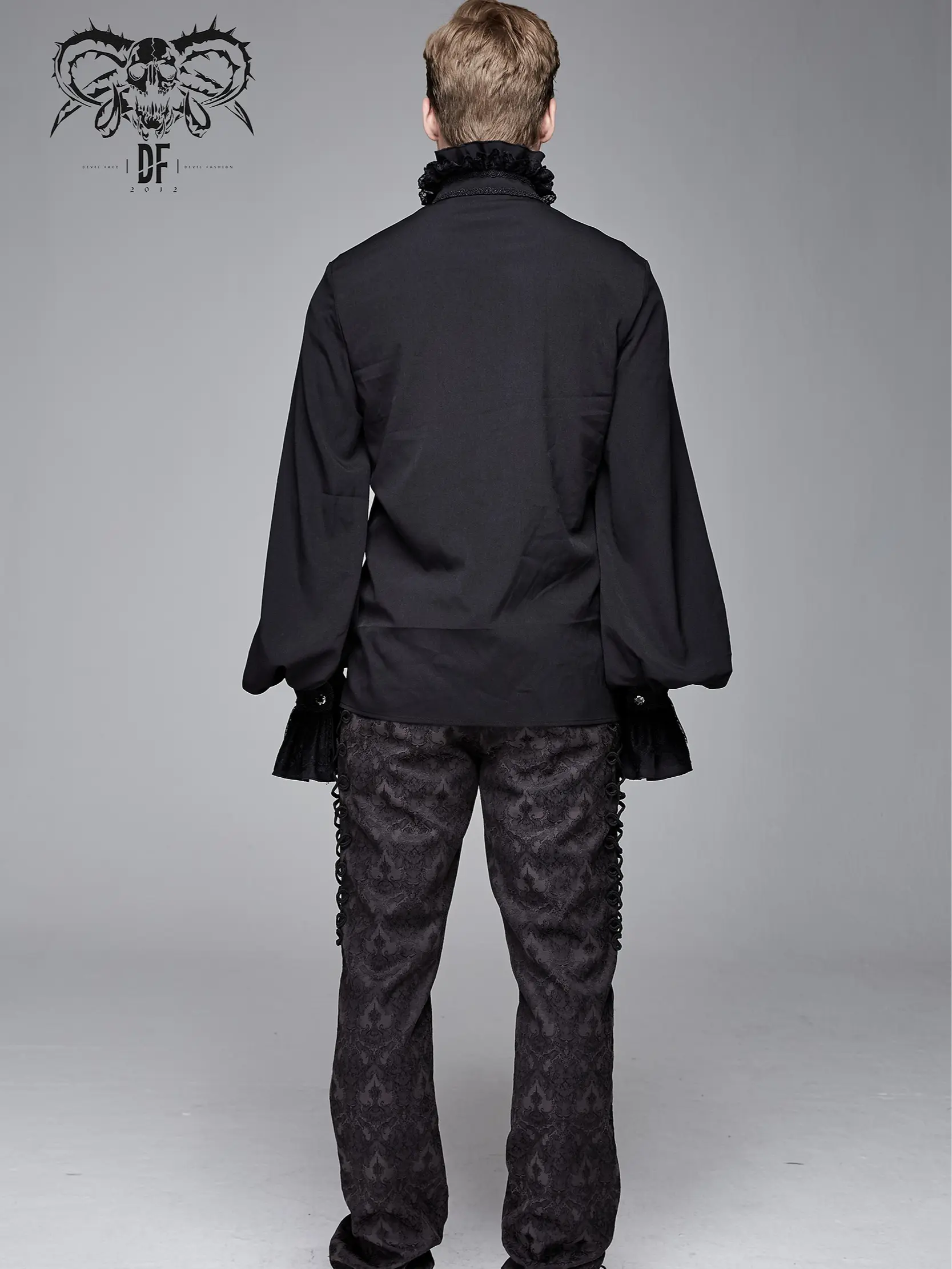 Men's Black Ruffle Shirt Removable Tie High Collar Full Sleeves Groom Tux Top Blouse Vampire Dracula Halloween Costume