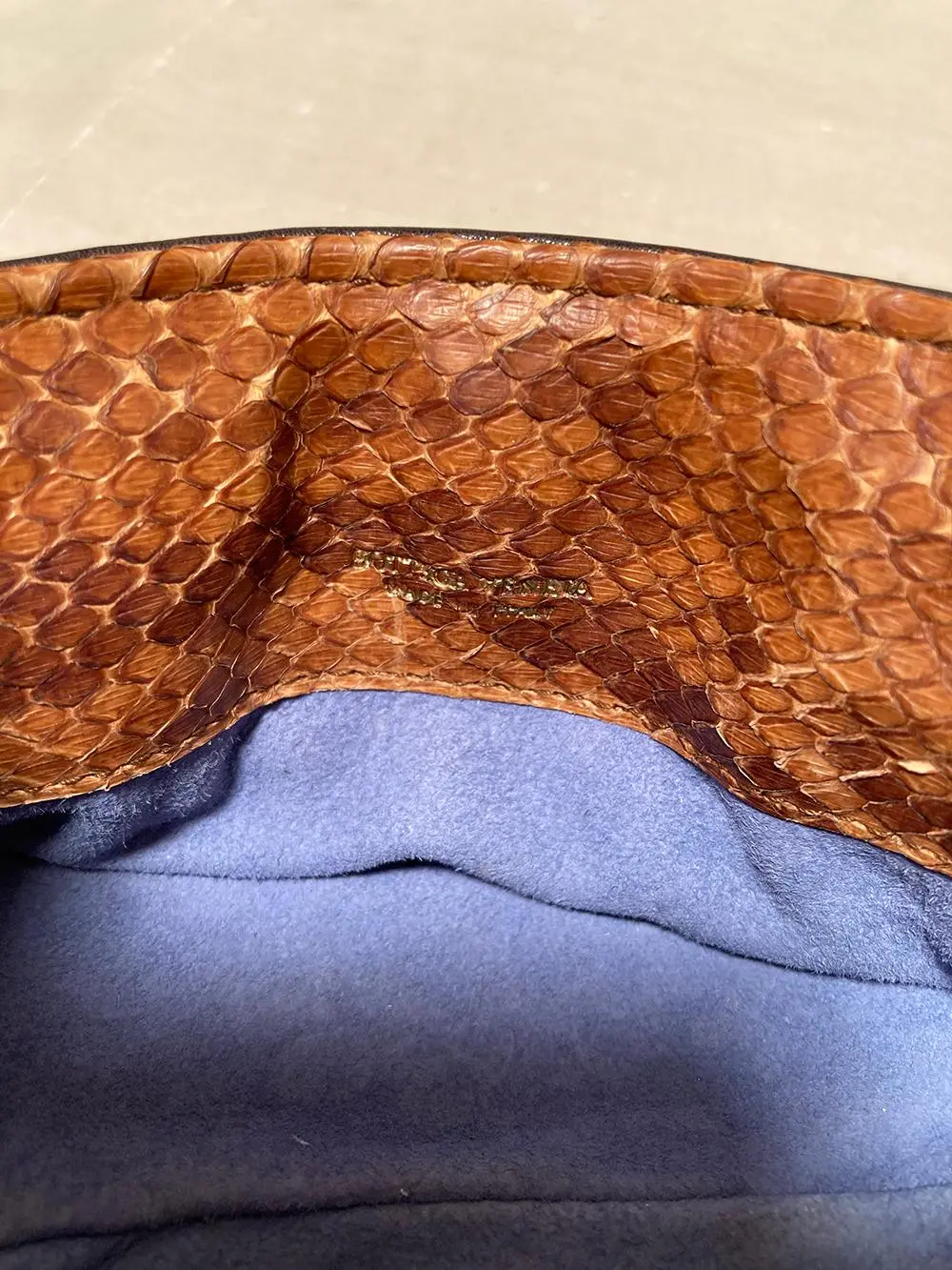 Bottega Veneta Tan Snakeskin Clutch in excellent condition. Tan snakeskn exterior with black burnished edges. Hidden hinge closure with pull tabs opens to a blue suede interior. No stains smells or scuffs. Clean interior. Purchase includes a dust cover. Measurements: 9"x3.5"x3.5" Bottega Veneta Tan Snakeskin Clutch in excellent condition. Tan snakeskn exterior with black burnished edges. Hidden hinge closure with pull tabs opens to a blue suede interior. No stains smells or scuffs. Clean interior. Purchase includes a dust cover. Measurements: 9"x3.5"x3.5"