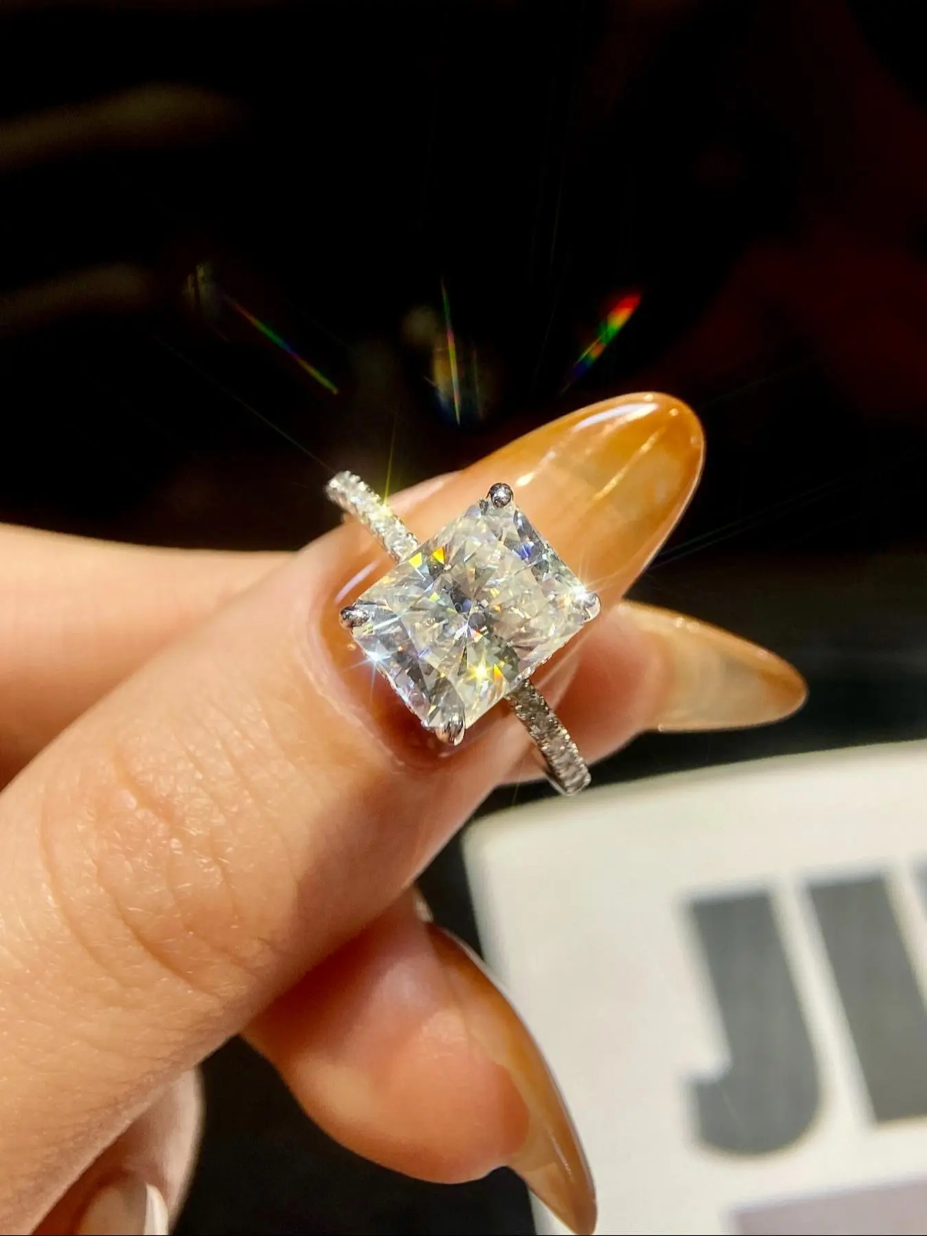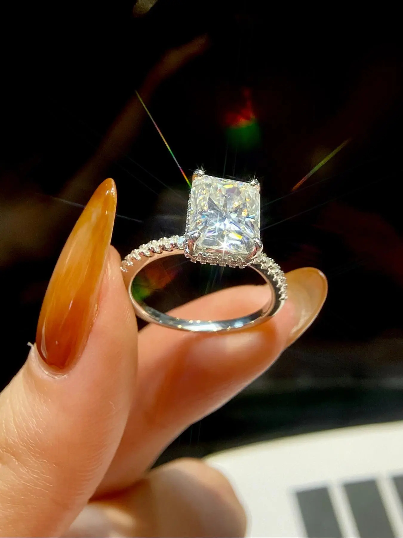 S925 Sterling Silver Synthetic Moissanite Engagement Ring, Rectangle Shaped Ring, Fine Jewelry for Women, Anniversary Gift