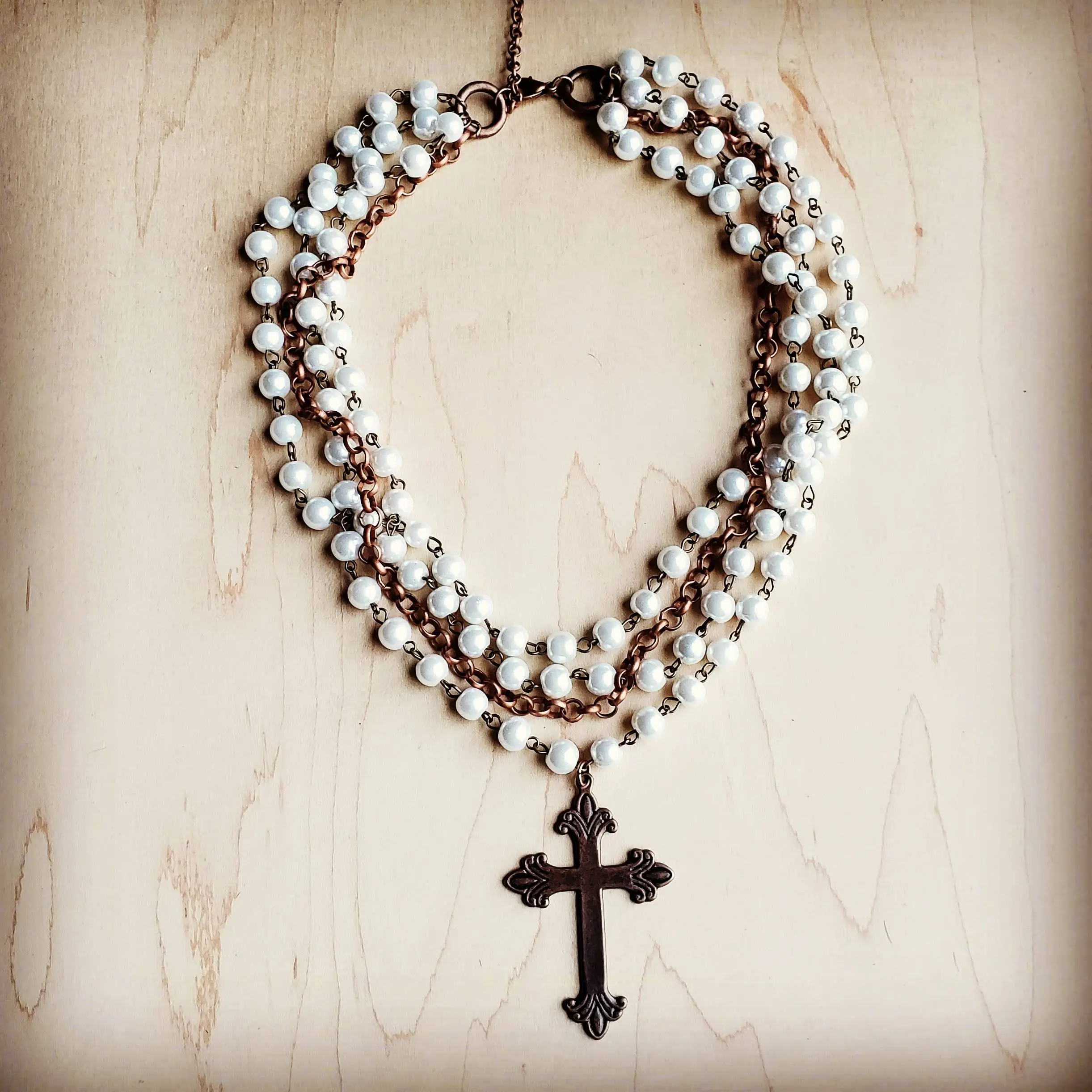Pearl and Copper Beaded Collar Necklace with Copper Cross 114G