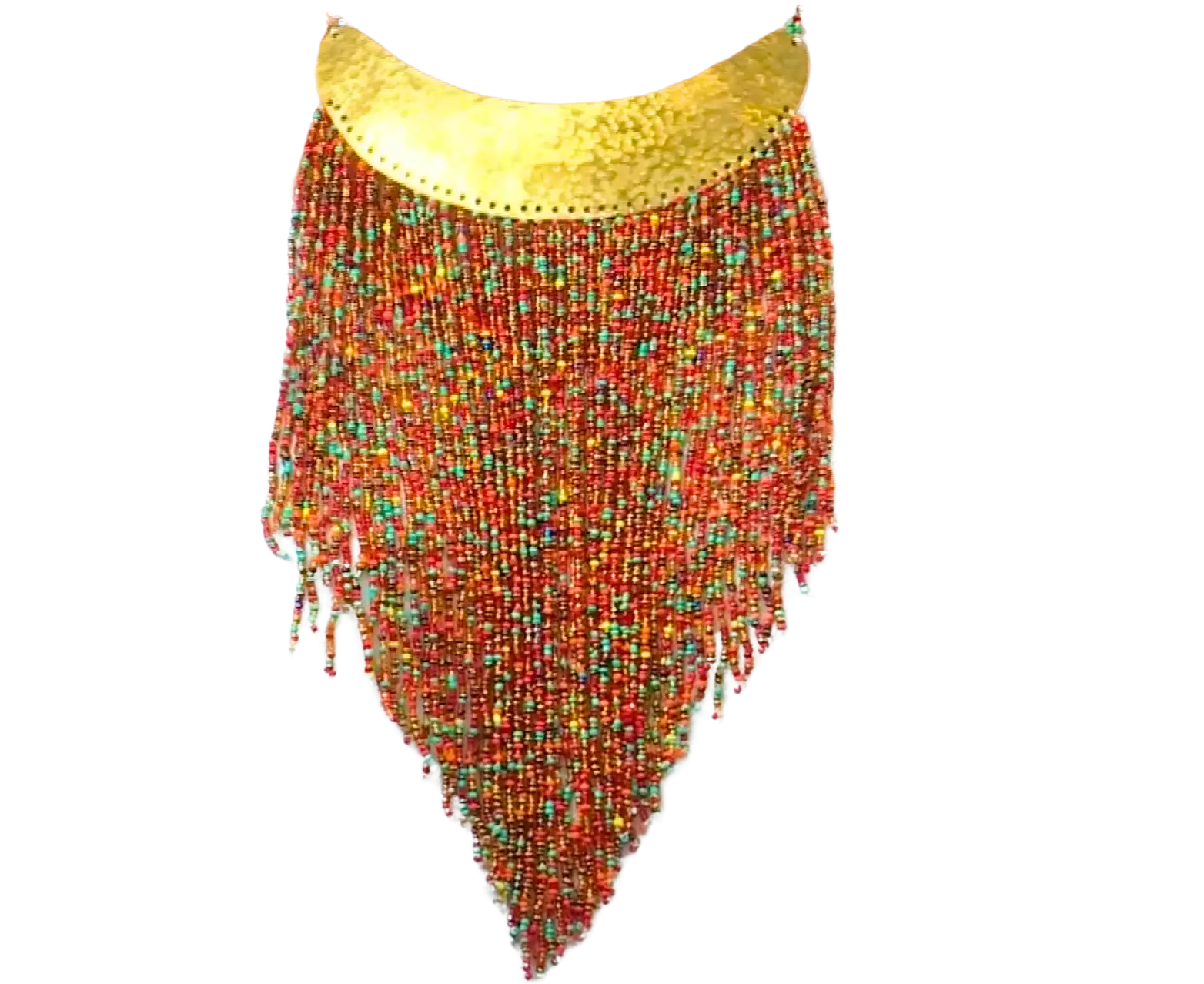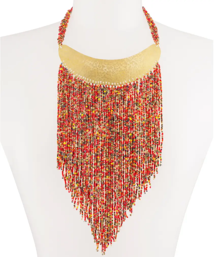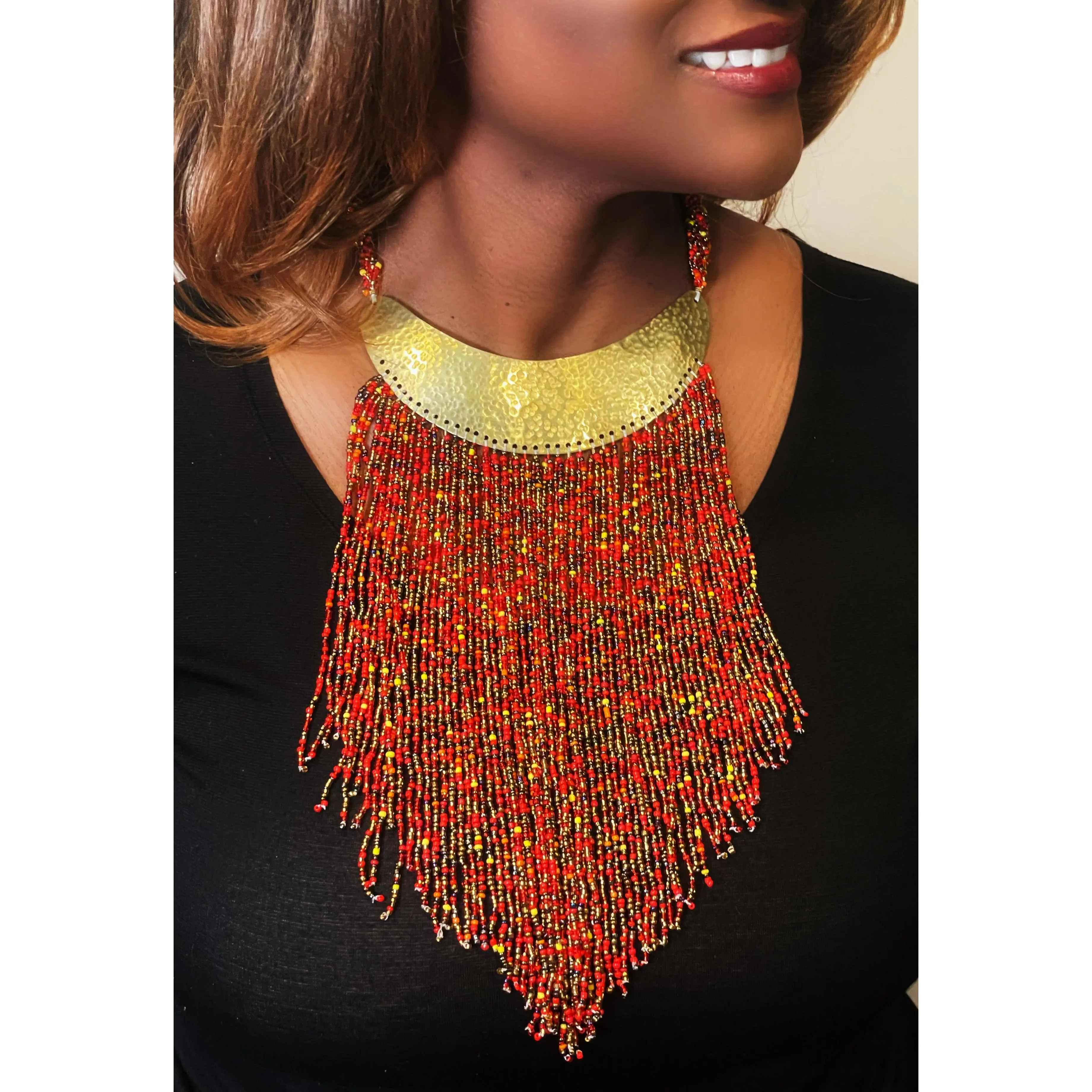 Stunning bib necklace with signature "v" shape design by KENDI AMANI. Enhanced with our signature hammered gold-tone brass collar for a truly royal effect. A shorter version of the Maasai Necklace-Long.