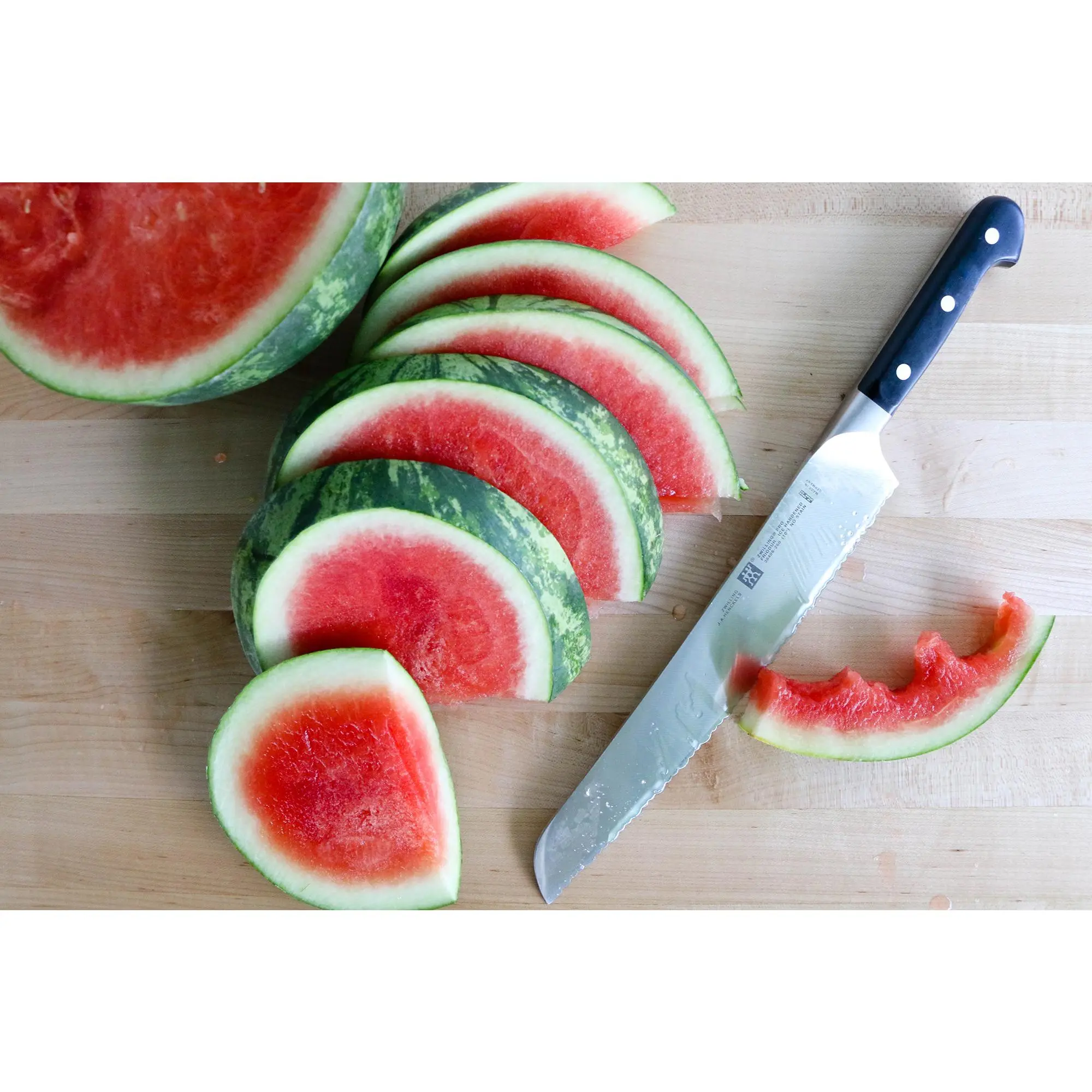ZWILLING Pro is the most user-friendly knife available to market. The unique blade shape and ergonomic bolster are the result of years of experience in knife making, and the rigorous study of how knives are used. A unique curved bolster supports the professional pinch grip, with thumb and index finger on the blade, for safe cutting and less fatigue. The blade was redesigned with a broader curve in the front to facilitate the rocking motion of Western cutting, while the straight back is ideal for the Asian chopping motion. The full length of the blade can be used when cutting and can be sharpened from bolster to tip Designed in Italy by Matteo Thun and made in Germany by ZWILLING J.A. Henckels, the company that sets the standard for exceptional cutlery worldwide. The ZWILLING Pro 10" Ultimate Bread Knife features scalloped serrations to ease cutting, minimize tearing and crumbs, and to maintain lasting sharpness. The combination of the serration and blade length allows for maximum performance when handling large loaves. Raised handle for knuckle clearance and easier slicing.