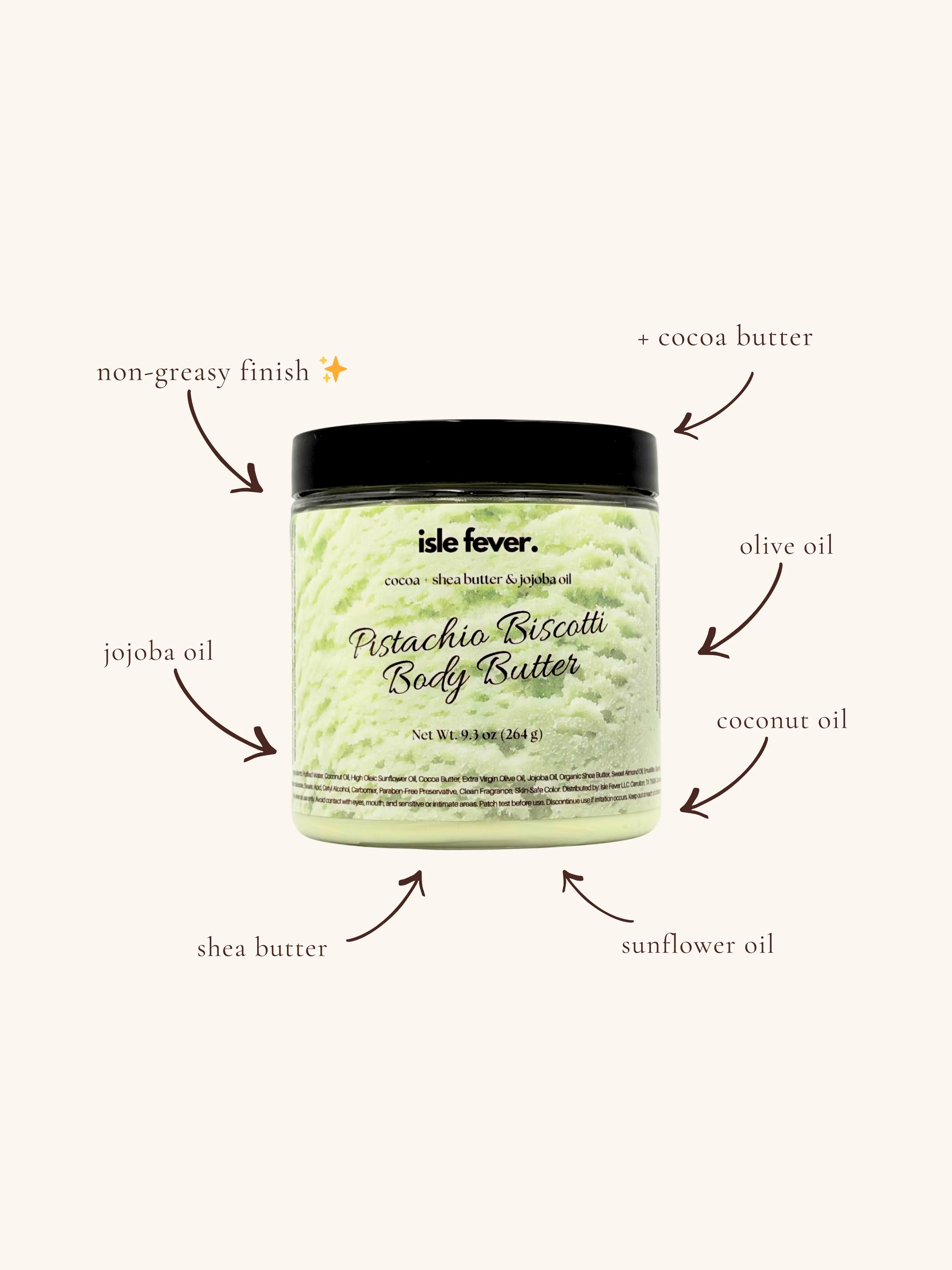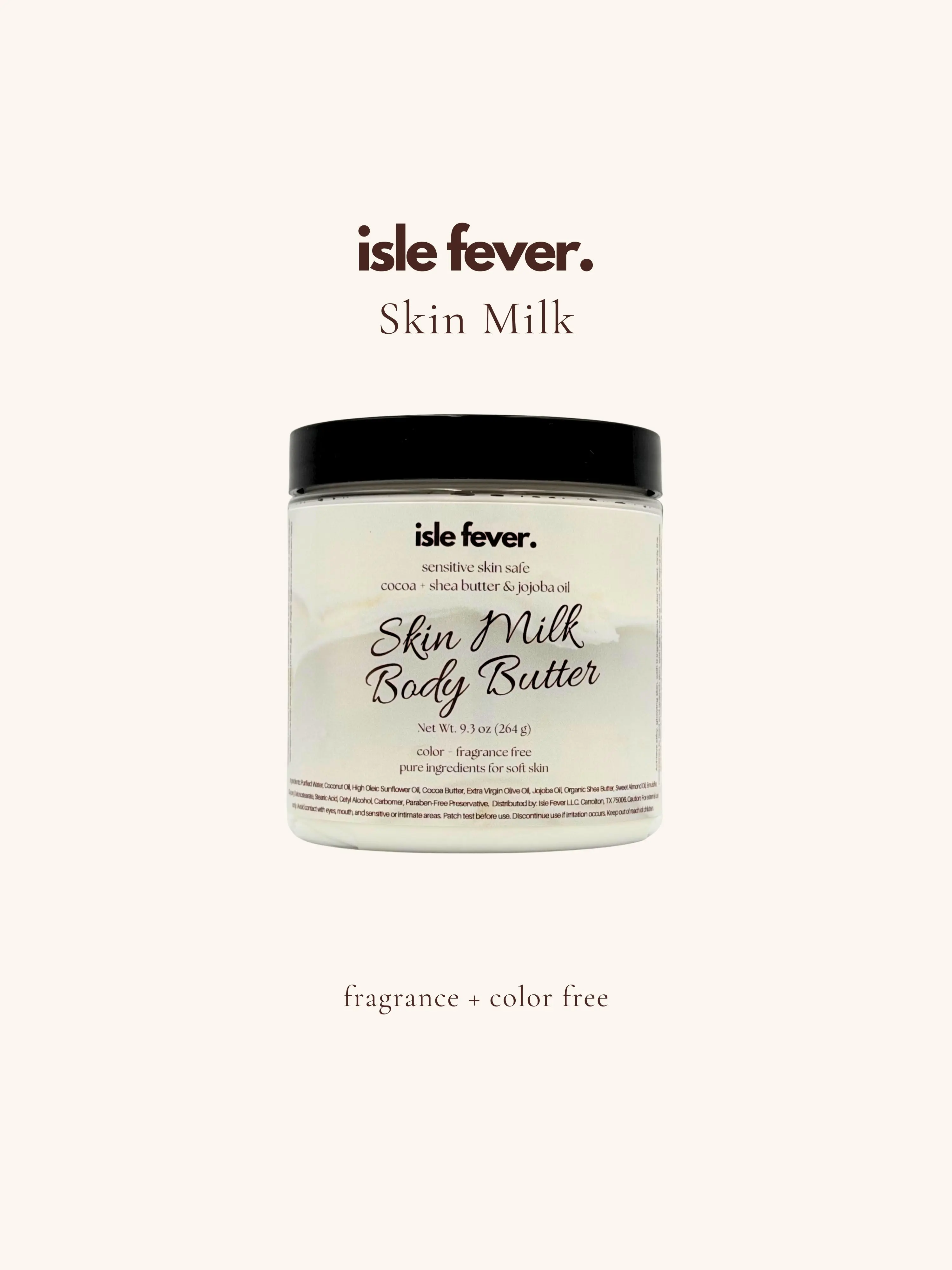 Water (Aqua), Coconut Oil, Sunflower Oil, Cocoa Butter, Olive Oil, Emulsifying Wax, Glyceryl Monostearate, Shea Butter, Stearic Acid, Jojoba Oil, Cetyl Alcohol, Carbomer, Phenoxyethanol (and) Caprylyl Glycol (and) Sorbic Acid.