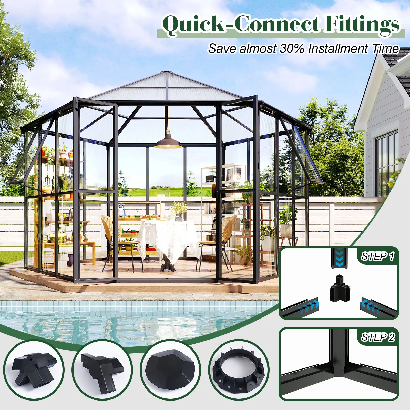 ·Quick-Connectors: The greenhouse kit frame connection adopts quick adapters to make the installation more convenient. Expect 3 people to spend 10 hours to complete the installation.