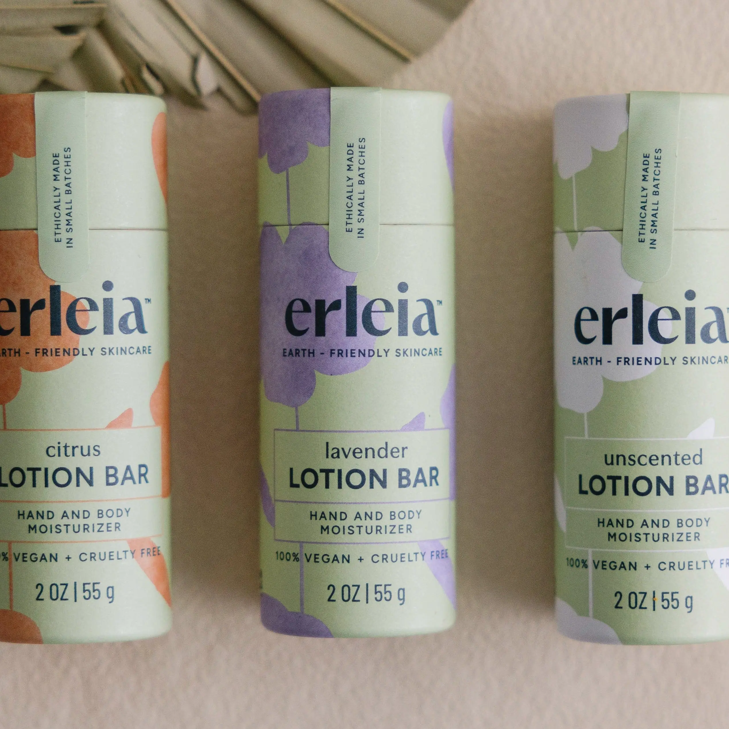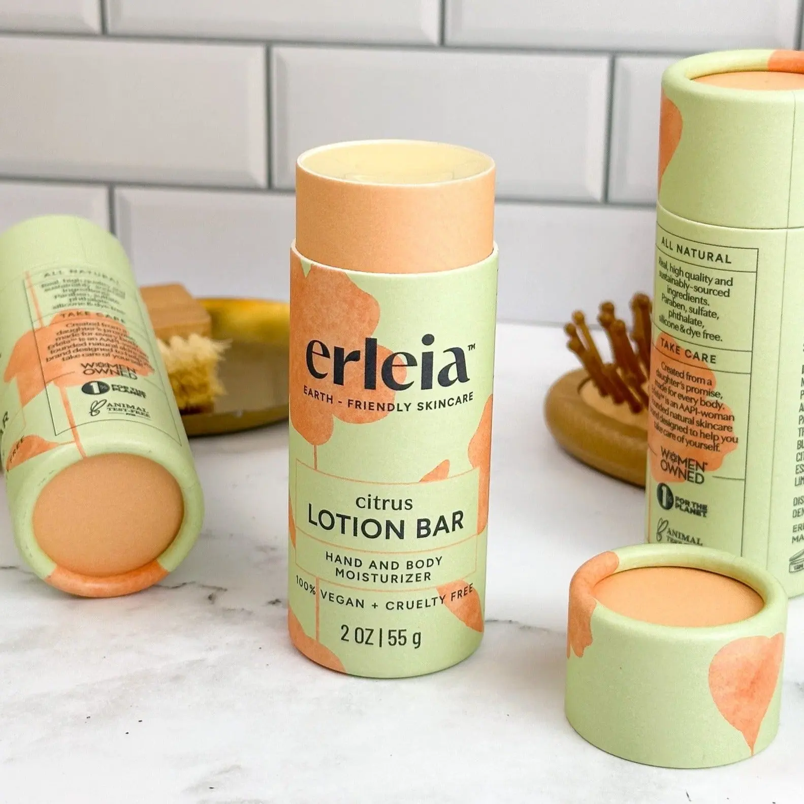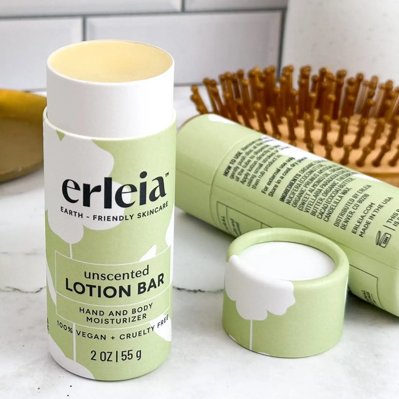 Our Lotion Bar comes in a sturdy, plastic-free push up paper tube. Gently press on the bottom disc to dispense product as needed.