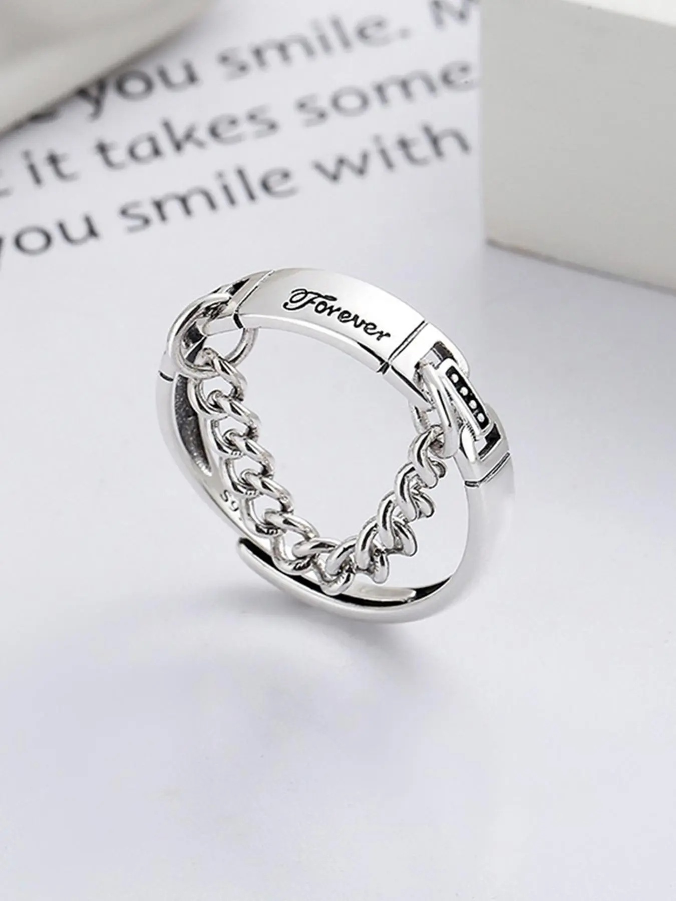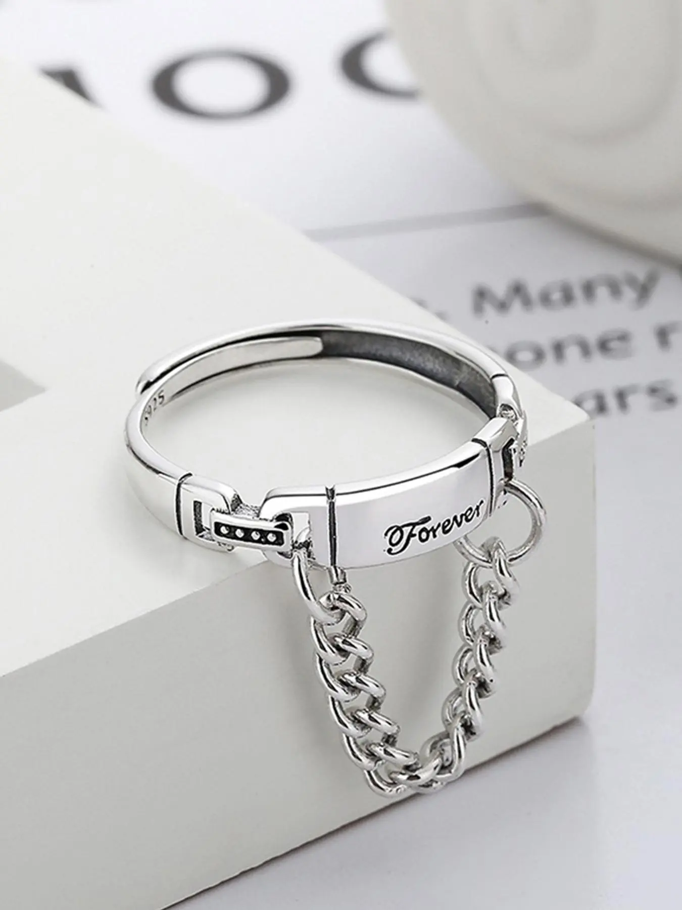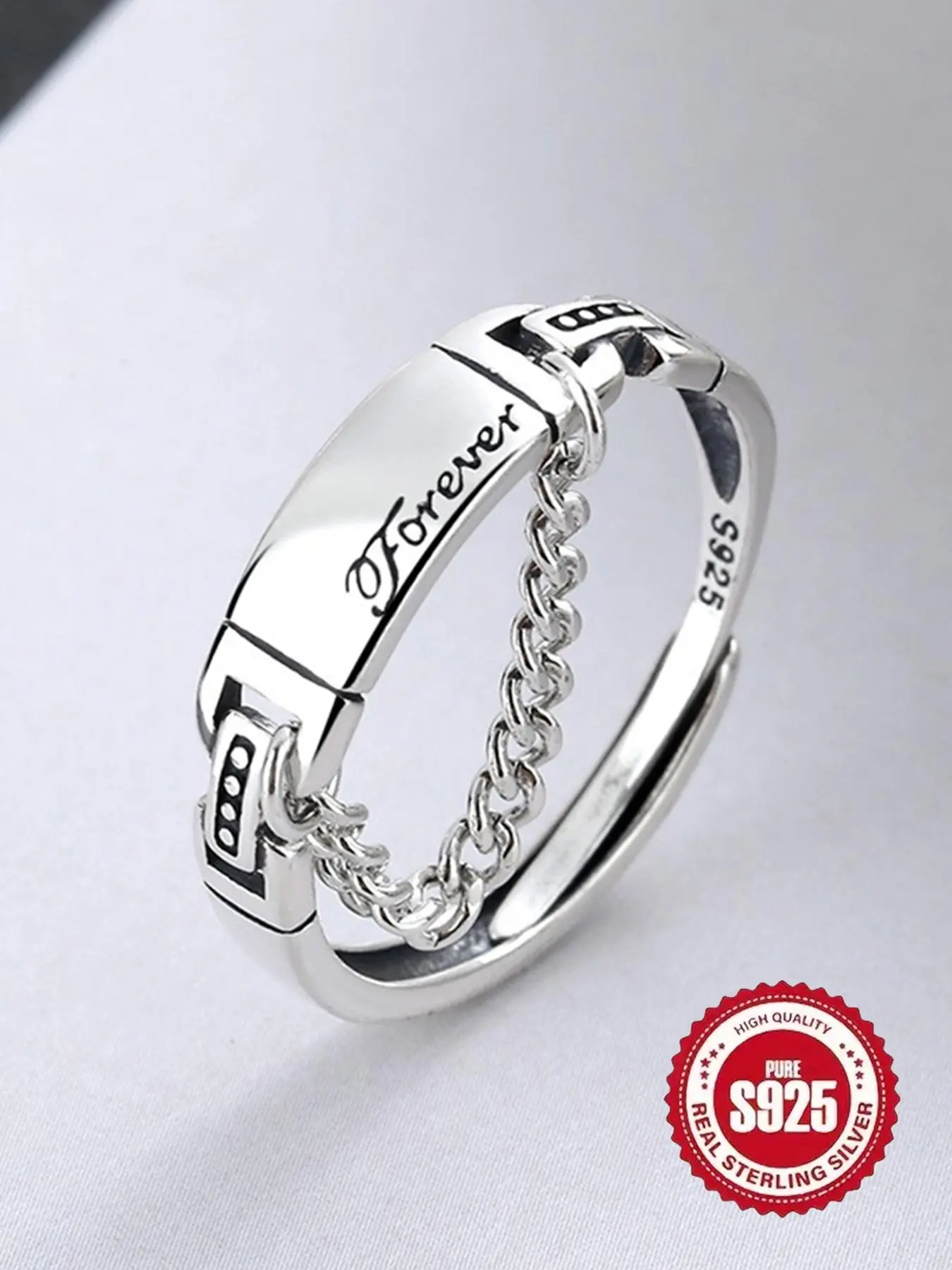 925 Sterling Silver Vintage Letter Design Engraved Ring, Adjustable Chain Design Ring for Women & Girls, Fashion Jewelry for Party, Daily Decor, Trendy All-match & Exquisite Jewelry for Birthday Gift, Valentine's Day, Gift