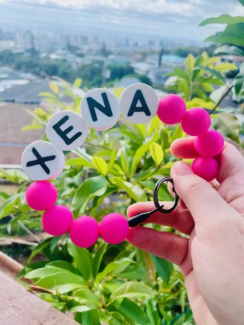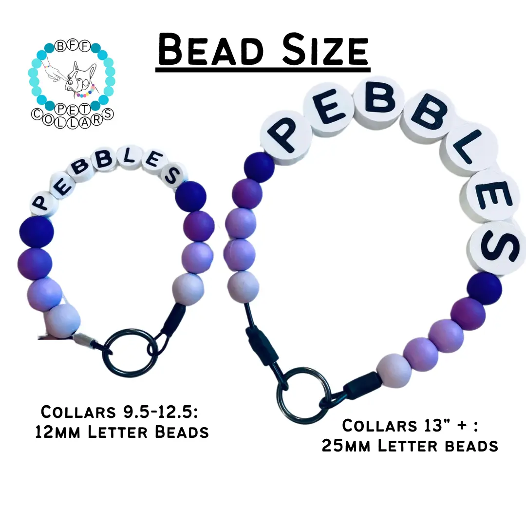 Made with 25mm Letters and 15mm silicone beads. PLA letters, silicone beads, and stainless steel make these collars water resistant, smell resistant, and easy to clean. Beads are strung on vinyl coated 304 Stainless Steel cable wire.